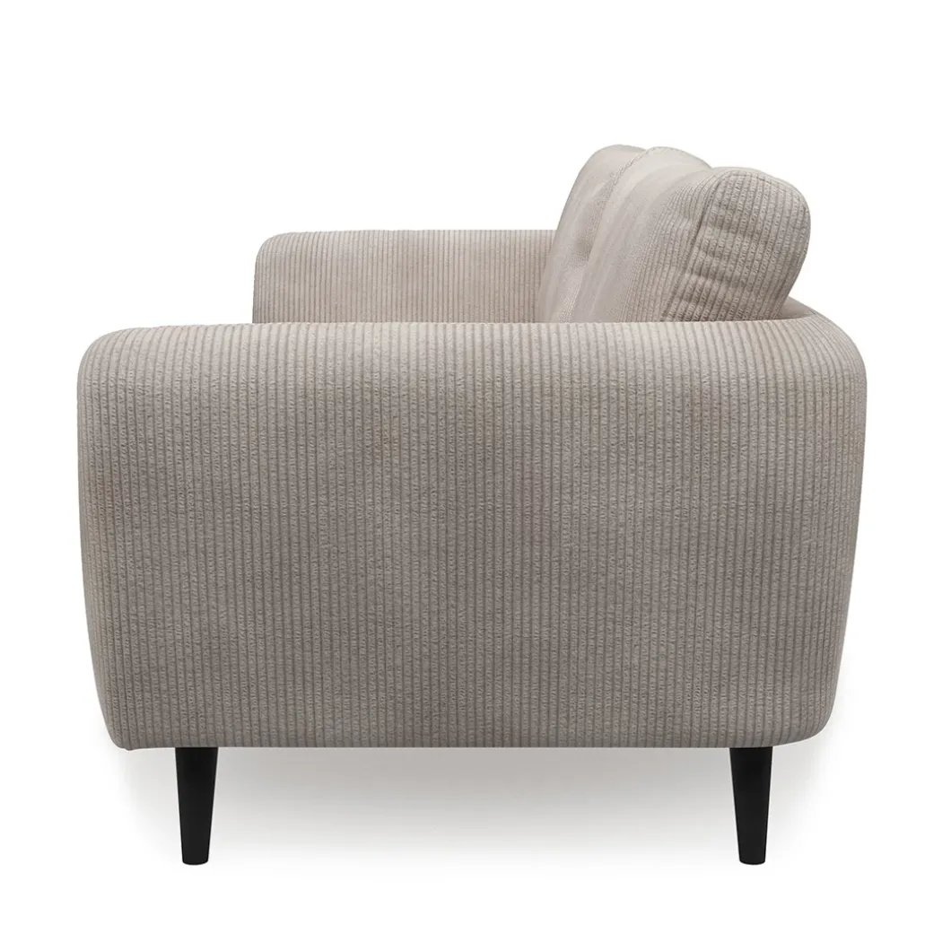 Voor een strak interieur is deze Sophia 3,5-zits bank een prachtig ontwerp. De armleuningen zijn licht naar buiten gebogen, waardoor er meer comfort is. De twee grote zitkussens zijn van hoge kwaliteit. De bekleding is van english rib in de kleur almond. Het frame van de bank is van beukenhout.