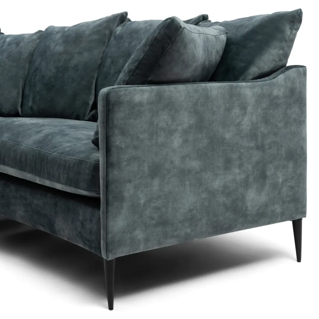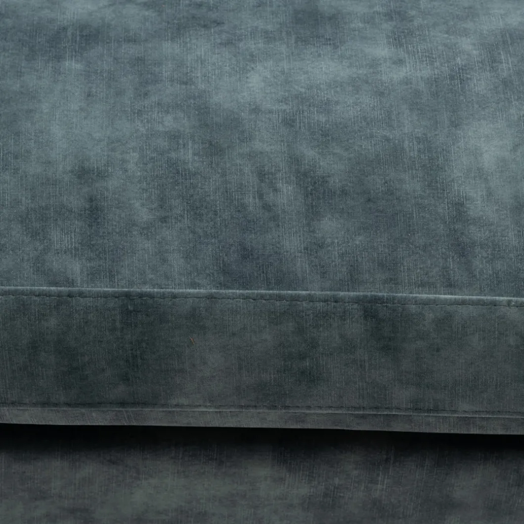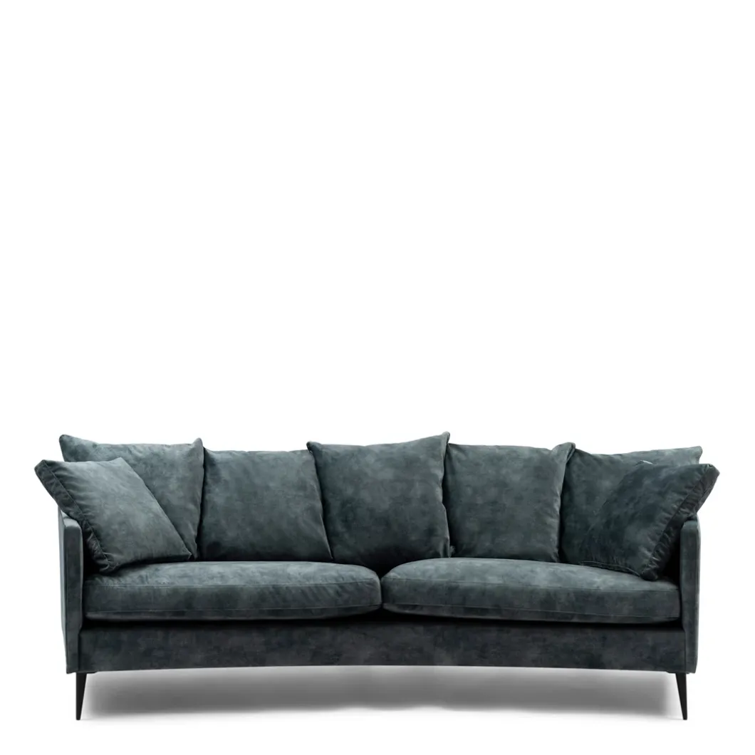 De ronde vormgeving van de Beverly bank geeft hem een speciale look. De bank zit geweldig, heeft lekkere rugkussens en een paar extra kussens om het comfort te verhogen. Het frame is van beukenhout, en de zwarte poten steken er mooi onderuit. De bank is er in één maat, deze is bekleed met velvet I stof, mineral blue van kleur.
