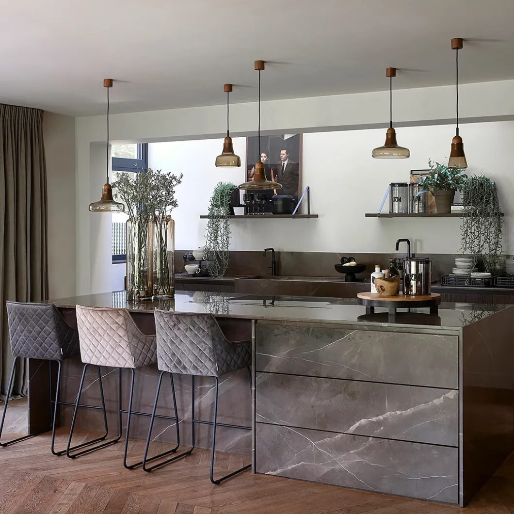 De Frisco Drive Counter Stool is een barkruk uitgevoerd in stevig velvet en verkrijgbaar in verschillende kleuren. De bekleding van de velvet barstoel heeft een doorgestikt ruitpatroon. De stoel heeft een verfijnd, donker ijzeren onderstel. Ook verkrijgbaar in andere materialen.