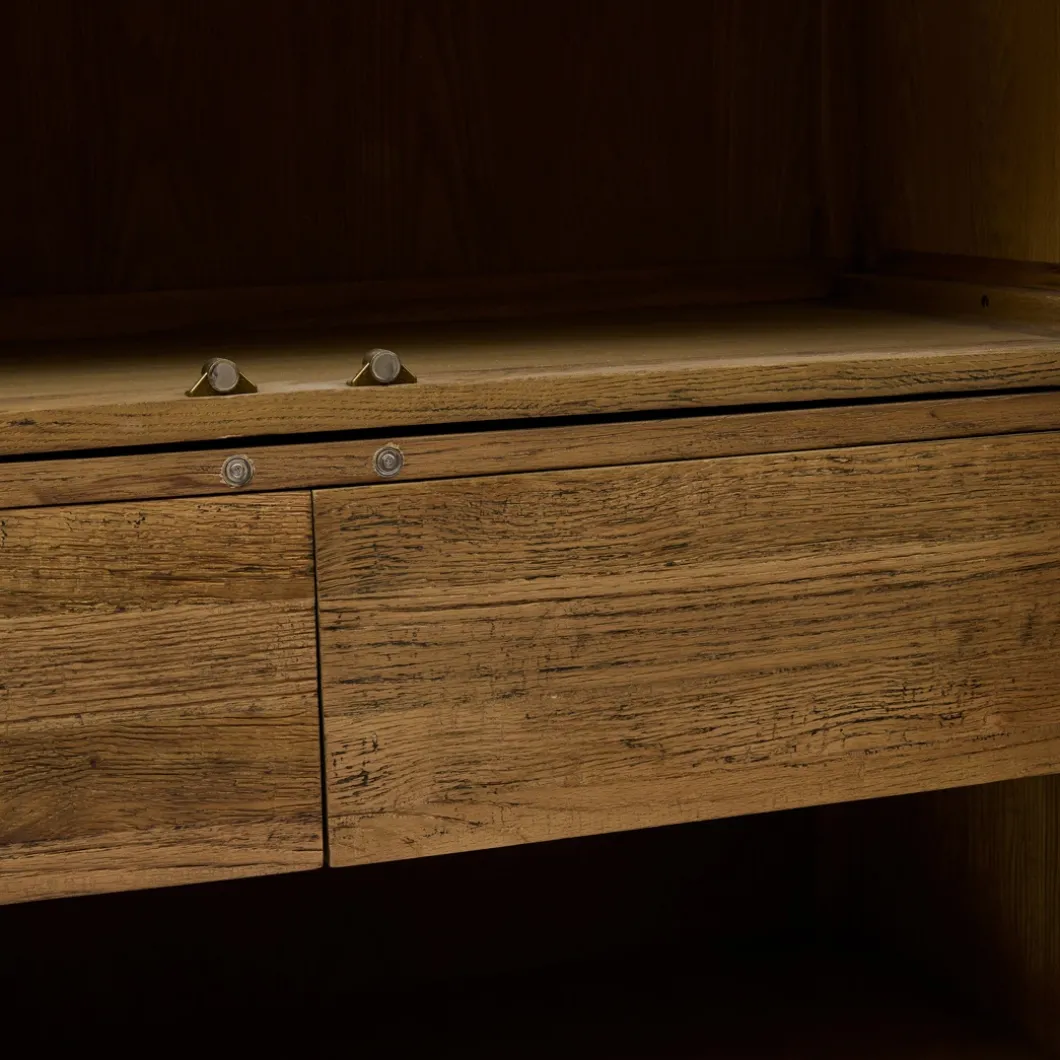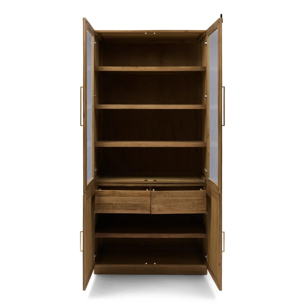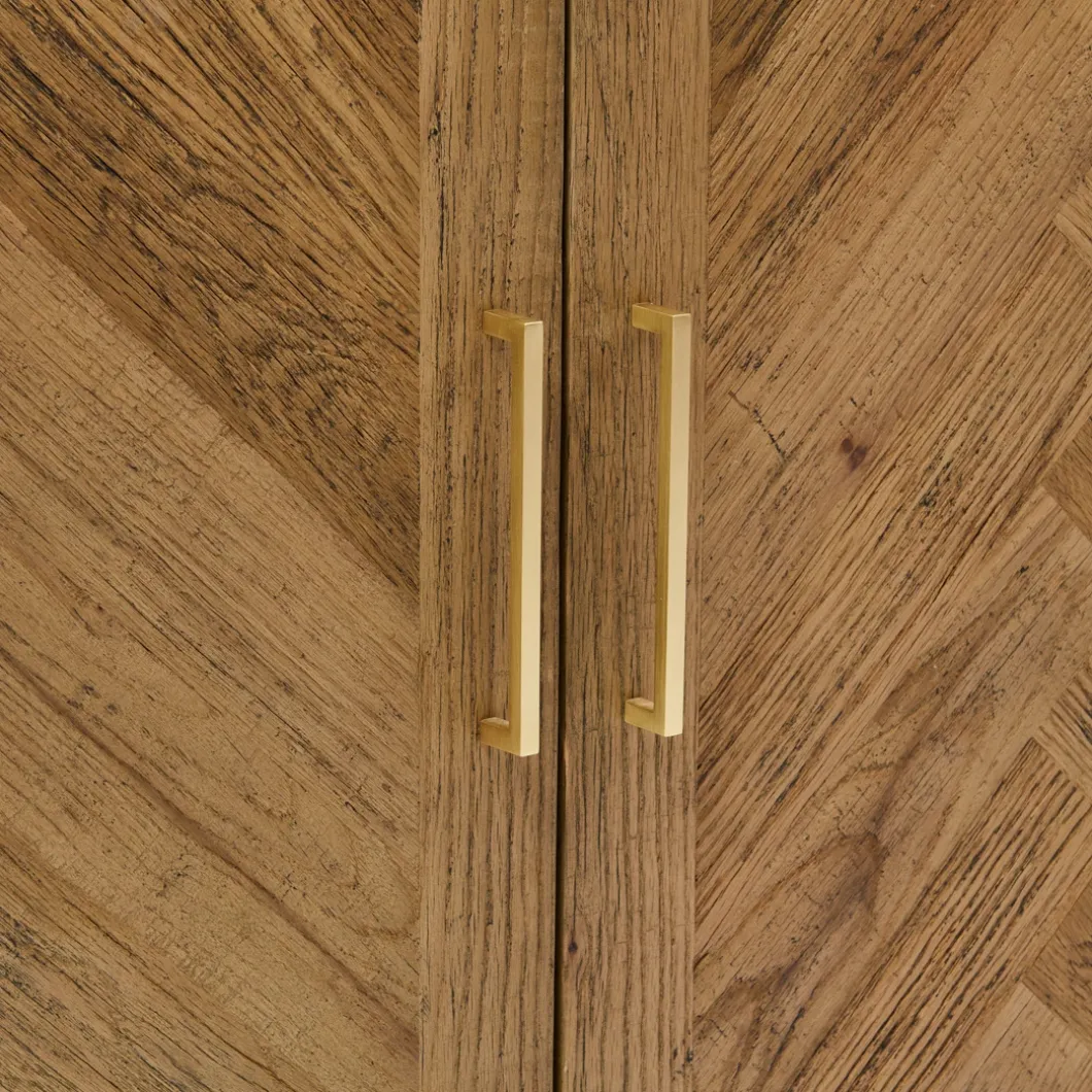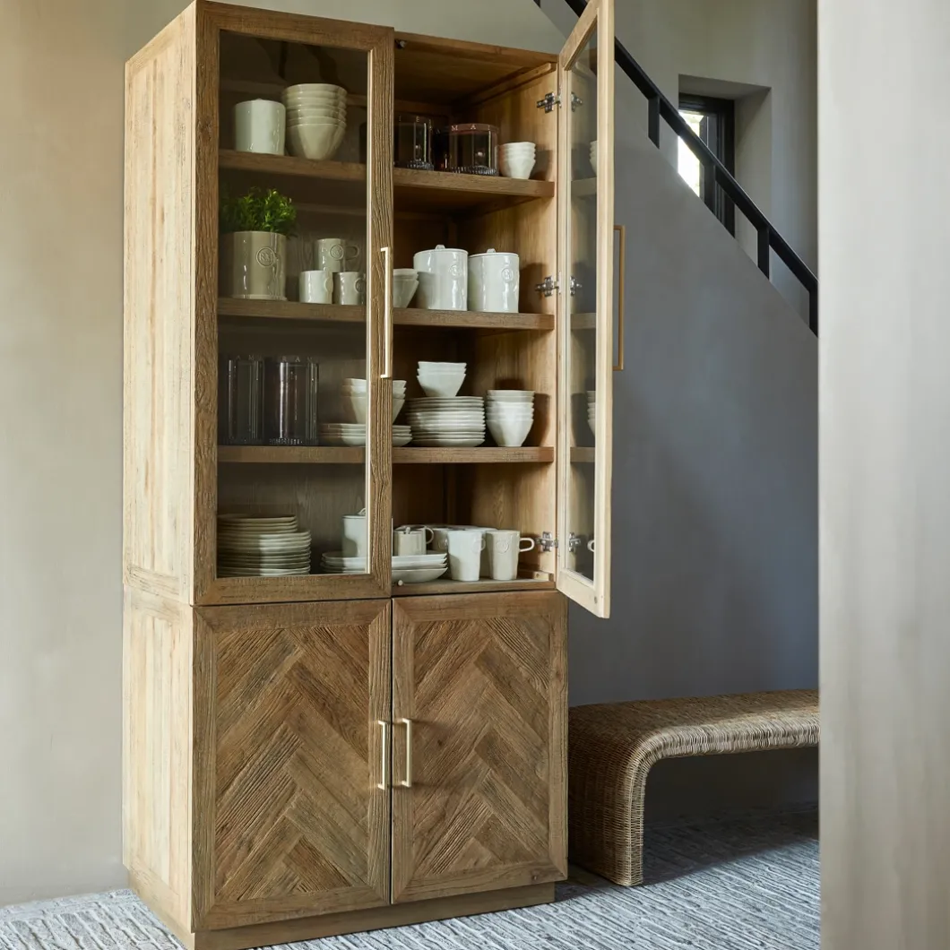 De Riverside buffetkast tilt jouw interieur naar een hoger niveau met zijn verfijnde design en hoogwaardige afwerking. Gouden handgrepen, twee glazen deuren en een prachtig vissengraatpatroon op de dichte deuren maken van deze kast een stijlvol statement. Met ruime planken en praktische lades biedt de kast volop opbergruimte zonder in te leveren op elegantie. Perfect om jouw favoriete accessoires of servies te tonen achter glas, terwijl je andere spullen netjes opbergt. Een tijdloos meubelstuk dat luxe en functionaliteit samenbrengt.