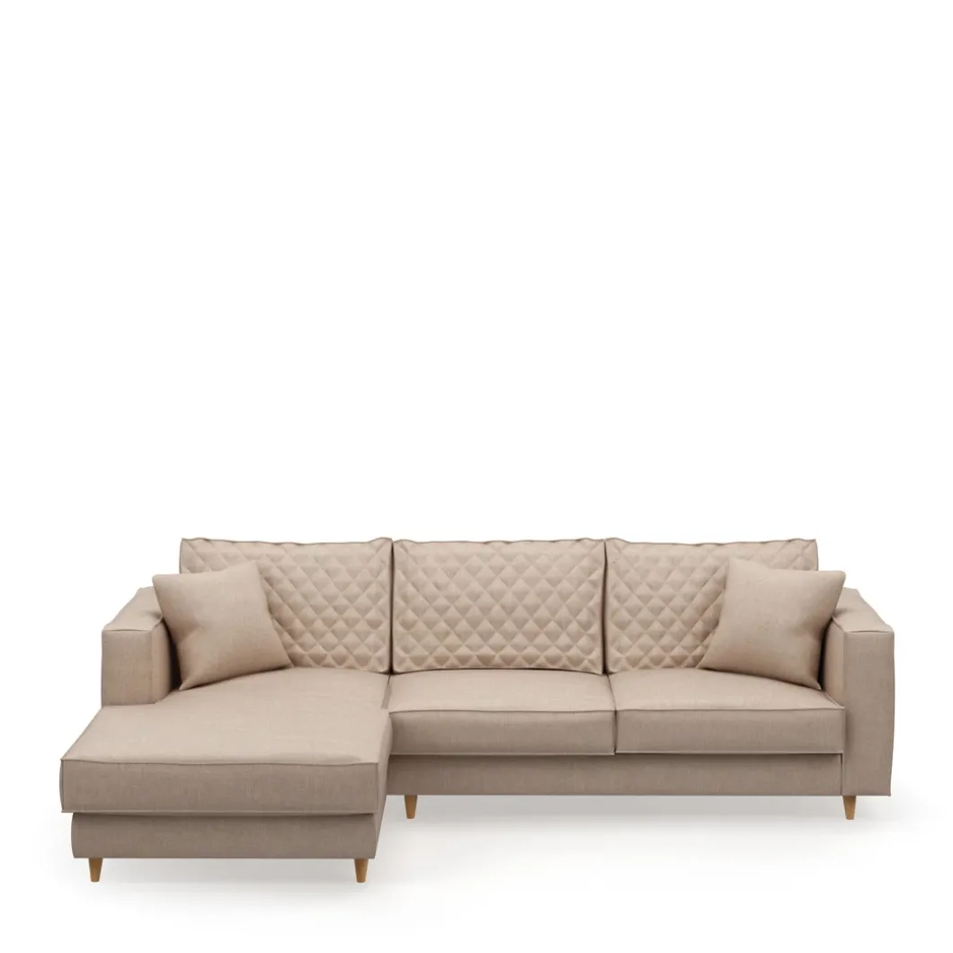 Deze royale bank heeft behalve een zitgedeelte ook een loungedeel in de vorm van een chaise longue (links). De bank maakt onderdeel uit van de Kendall-lijn, een serie met stoere, klassieke banken met een retro twist. De bank is ook verkrijgbaar in andere maten, uitvoeringen, stoffen en kleuren.