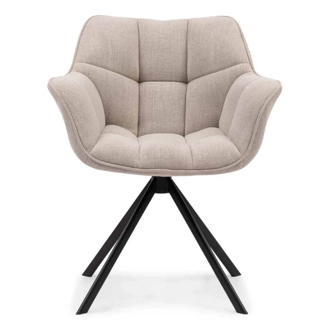 De bekende en comfortabele Carnaby Dining Armchair met industrieel onderstel is nu in een nieuwe variant beschikbaar: de draaibare versie. Deze versie kan 180° draaien. Sta je op uit de eetkamerstoel, dan draait de Carnaby stoel automatisch terug naar de beginpositie. Uitgevoerd in de stof mouline linen en in de kleur ‘Fabulous Flax’.