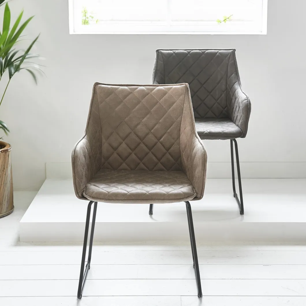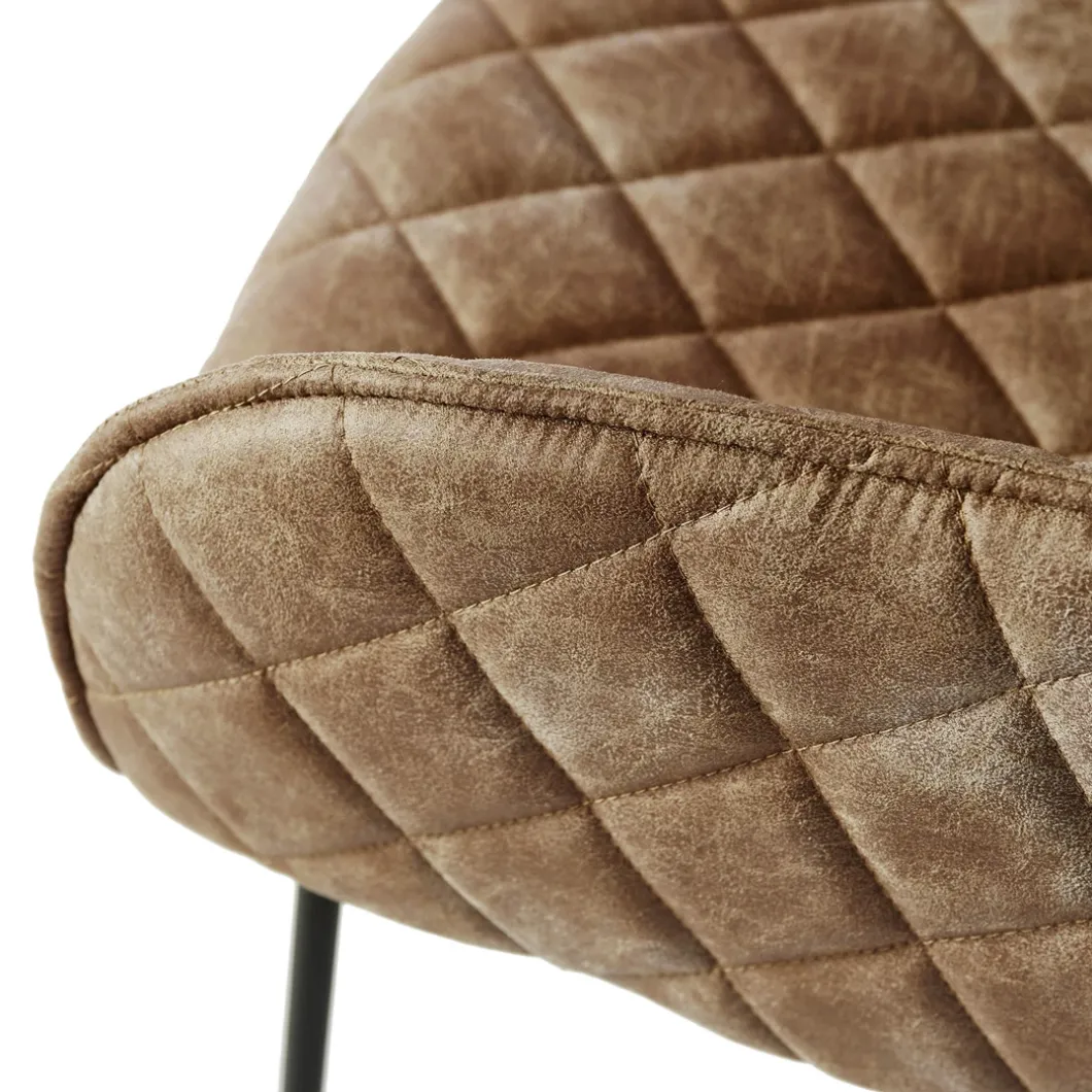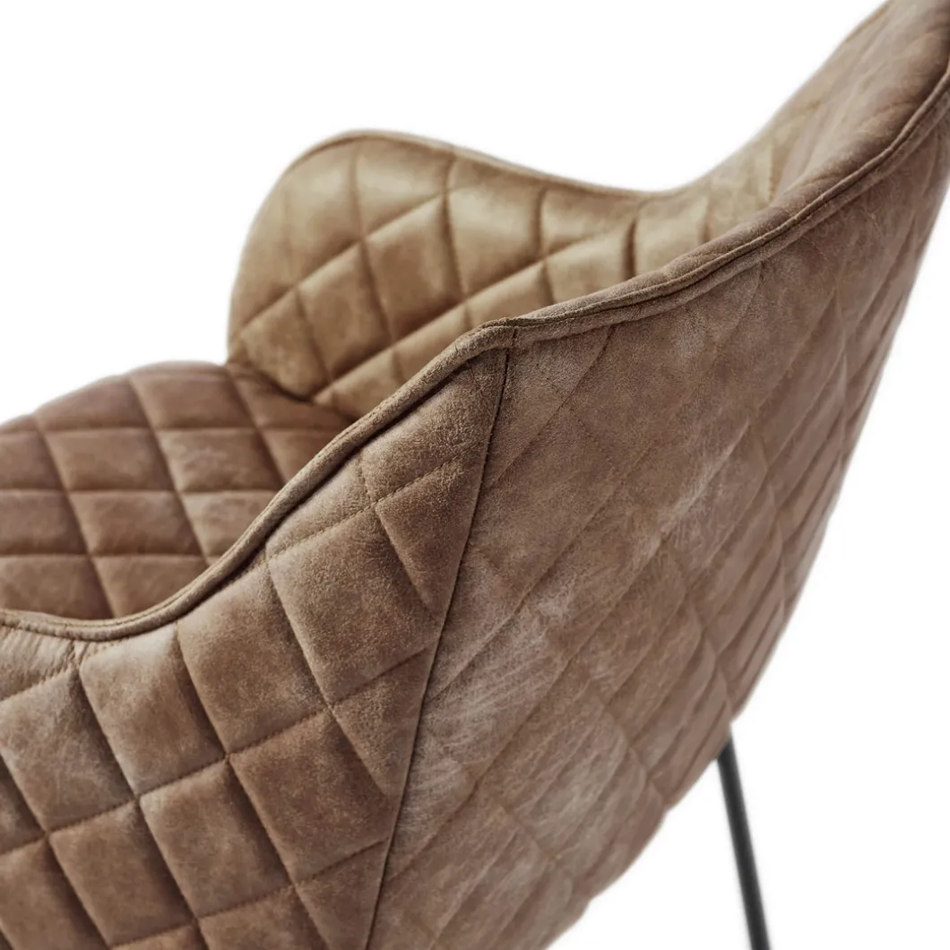 Deze eetkamerstoel is zowel klassiek als industrieel te noemen. Het ijzeren onderstel is verantwoordelijk voor de industriële look, al zijn de ijzeren poten subtiel vormgegeven. De kuipstoel is bekleed met pellini leer en de hele stoel is doorgestikt, waardoor over de hele stoel minuscule kussentjes in een ruitjespatroon lijken te liggen.