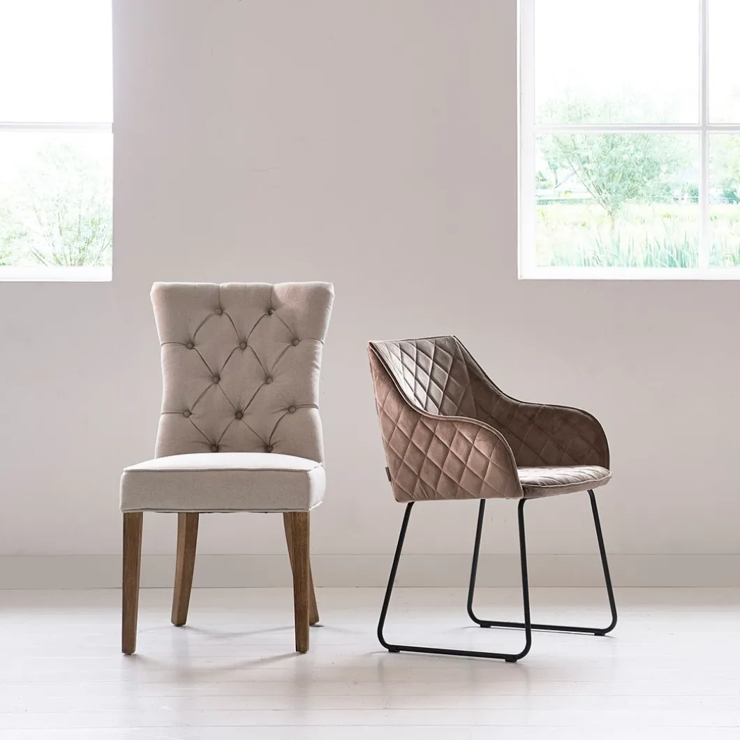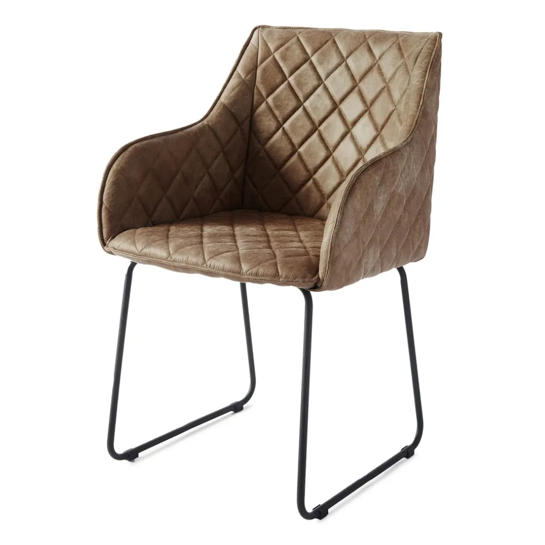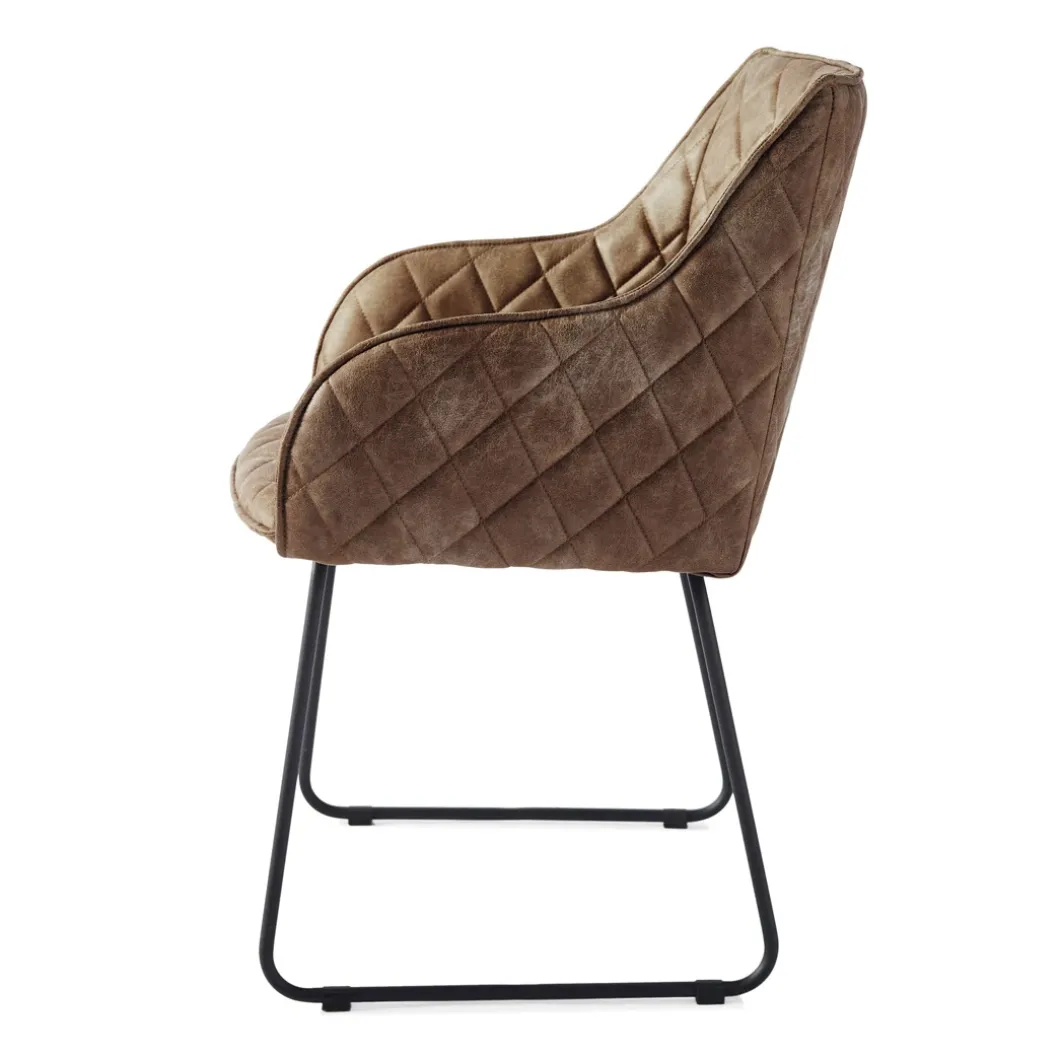 Deze eetkamerstoel is zowel klassiek als industrieel te noemen. Het ijzeren onderstel is verantwoordelijk voor de industriële look, al zijn de ijzeren poten subtiel vormgegeven. De kuipstoel is bekleed met pellini leer en de hele stoel is doorgestikt, waardoor over de hele stoel minuscule kussentjes in een ruitjespatroon lijken te liggen.