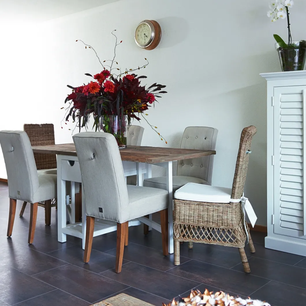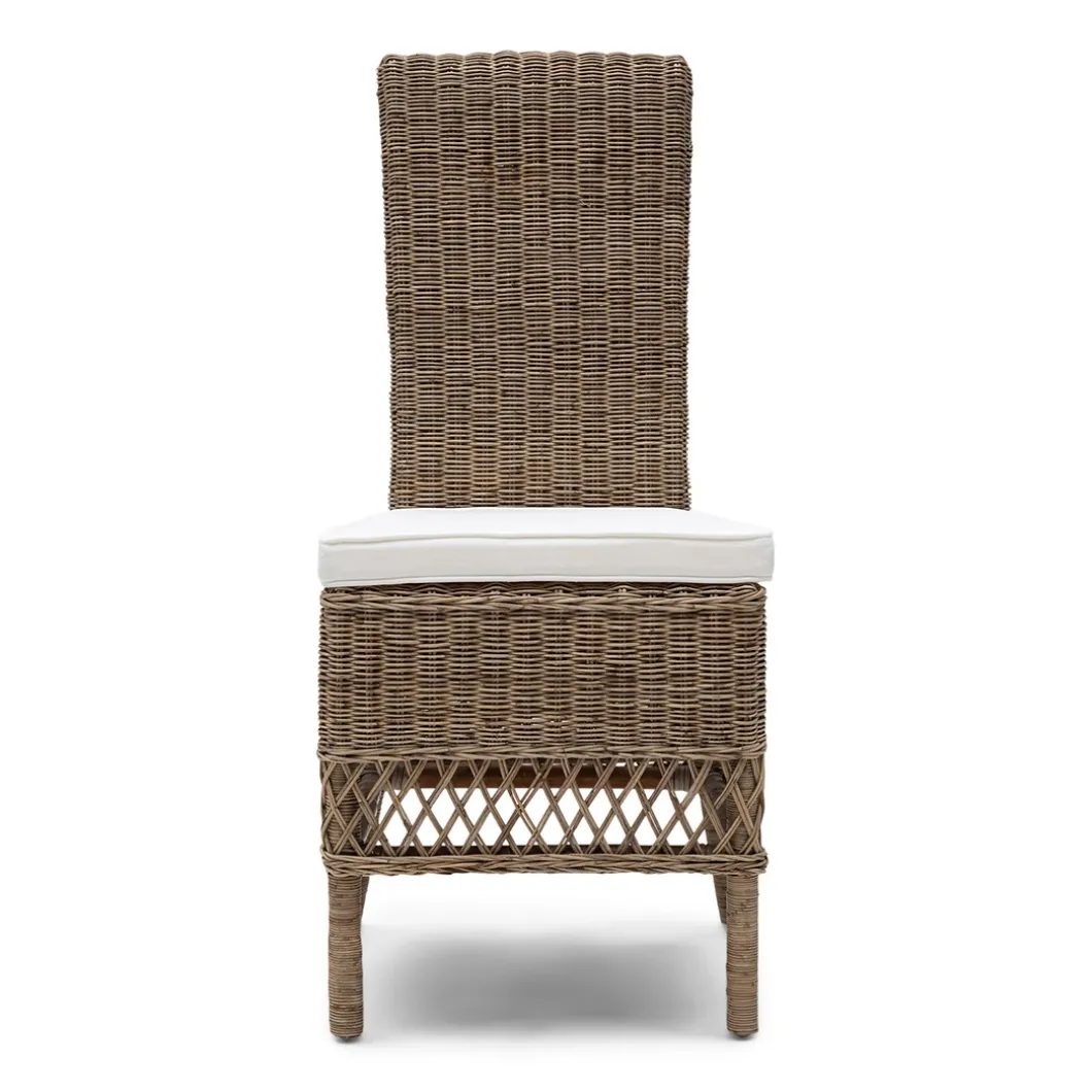 Een handgevlochten dinerstoel gemaakt van natuurlijk materiaal, de natuurlijke bruine kleur wordt gecreëerd door een natuurlijk proces hierdoor kan kleur per levering licht verschillen waardoor ieder meubel uniek is. Het zitkussen is gemaakt van 100% katoen.