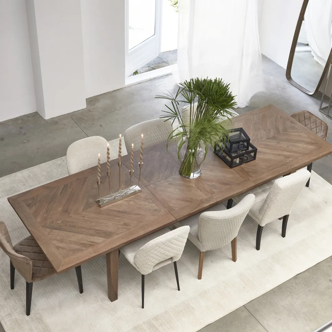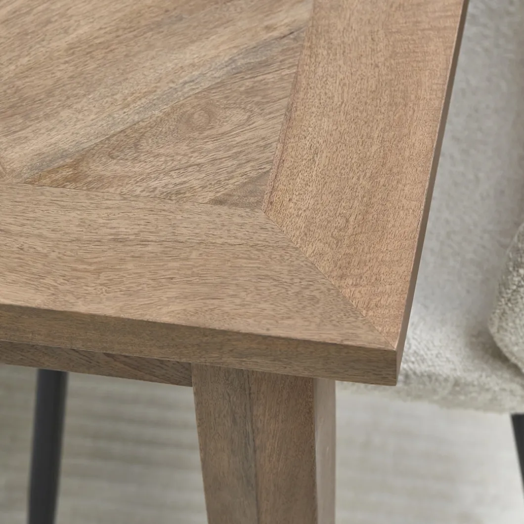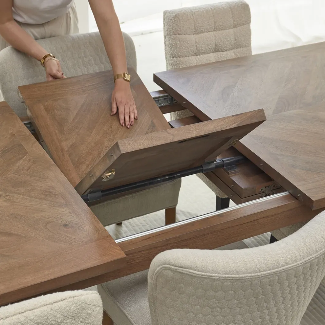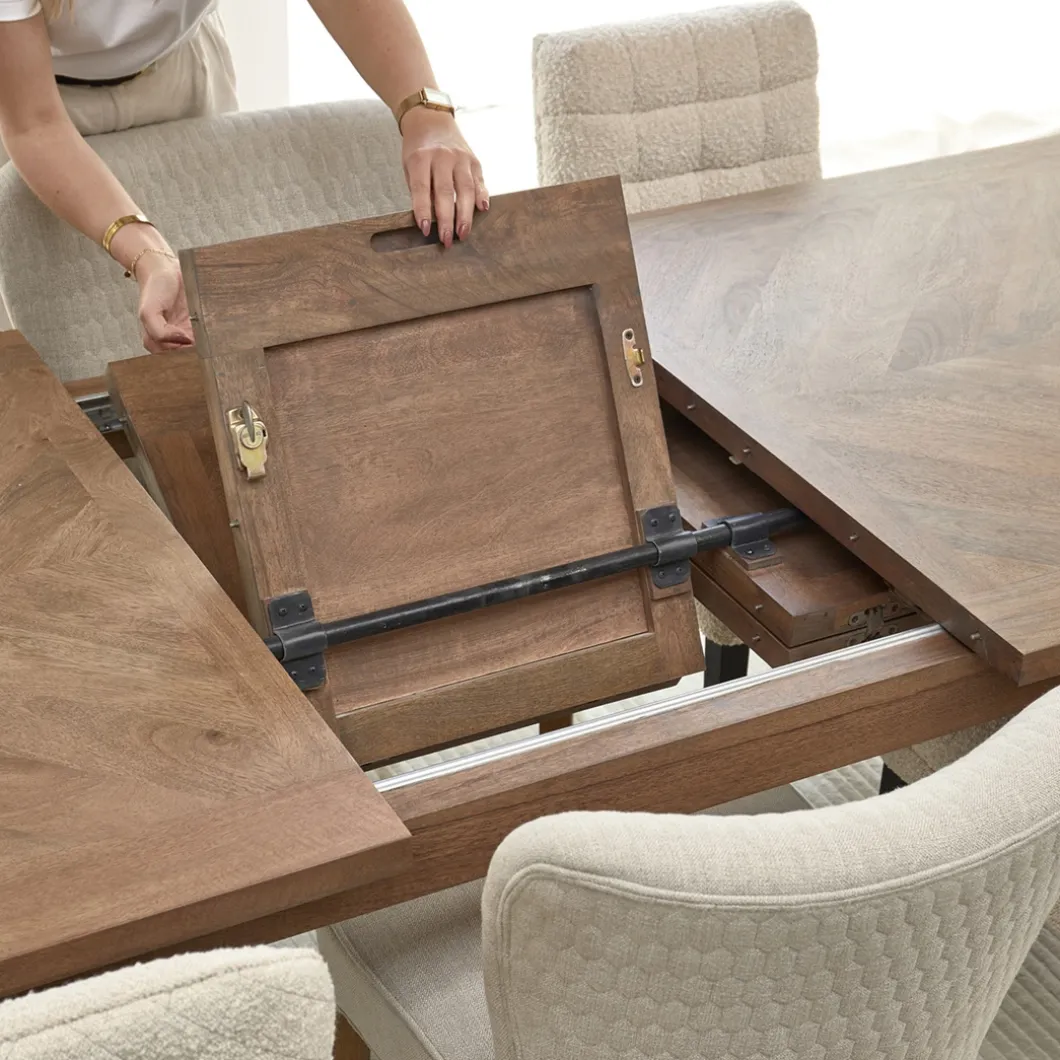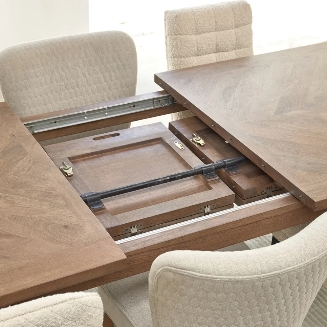 Deze Bodie Hill eettafel is mooi én lekker veelzijdig. Want door het middendeel open te schuiven kun je eenvoudig een extra deel aan je tafel toevoegen. Zo ontstaat er een nog royalere tafel van meer dan drie meter. De tafel is gemaakt van mangohout, waarbij het blad een prachtig Hongaarse punt-motief heeft.