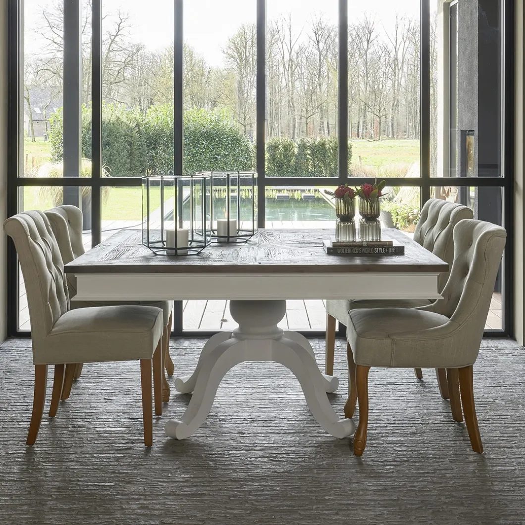 Het bovenblad van deze tafel is geïnspireerd op antieke kasteelvloeren. De kleinste maat tafel is handig voor een ‘just the two of us’ hoekje. Twee naast elkaar geeft een mooie eettafel. Verkrijgbaar in diverse maten: 70x70x76 cm, 100x100x78 cm, 150x150x78 cm.