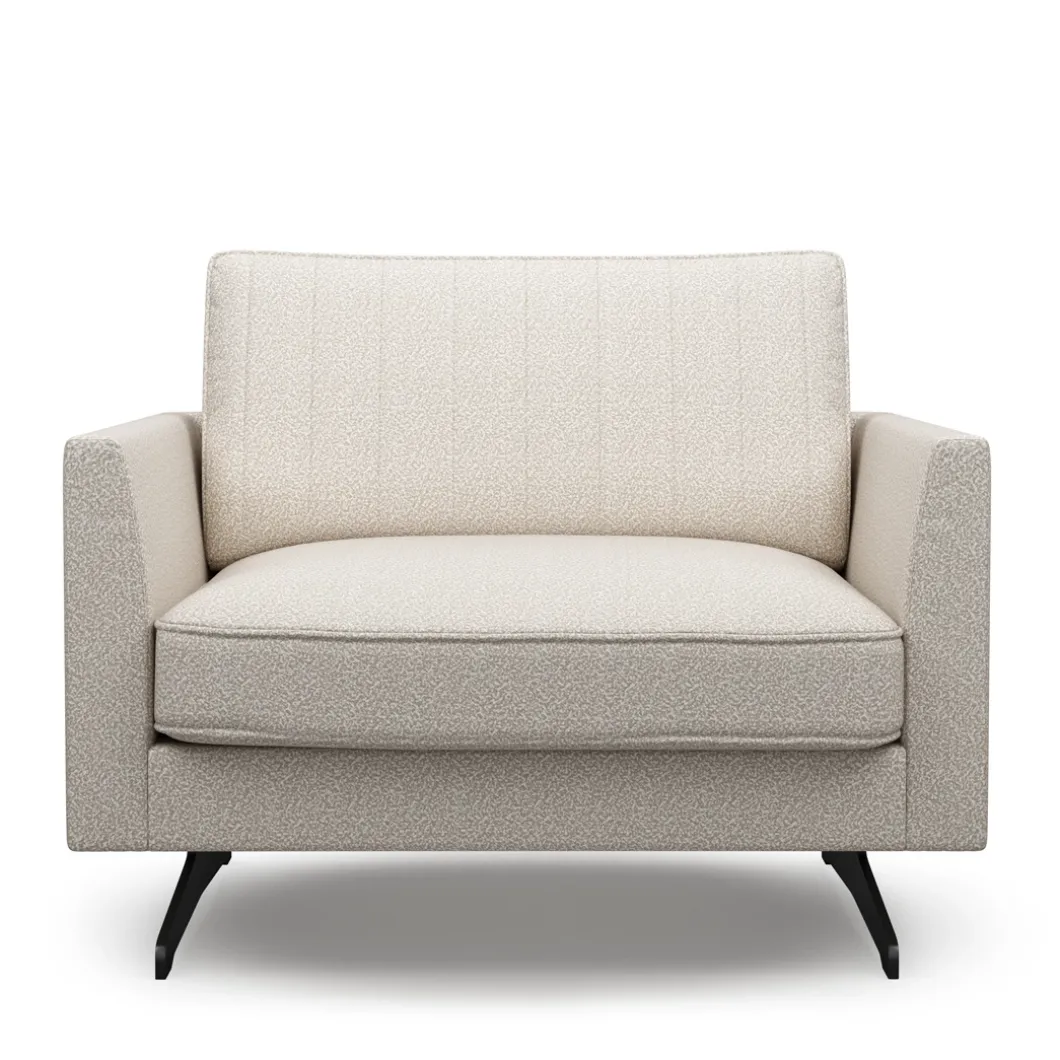 The Camille-stoel met armleuningen is een heerlijk comfortabele stoel voor in de zitkamer. Het draaibare rugkussen, met een egale zijde en een zijde met verticale stiksels, maakt het een bijzondere stoel die naar ieders smaak aan te passen is. De Camille is verkrijgbaar in verschillende kleuren en stofferingen.