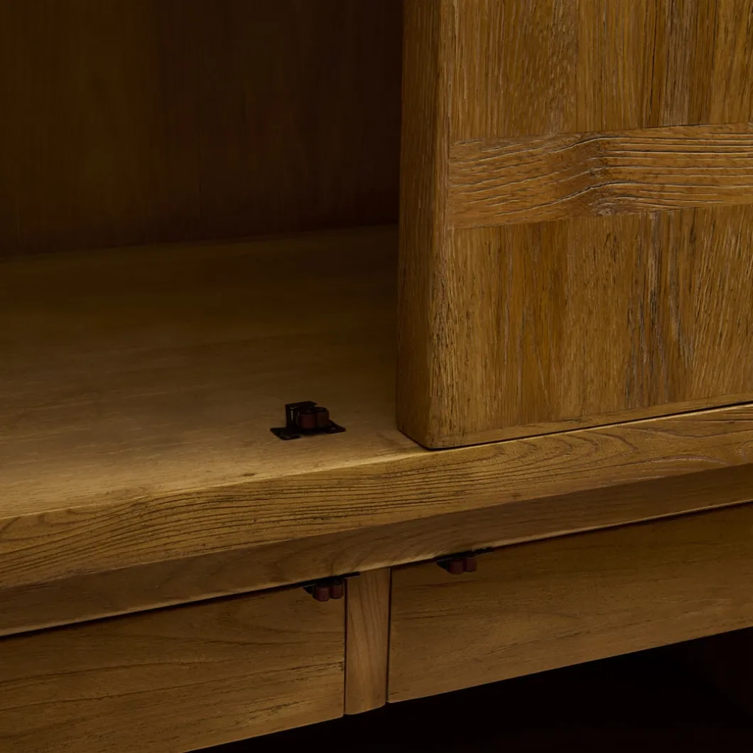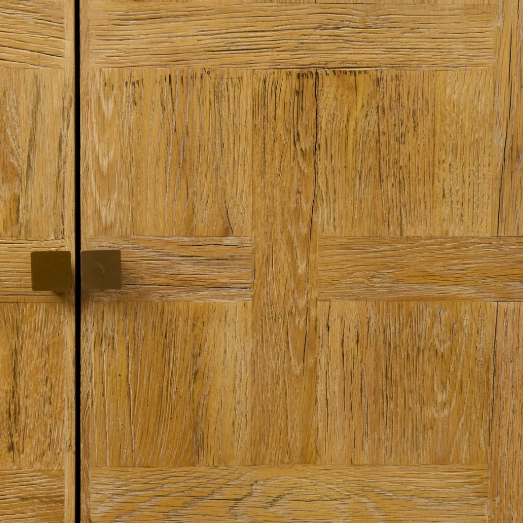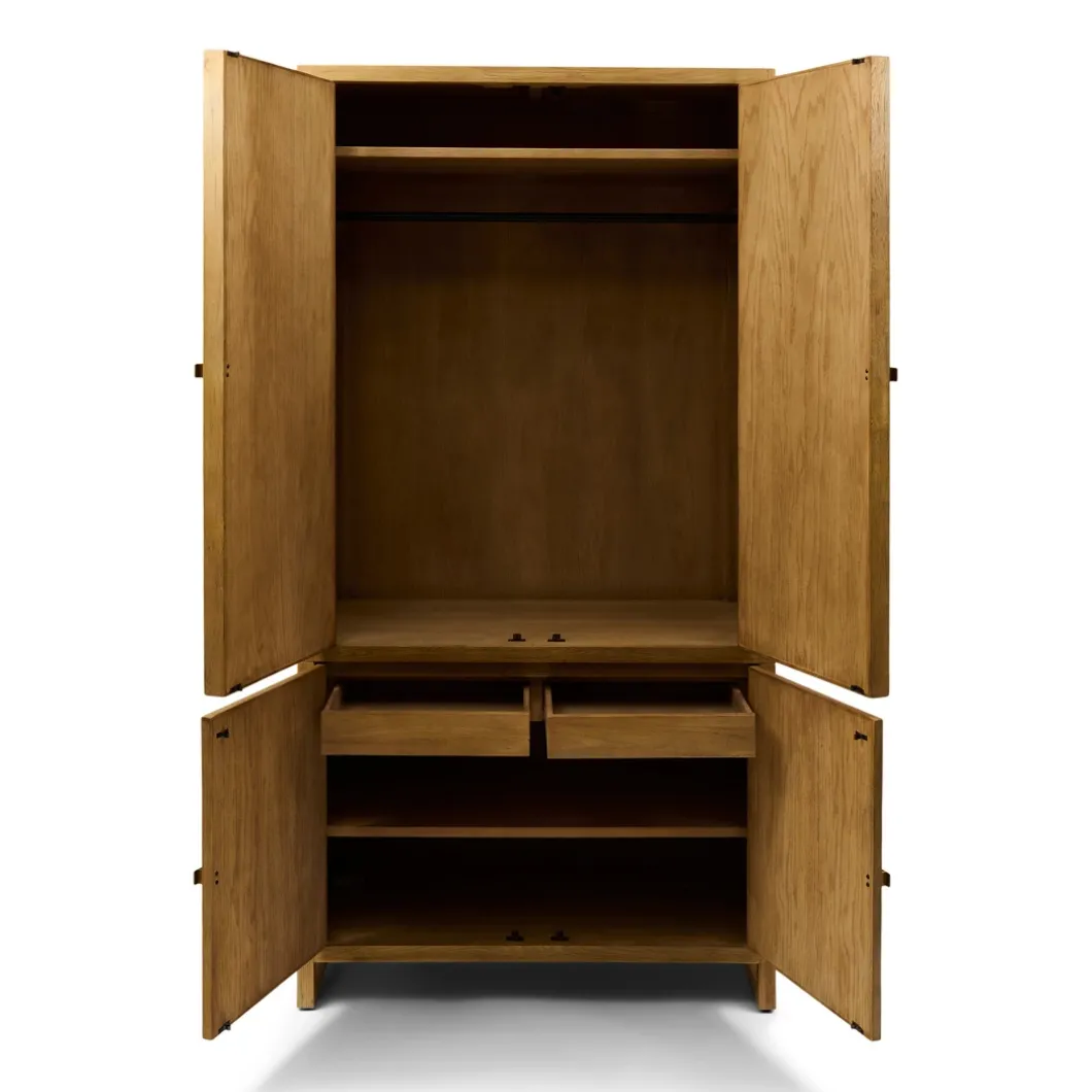 Ontdek de tijdloze schoonheid van de Fraser Island kledingkast, die natuurlijke elegantie combineert met praktische opbergruimte. Gemaakt van teruggewonnen eikenhout, benadrukken de zichtbare houtnerven de robuuste en warme uitstraling van deze kast. Met vier deuren, twee lades, een hanggedeelte over de volledige breedte en planken biedt de kast volop ruimte voor je kleding en accessoires. Dankzij de slimme indeling houdt de Fraser Island kledingkast je slaapkamer georganiseerd en stijlvol. Met afmetingen van 230 cm hoog, 110 cm breed en 60 cm diep is het een perfecte keuze voor een luxe uitstraling en ultiem gemak in je interieur.