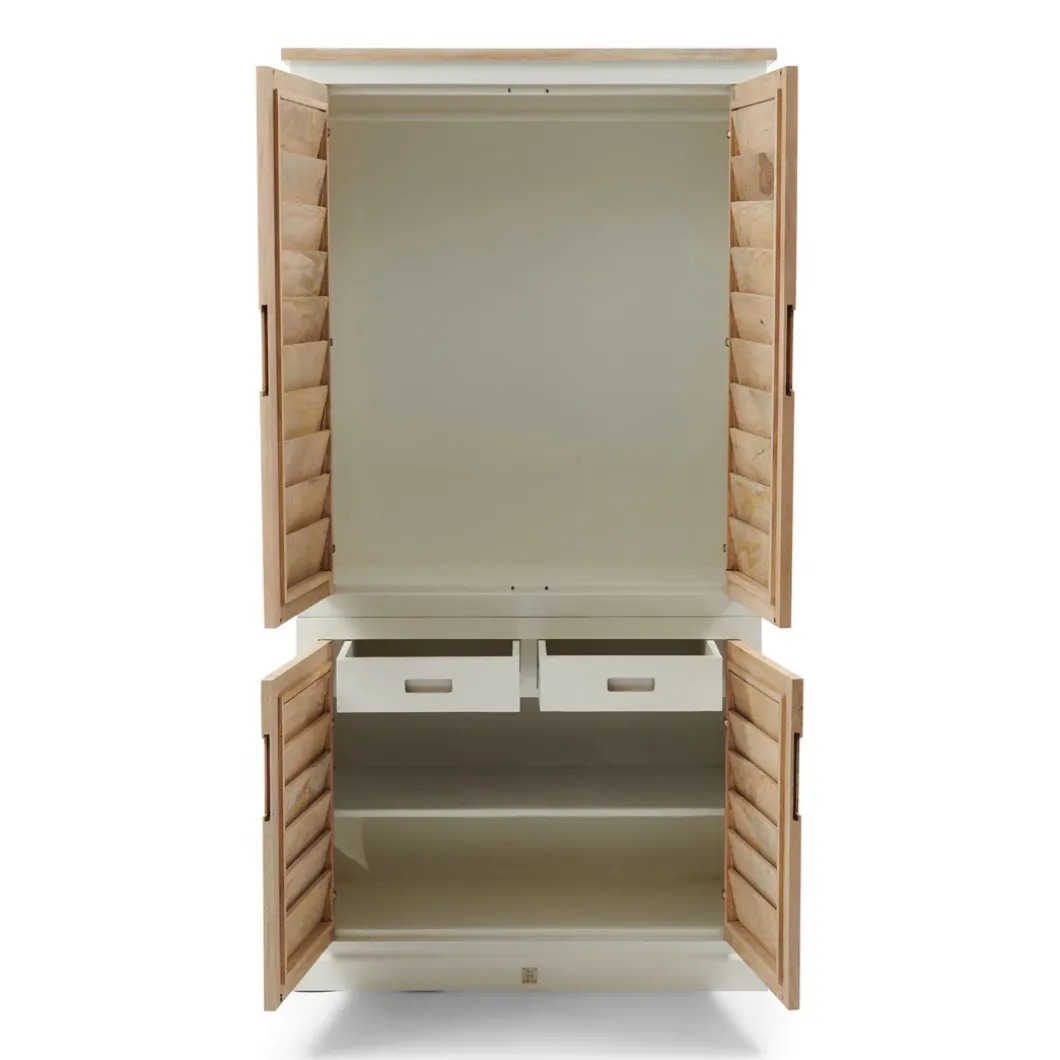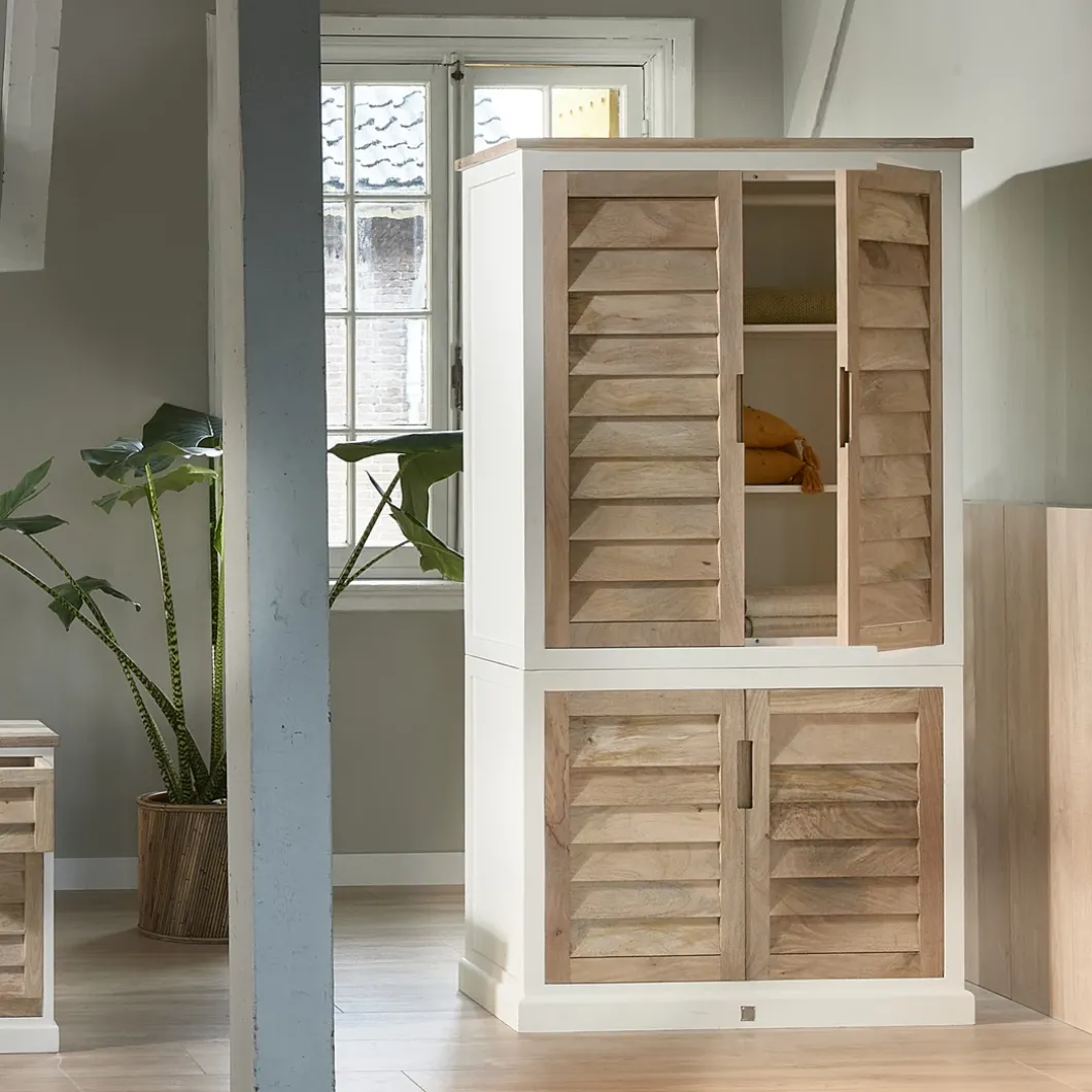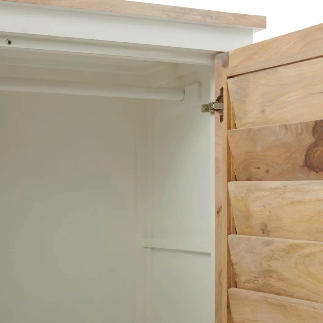 Dit is de kledingkast uit de Pacifica-serie, een lijn met opvallend mooie meubels in wit geverfd hout en naturel mangohout. Het mooie aan deze garderobekast is dat hij, behalve ruimte om kleding liggend op te bergen, ook een ruim hanggedeelte heeft. Ook bij deze kast sluiten de deuren met een soepele softclose-techniek. In deze serie zijn verschillende meubels verkrijgbaar.