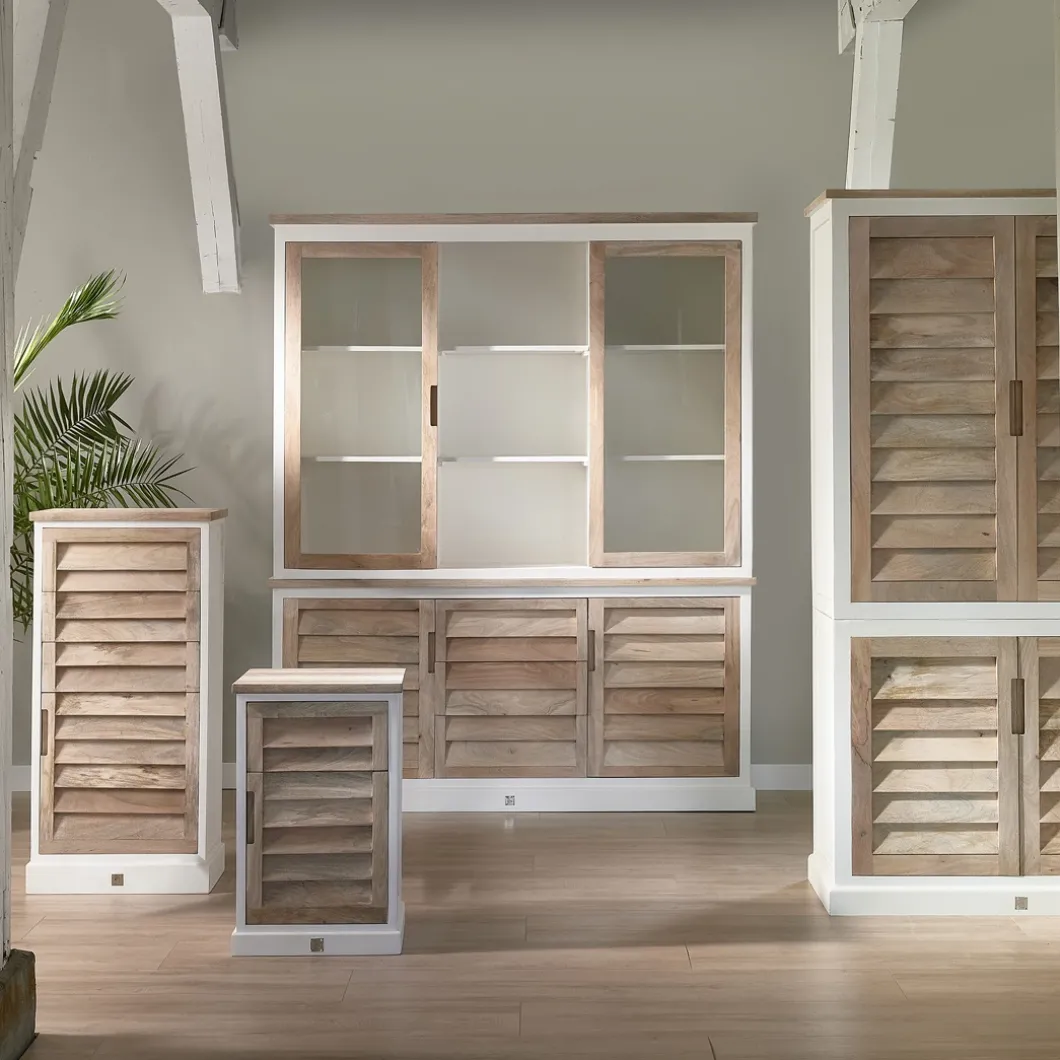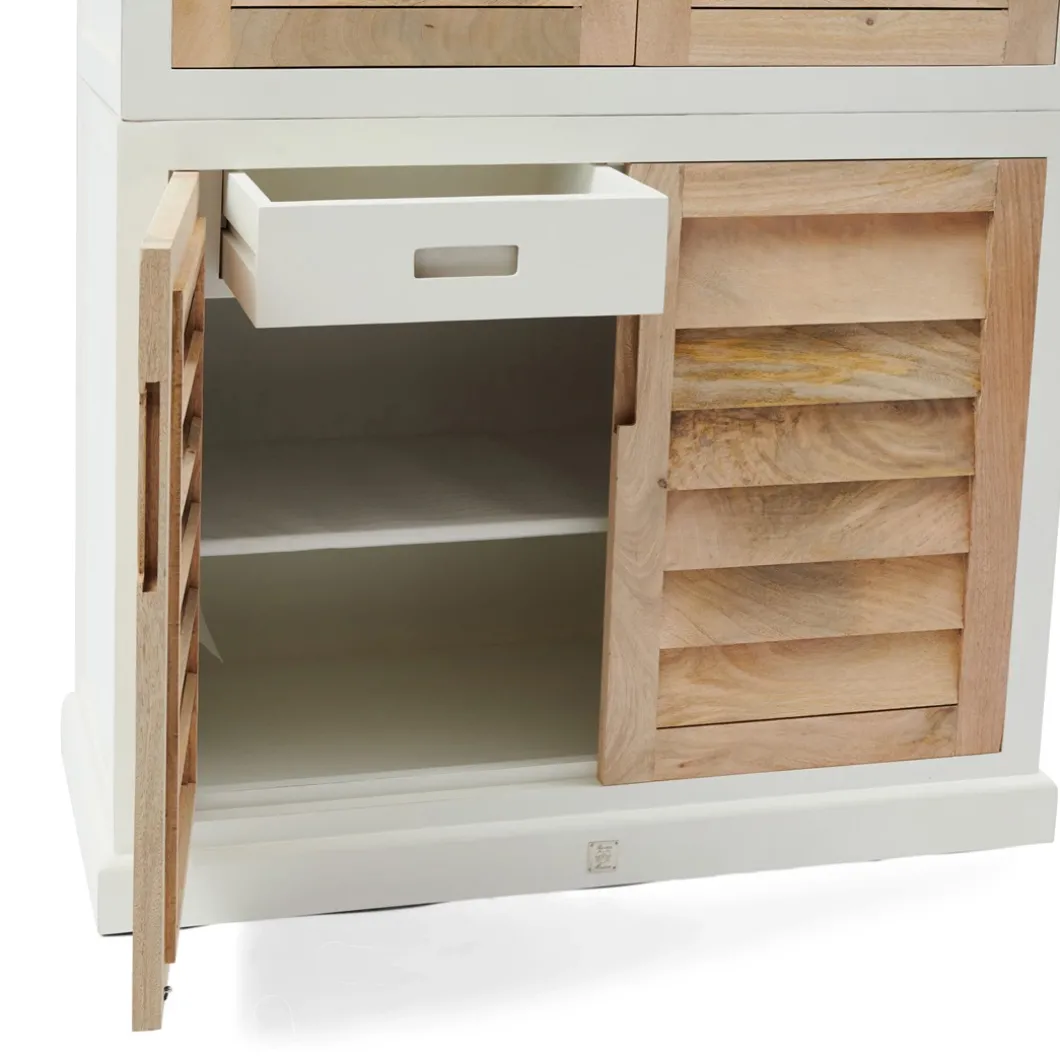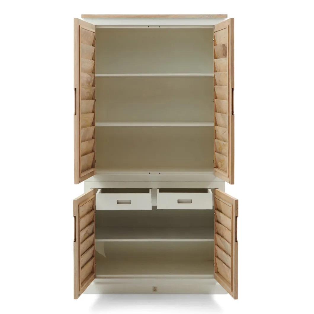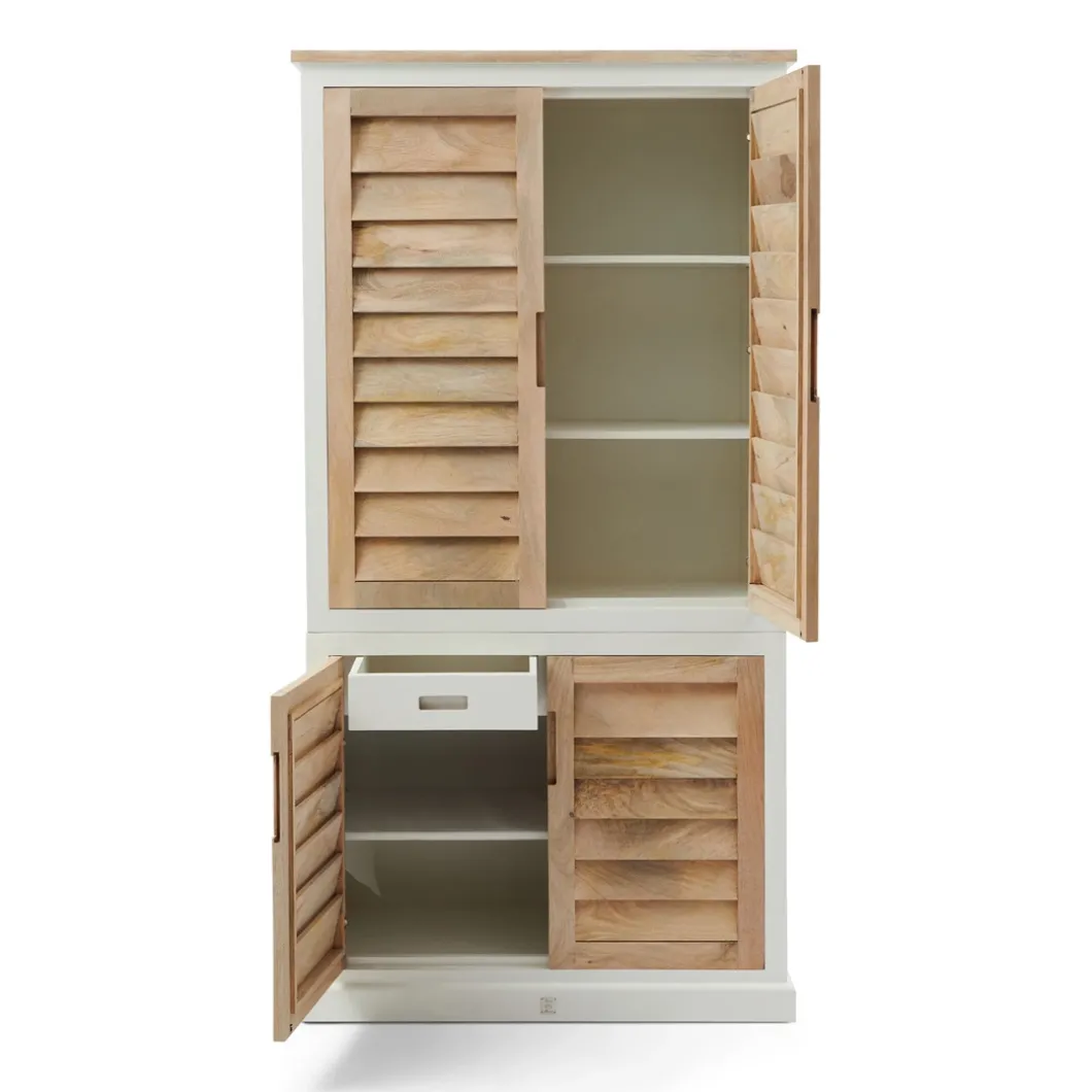 Dit is de kledingkast uit de Pacifica-serie, een lijn met opvallend mooie meubels in wit geverfd hout en naturel mangohout. Het mooie aan deze garderobekast is dat hij, behalve ruimte om kleding liggend op te bergen, ook een ruim hanggedeelte heeft. Ook bij deze kast sluiten de deuren met een soepele softclose-techniek. In deze serie zijn verschillende meubels verkrijgbaar.