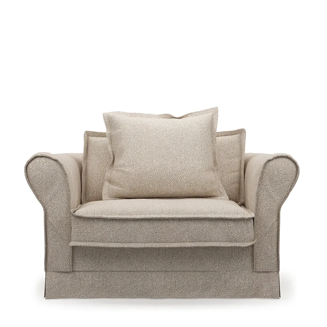 Wat is de loveseat toch een heerlijk meubel. Allerlei love-varianten kunnen erop plaatsnemen. Samen iets bekijken in een tijdschrift of op de tablet, kleine mensjes voorlezen, knus relaxen… Het kan allemaal in de loveseat. Deze loveseat in beige bouclé stoffering voelt heerlijk zacht. Het onderstel is gemaakt van beukenhout.