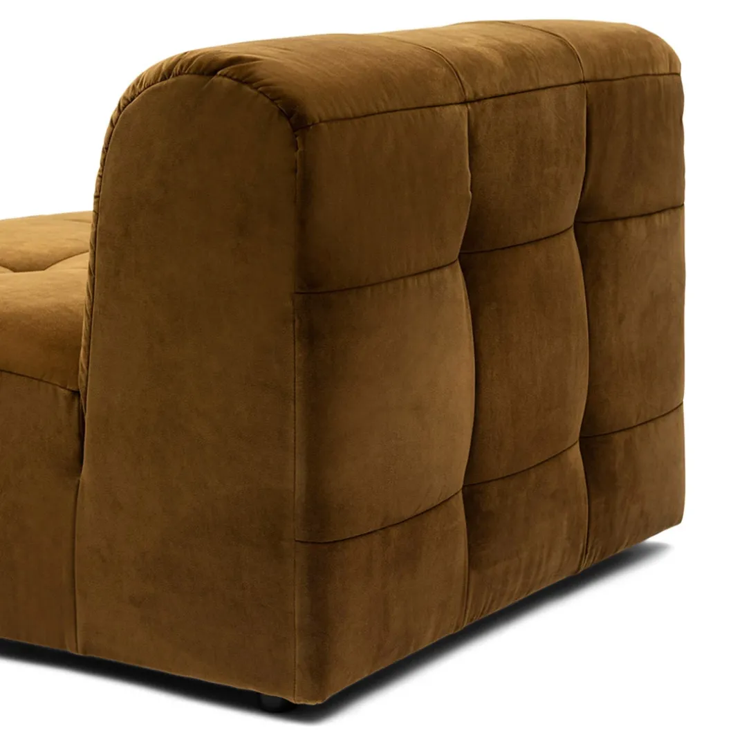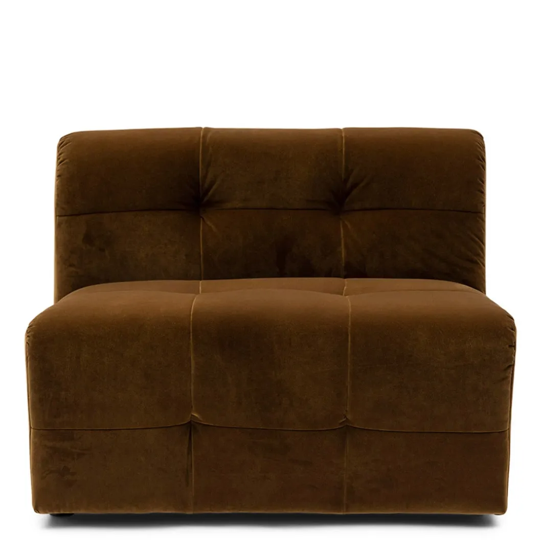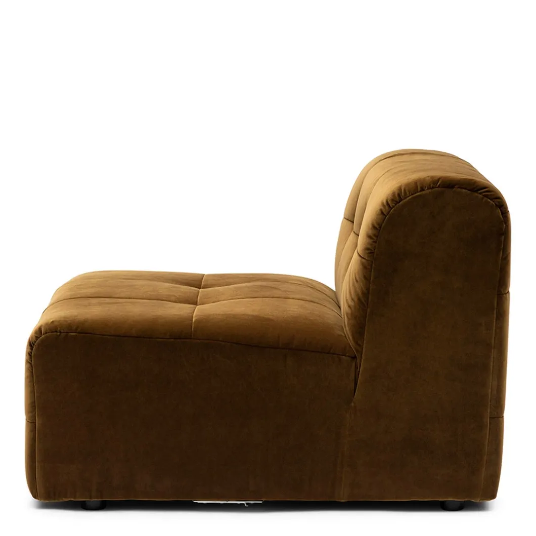 Dit is het middendeel van de zelf samen te stellen, modulaire bank The Jones. Een heerlijke, lage bank, met opvallende bekleding met capitonnering zonder knoop. Dit middendeel heeft alleen een rugleuning, dit maakt hem ook zeer geschikt om als los element, als een soort van loveseat, in de ruimte te plaatsen.
