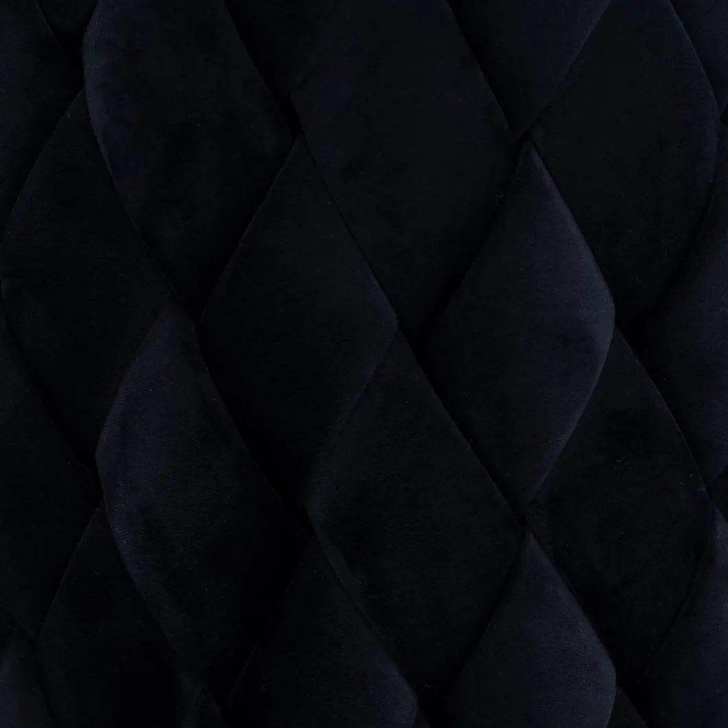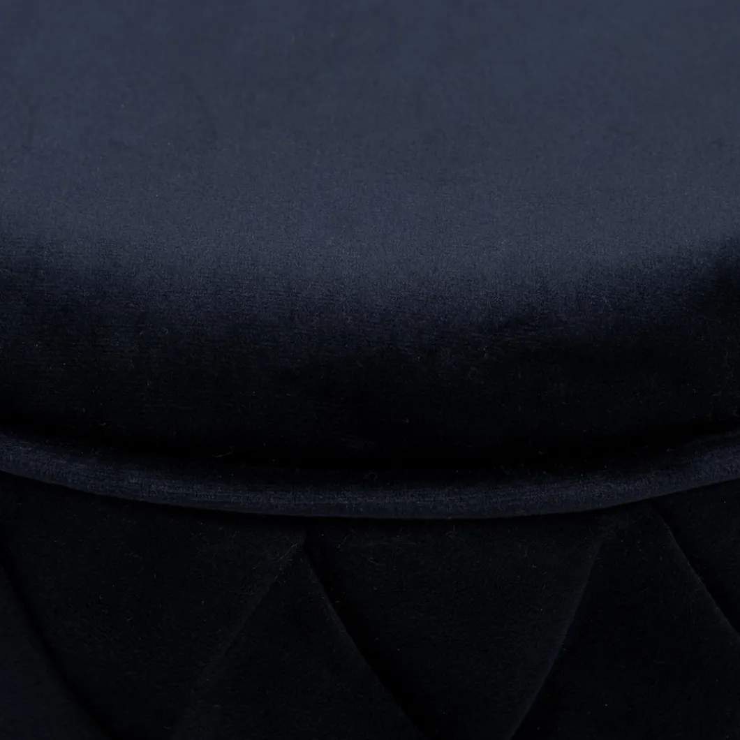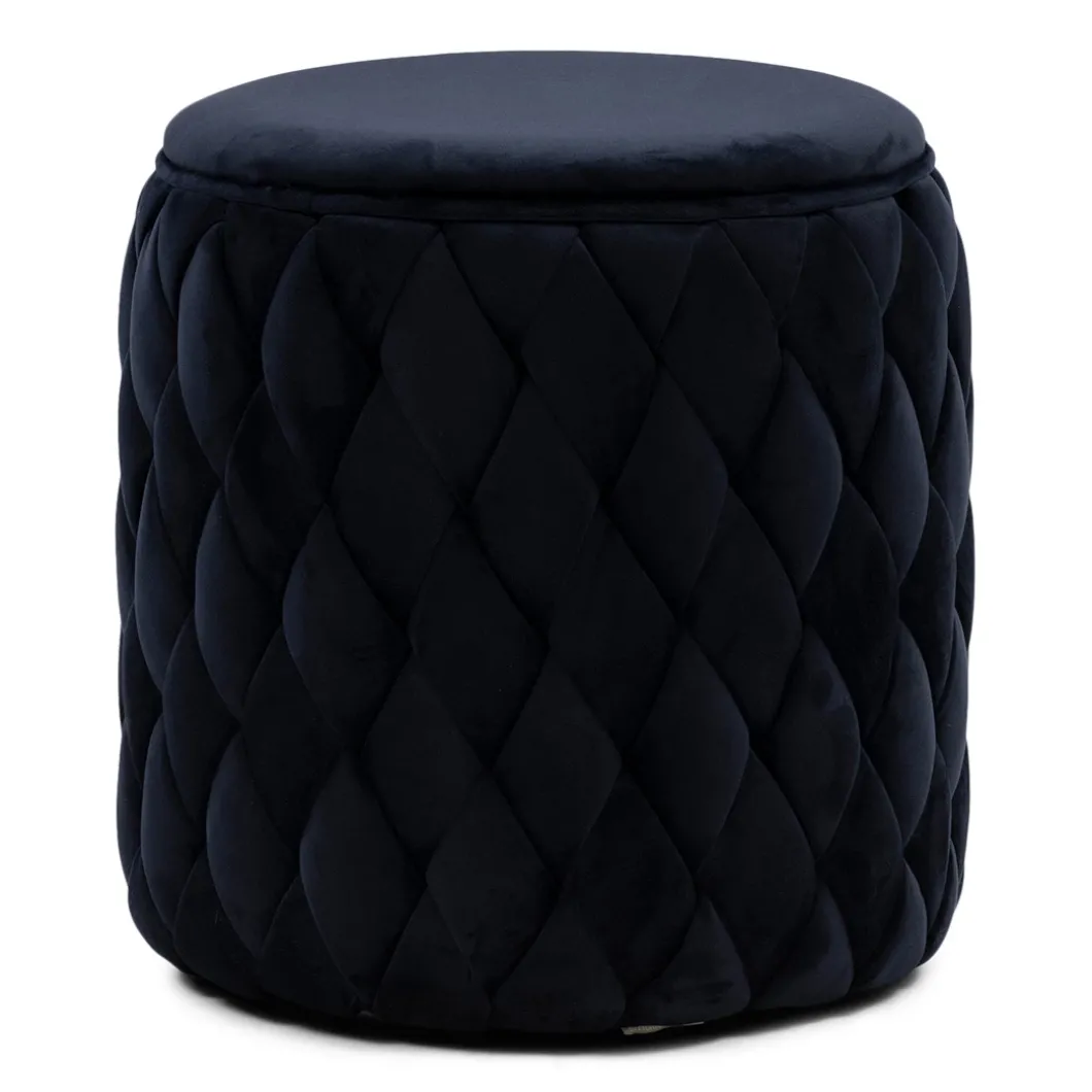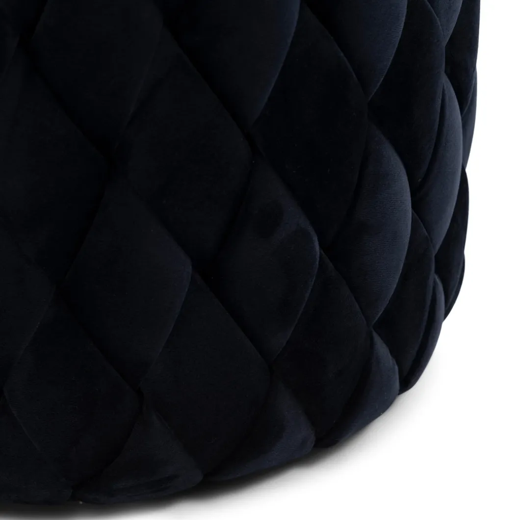 Hier kun je zien hoe goed eenvoud kan werken. De bekleding van deze ronde poef bestaat uit met de hand gevlochten repen stof. Het resultaat is prachtig. Dat komt mede door de stof die is gebruikt, Velvet III, in de kleur Indigo.