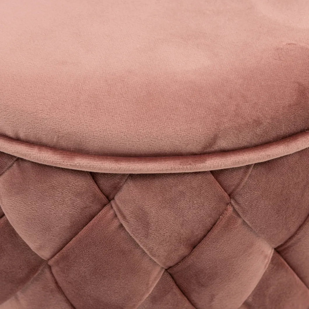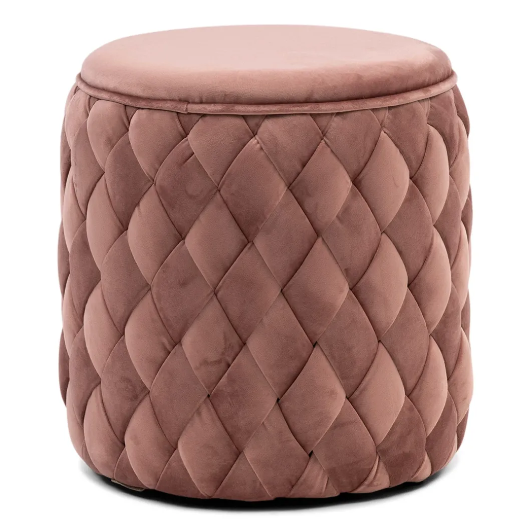 Hier kun je zien hoe goed eenvoud kan werken. De bekleding van deze ronde poef bestaat uit met de hand gevlochten repen stof. Het resultaat is prachtig. Dat komt mede door de stof die is gebruikt, Velvet III, in de kleur Rose Stain.