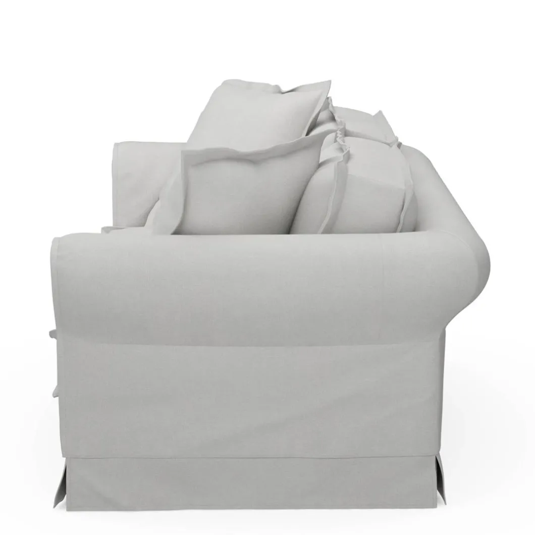 Een ideale maat voor in de zithoek. Meestal wel plaats voor drie personen, op zo’n 2,5-zits bank. En toch niet de volle 3-zits bank. Deze bank heeft een beukenhouten onderstel en de bekleding is van katoen, washed cotton. Die gewassen stof is er in vijf kleuren, en u moet bij een vlek voorzichtig deppen met een droge doek, om daarna met een vochtige doek de vlek te verwijderen.