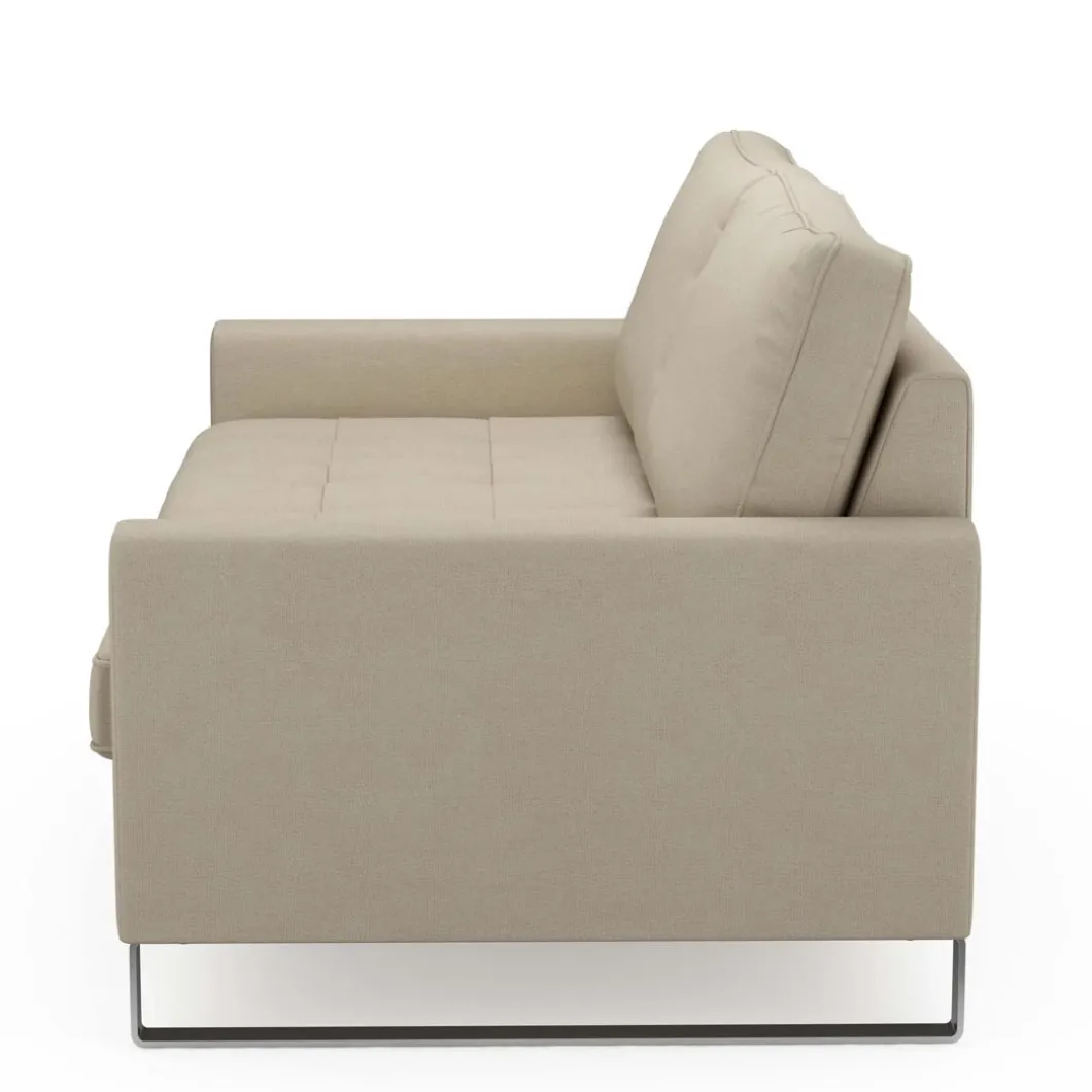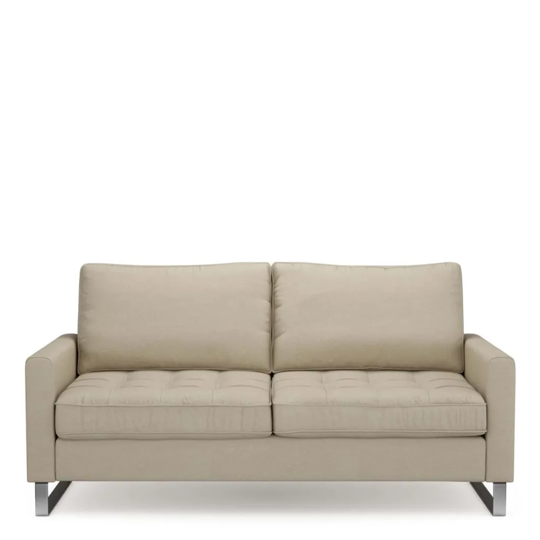 Een stoere bank op ijzeren poten, een 2,5-zitter, maar plaats voor 3 als de zitvlakken niet te breed zijn. Hij is stoer, hij is stevig en hij zit heel lekker. Gemaakt van beukenhout, polyester en ijzer. Vlekken kunnen voorzichtig met de hand worden weggehaald. Er zijn verschillende kleuren en materialen voor de bekleding beschikbaar. De maat: 170 x 90 x 85 cm.