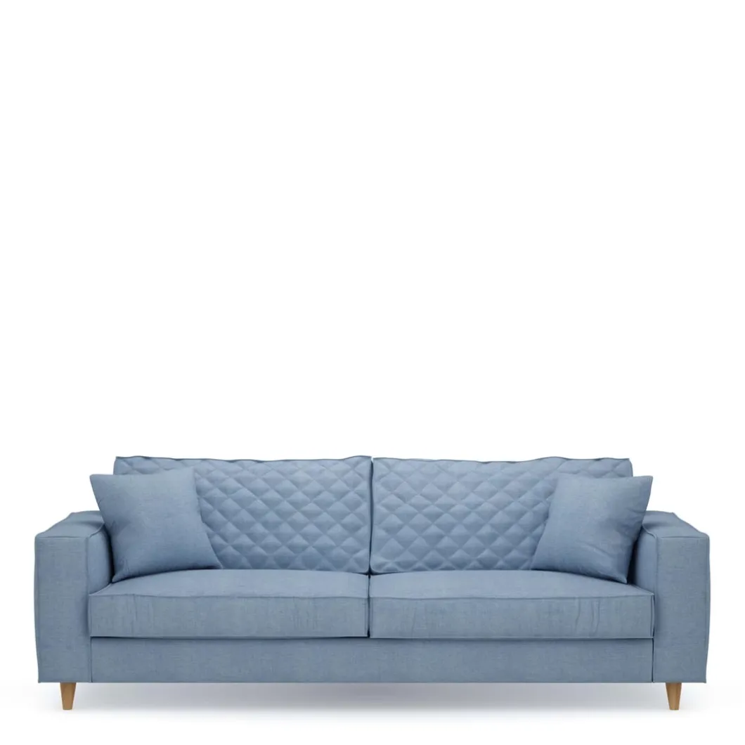 Deze prachtige, ijsblauwe bank van katoen is een echte blikvanger in uw interieur. De bank is een 3,5-zitsbank en wordt geleverd met twee bijpassende sierkussens. Geniet van het ultieme zitcomfort op deze heerlijke bank. Op deze bank zou u het liefst de hele dag willen vertoeven.