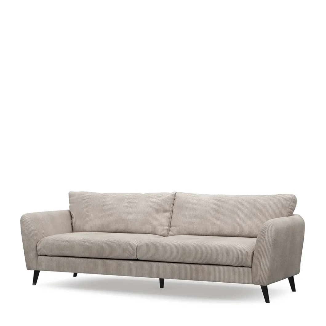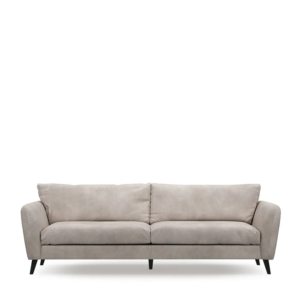 Voor een strak interieur is deze Sophia 3,5-zits bank een prachtig ontwerp. De armleuningen zijn licht naar buiten gebogen, waardoor er meer comfort is. De twee grote zitkussens zijn van hoge kwaliteit. De bekleding is van english rib in de kleur almond. Het frame van de bank is van beukenhout.