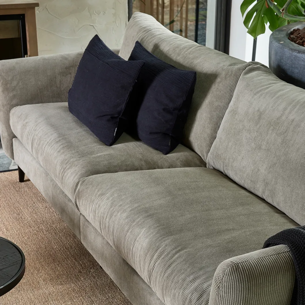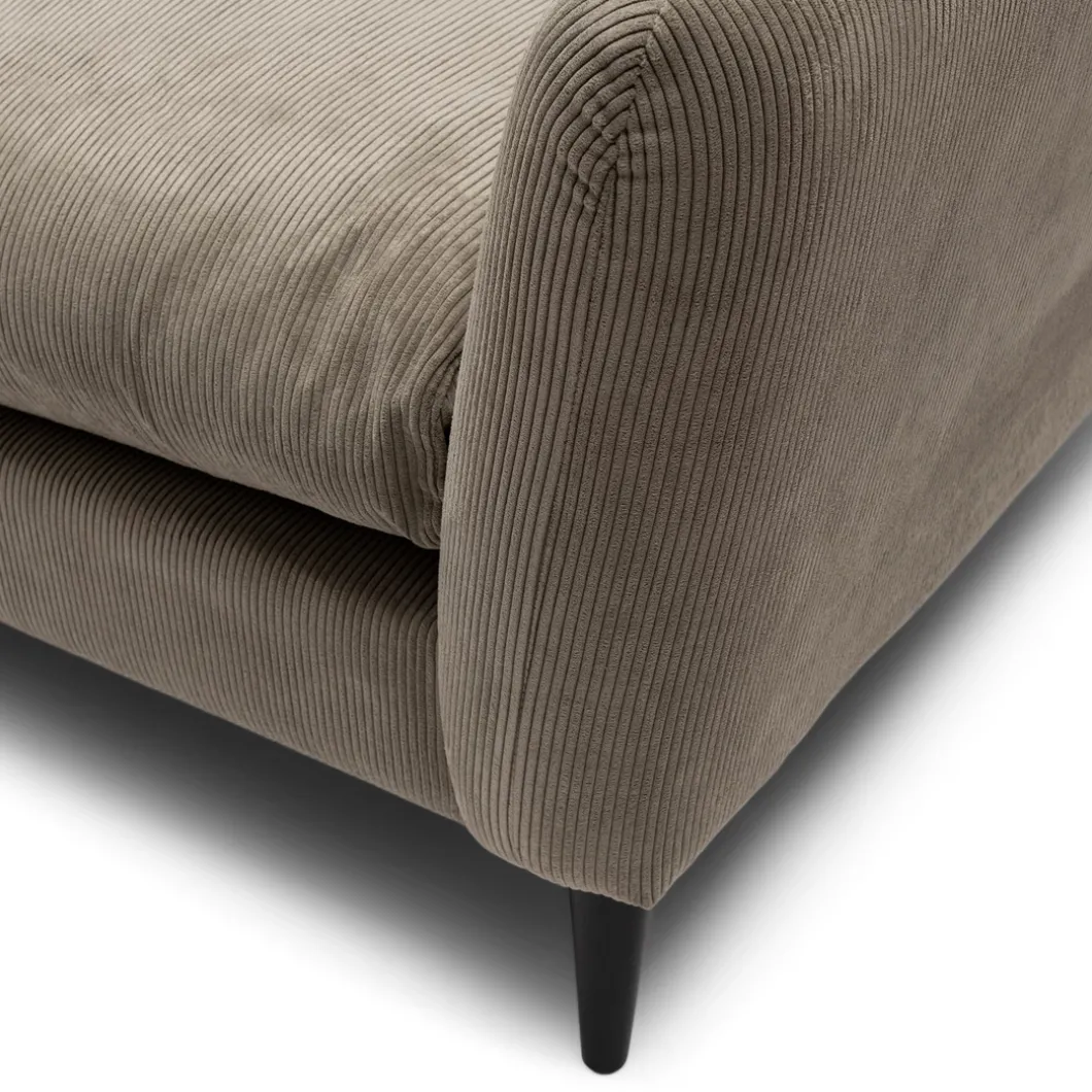 Voor een strak interieur is deze Sophia 3,5-zits bank een prachtig ontwerp. De armleuningen zijn licht naar buiten gebogen, waardoor er meer comfort is. De twee grote zitkussens zijn van hoge kwaliteit. De bekleding is van english rib in de kleur thyme. Het frame van de bank is van beukenhout.