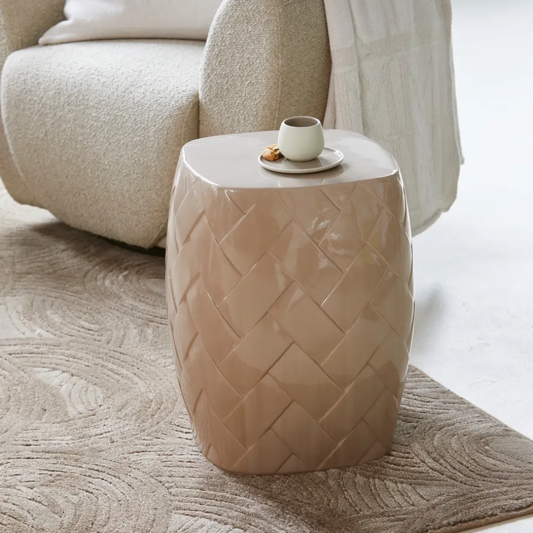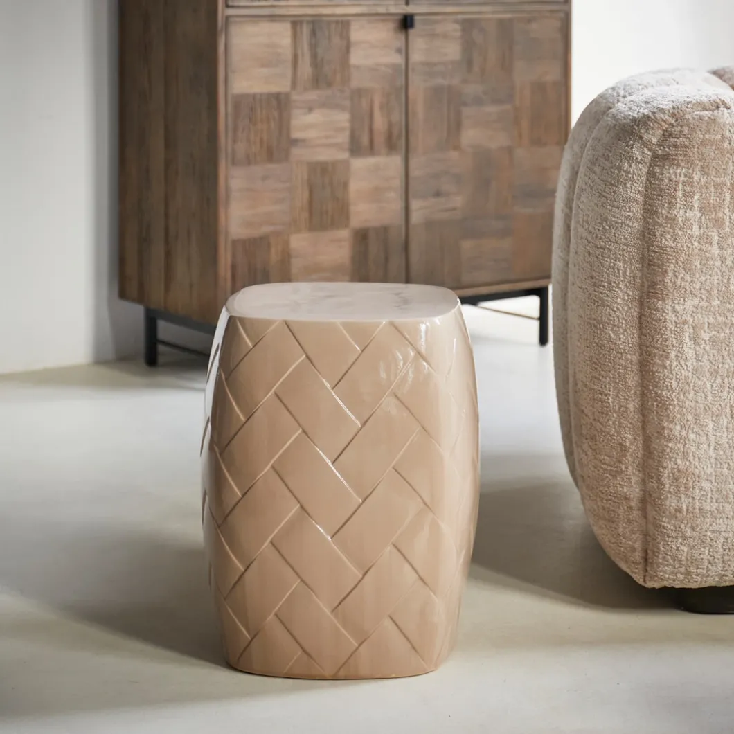 Laat je interieur stralen met de Tavira bijzettafel. Deze prachtige tafel, volledig gemaakt van keramiek, combineert een elegante zandkleur met een opvallend gevlochten design. Met zijn compacte formaat (hoogte 46 cm, diameter 37 cm) is hij perfect om jouw ruimte een stijlvolle en verfijnde touch te geven. Een tijdloos stuk dat functionaliteit en schoonheid samenbrengt!