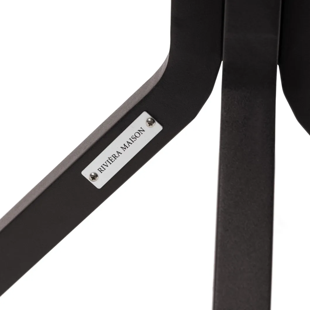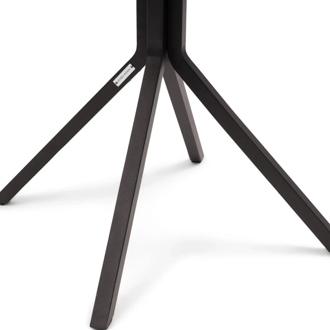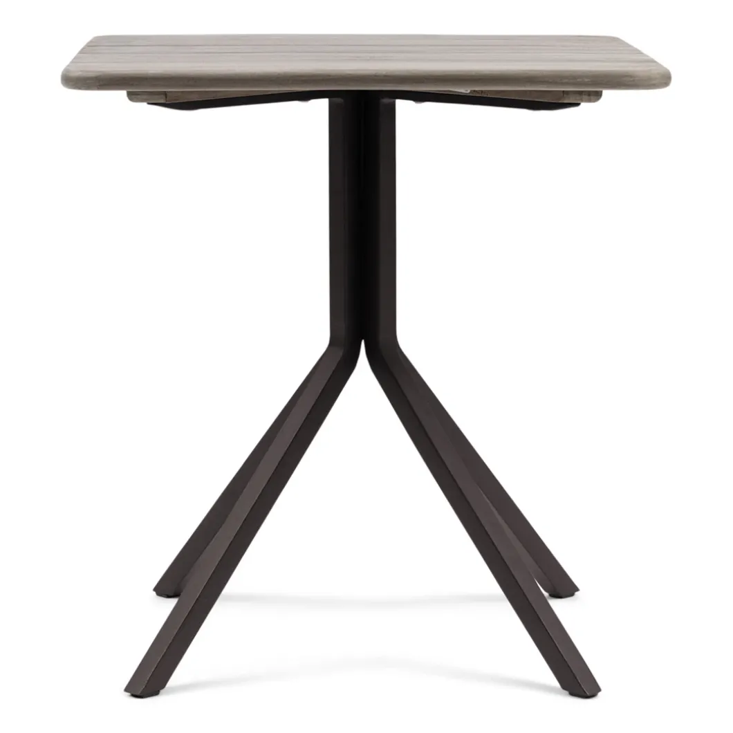 Bistrotafeltje voor buiten, om lekker aan te eten, of voor je koffie of drankje. Op een vierpoot van donkerbruin aluminium die uit het midden naar de hoeken gaat, ligt een prachtig panelenblad van teakhout. De combinatie heeft een industrieel karakter. Eigentijds en karakteristiek.