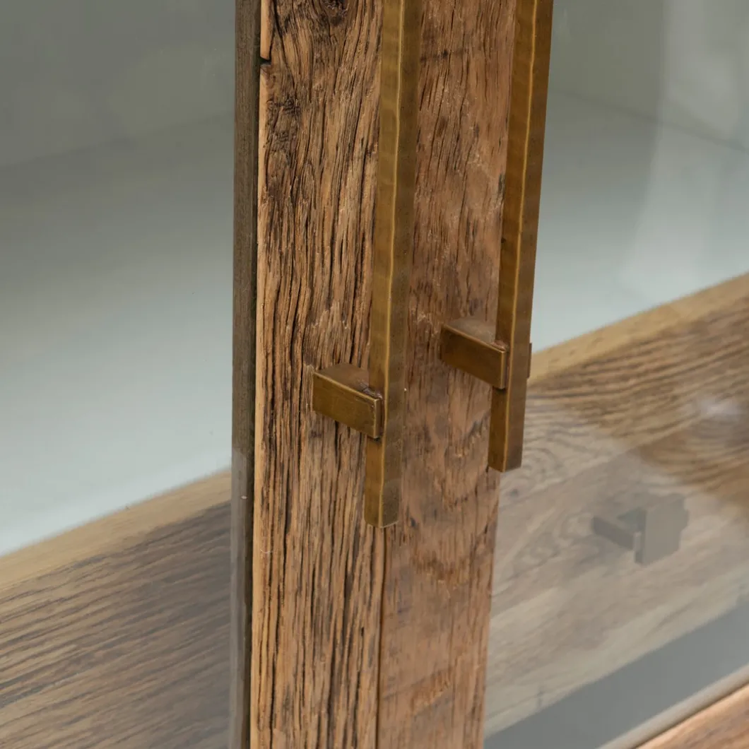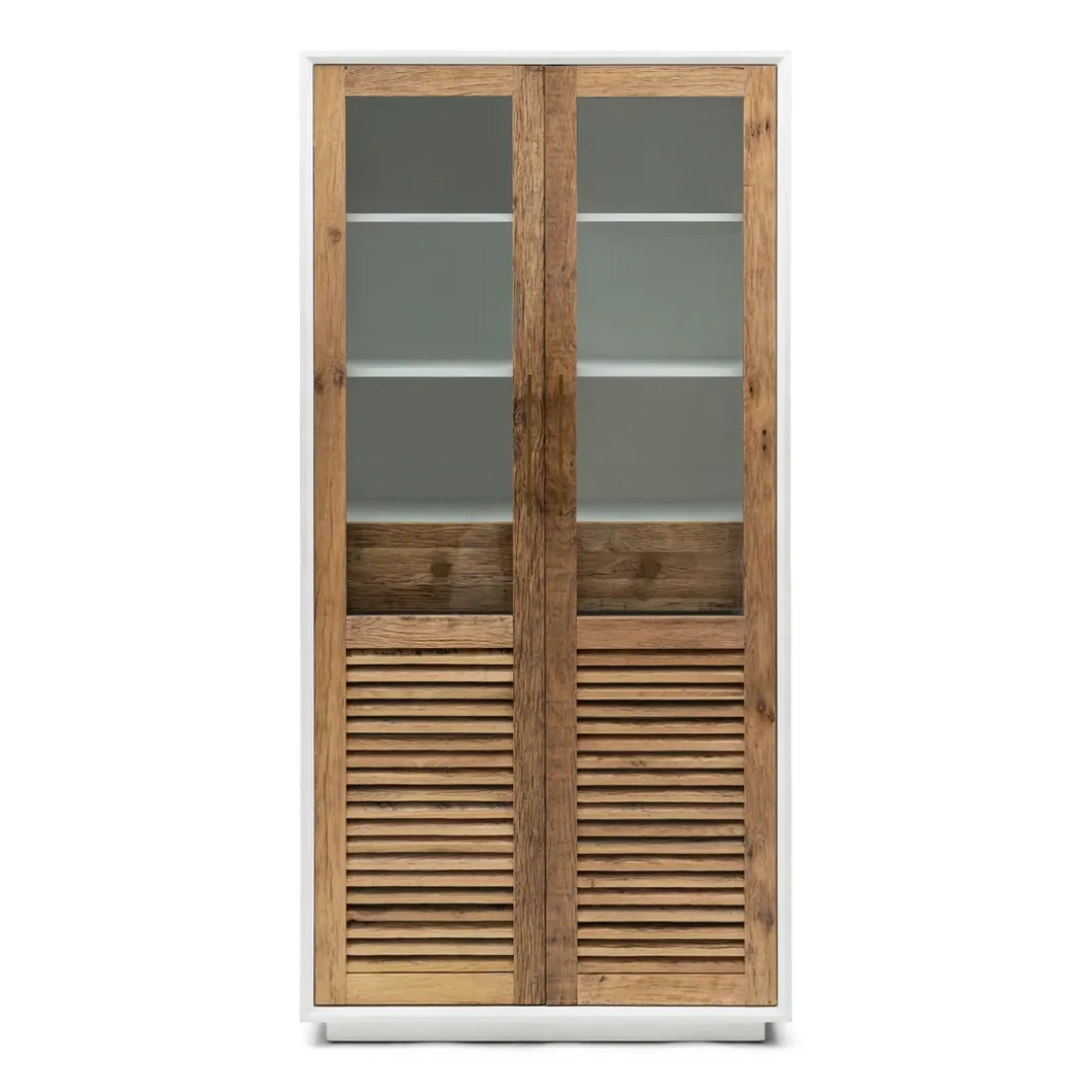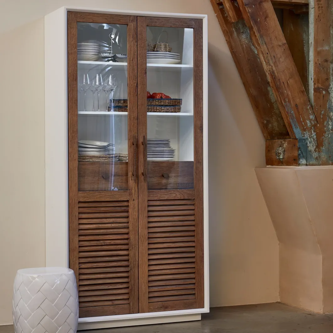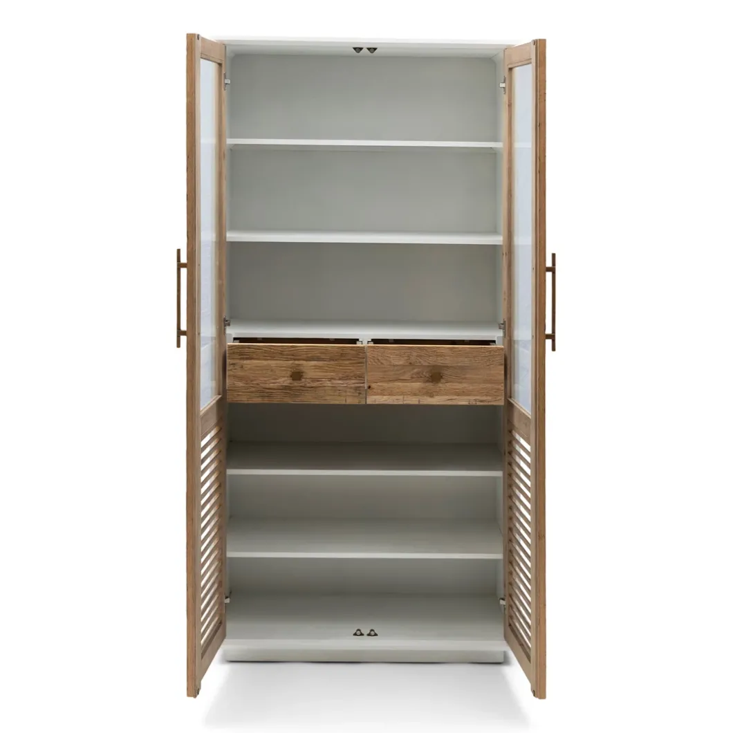 - De Lake buffetkast is een elegante aanvulling op je interieur, met houten deuren die een warme touch toevoegen. De deuren zijn voorzien van louvre en glas, wat een verfijnde en luchtige uitstraling creëert. De gouden handgrepen voegen een stoer accent toe, terwijl de magneetsluiting zorgt voor een naadloze en praktische afwerking. Met twee lades biedt deze kast ook handige opbergruimte, waardoor de kast zowel functioneel als stijlvol is. Elk kast is uniek door het gebruik van teruggewonnen eikenhout.