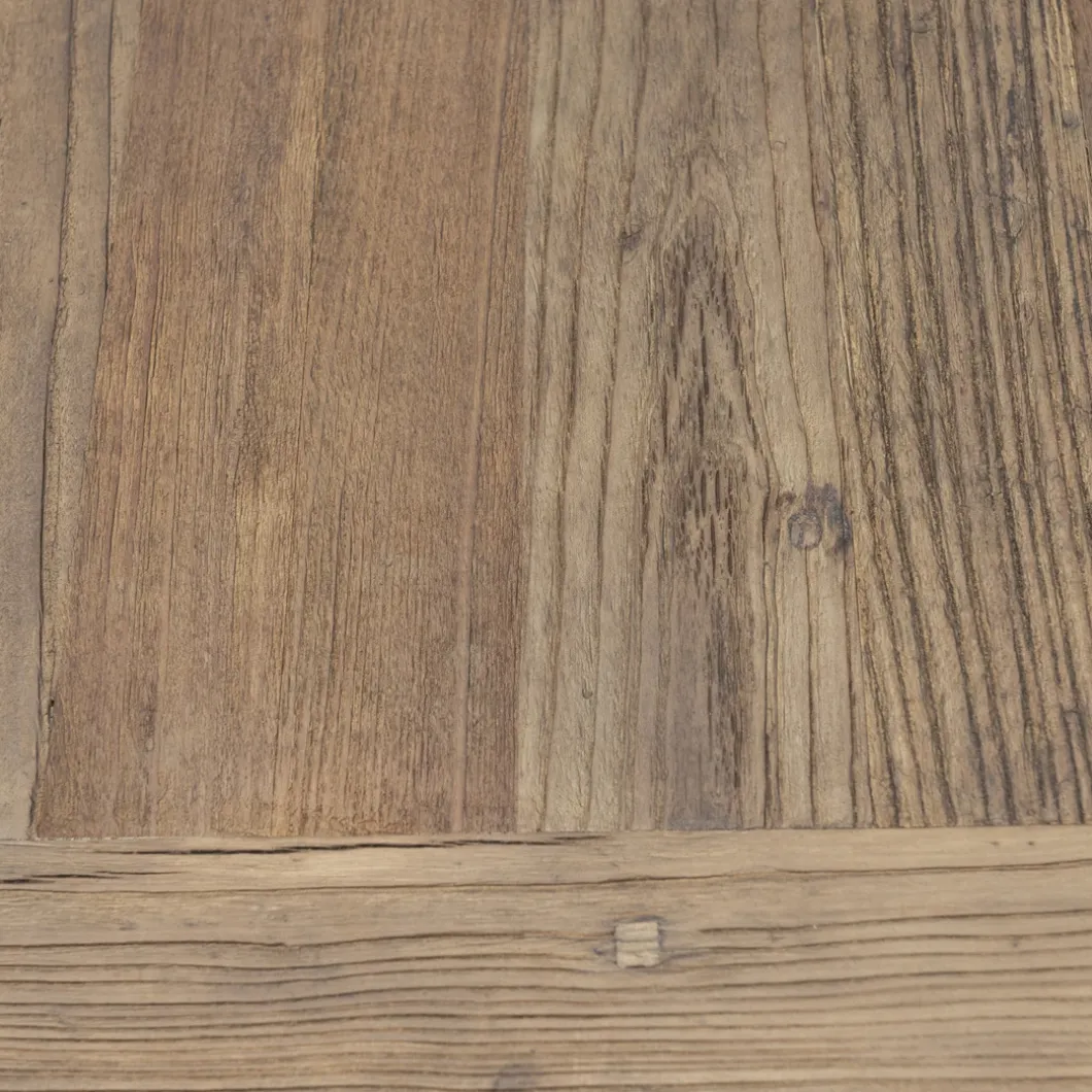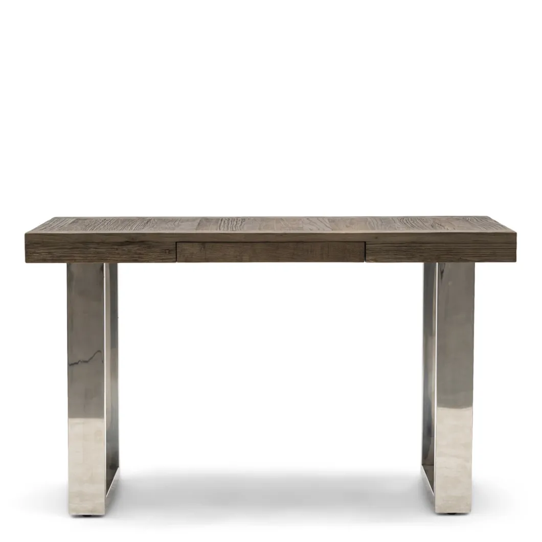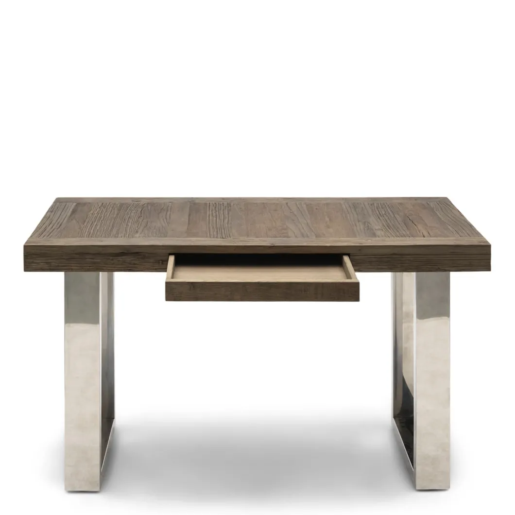 Dit bureau van onze Washington lijn is een solide tafel. Het blad is gemaakt van oud iepenhout, verkregen van oude Chinese deuren. Hierdoor is iedere tafel uniek. Het strakke onderstel is gemaakt van roestvrij staal. Ook verkrijgbaar in andere meubel varianten, zoals de bijpassende salontafel of eettafel.