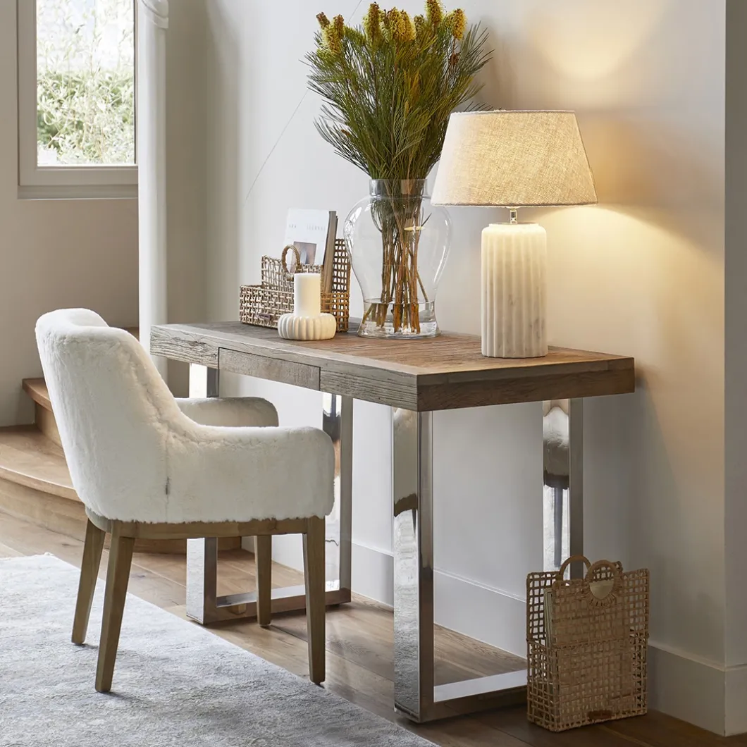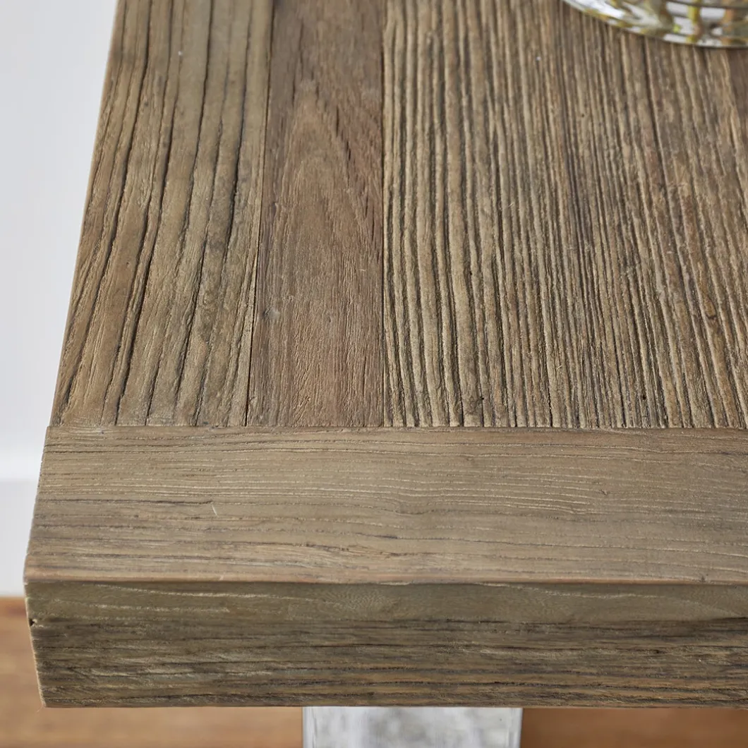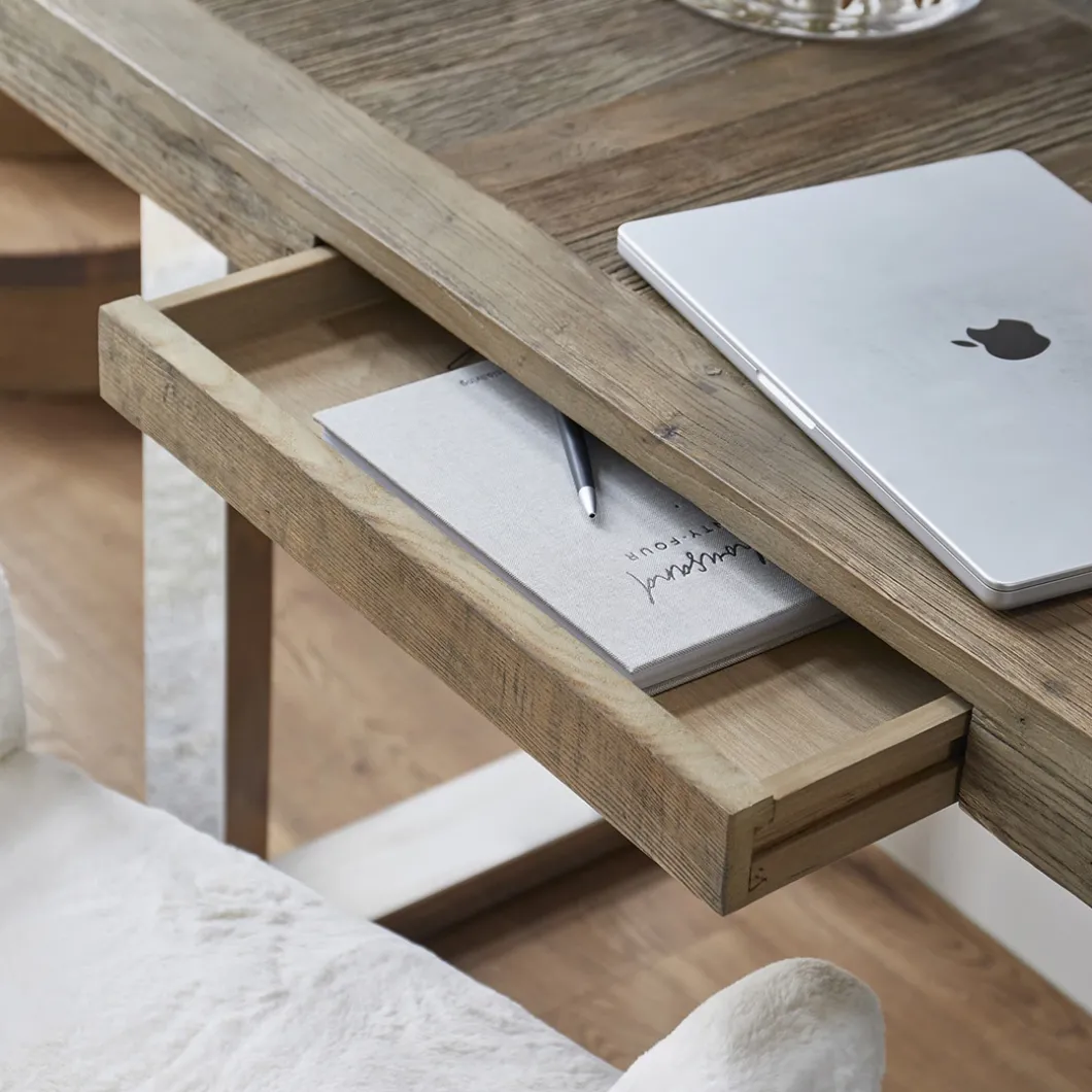 Dit bureau van onze Washington lijn is een solide tafel. Het blad is gemaakt van oud iepenhout, verkregen van oude Chinese deuren. Hierdoor is iedere tafel uniek. Het strakke onderstel is gemaakt van roestvrij staal. Ook verkrijgbaar in andere meubel varianten, zoals de bijpassende salontafel of eettafel.