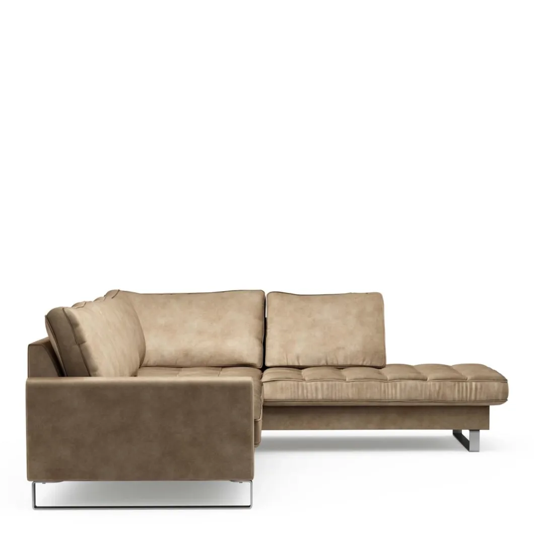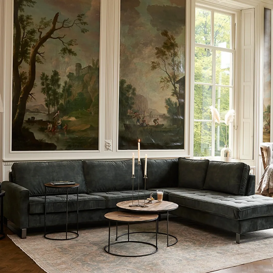 Deze bank met rechts een chaise longue wordt de favoriet in huis. Lekker een beetje suf op de bank liggen na een sportwedstrijd of een lange dag. Gestrekt op het zachte fluweel van de bekleding komt een mens dan weer helemaal bij. De bank is gemaakt van beukenhout, ijzer en polyester. Hij heeft een robuust uiterlijk, zit heerlijk en is er in verschillende materialen en kleuren. 295 x 220 x 85 cm groot.