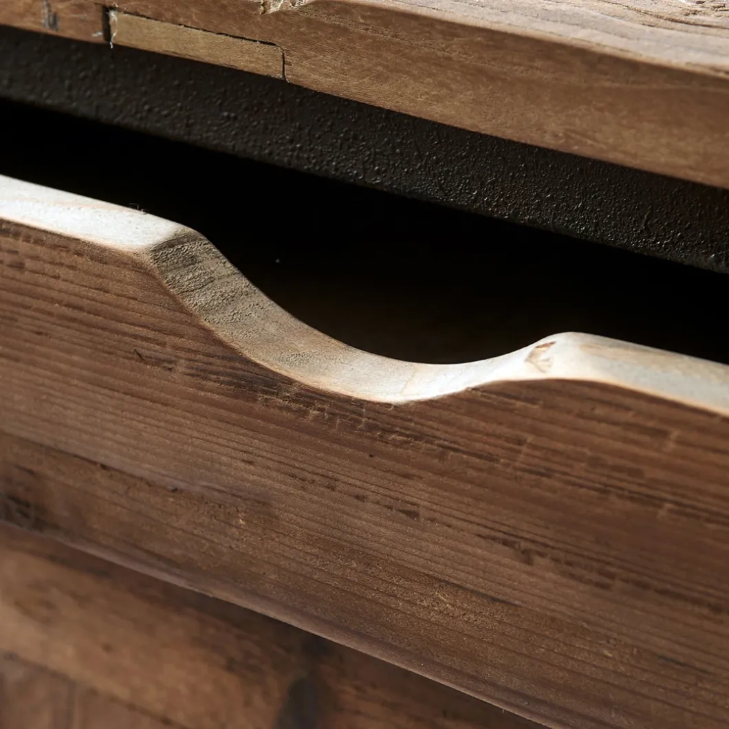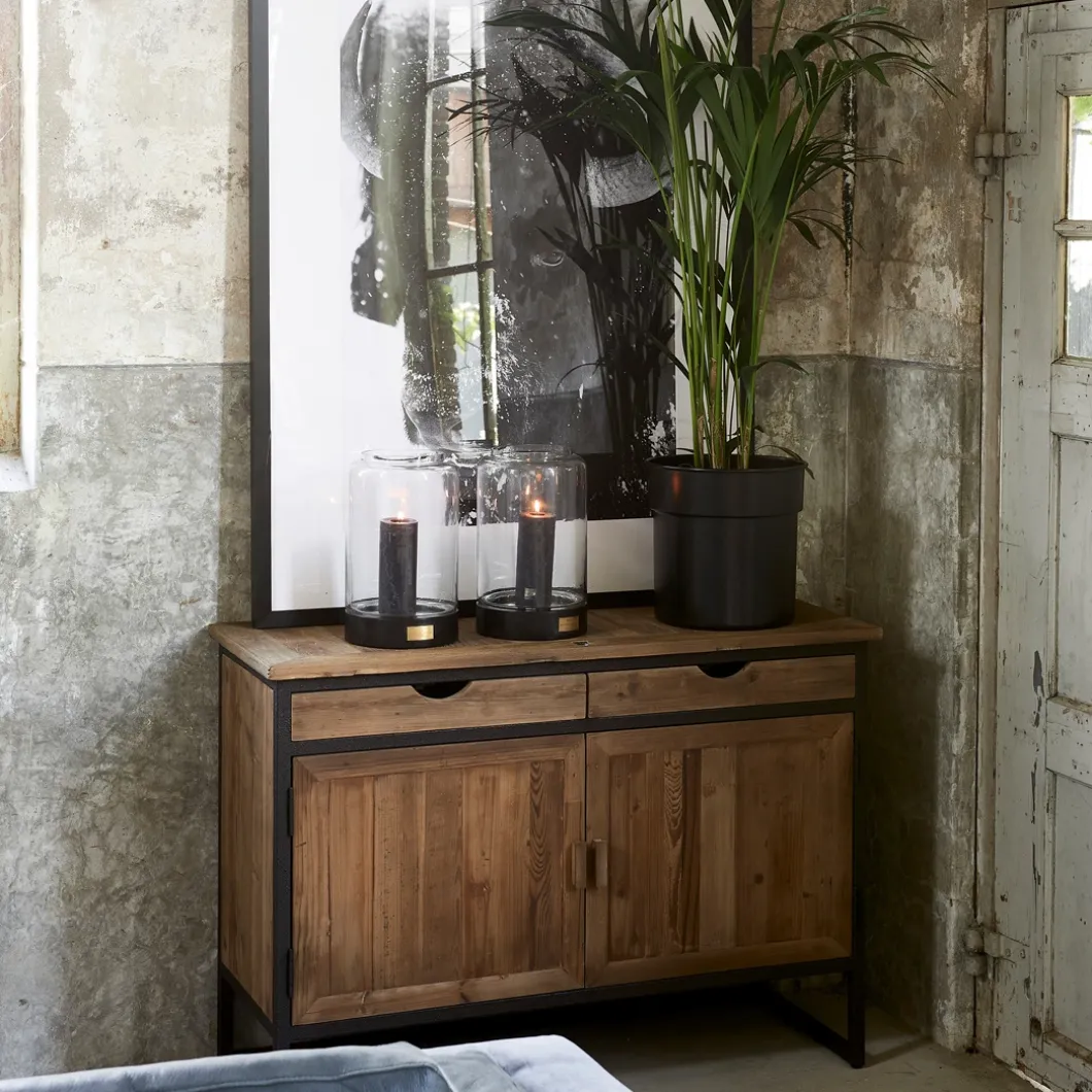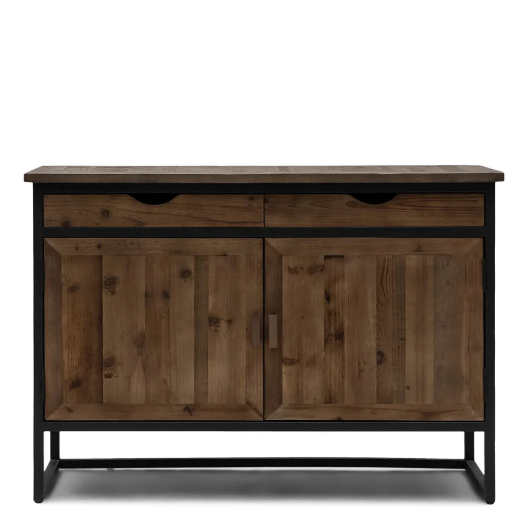 Een robuust dressoir met industrieel karakter vormt een mooie toevoeging aan de Shelter Island serie. Het gebruik van gerecycled iepenhout en sparrenhout maken van elk meubel een uniek exemplaar. De twee schuiflades en twee kastjes bieden genoeg ruimte voor diverse accessoires.
