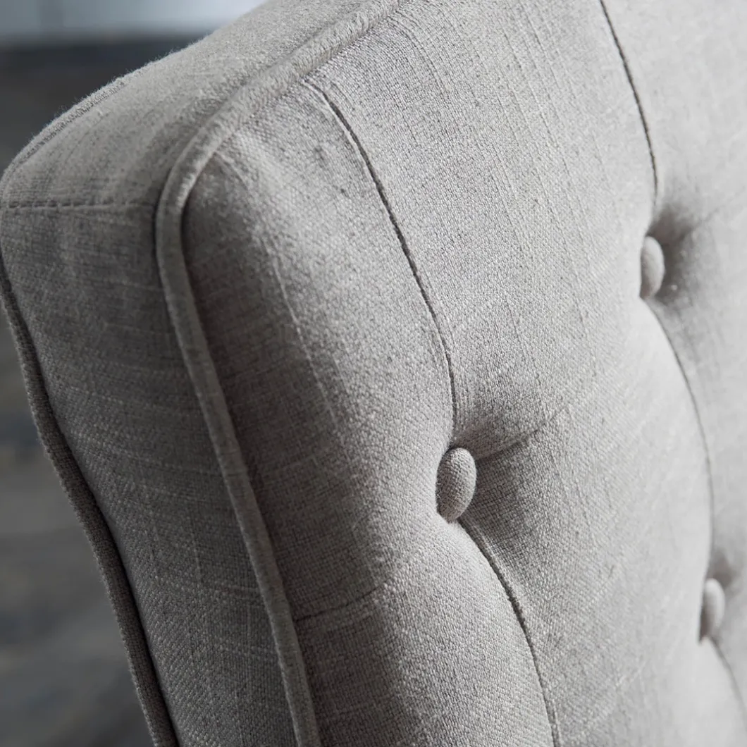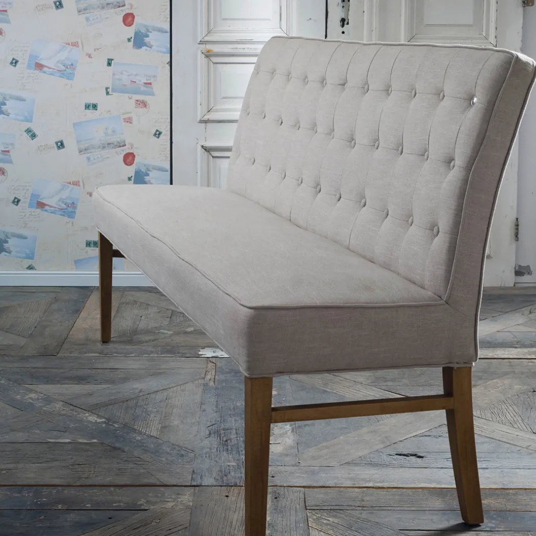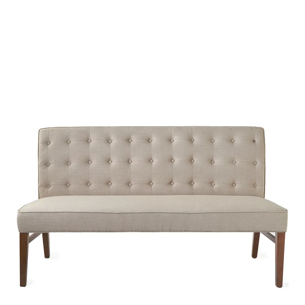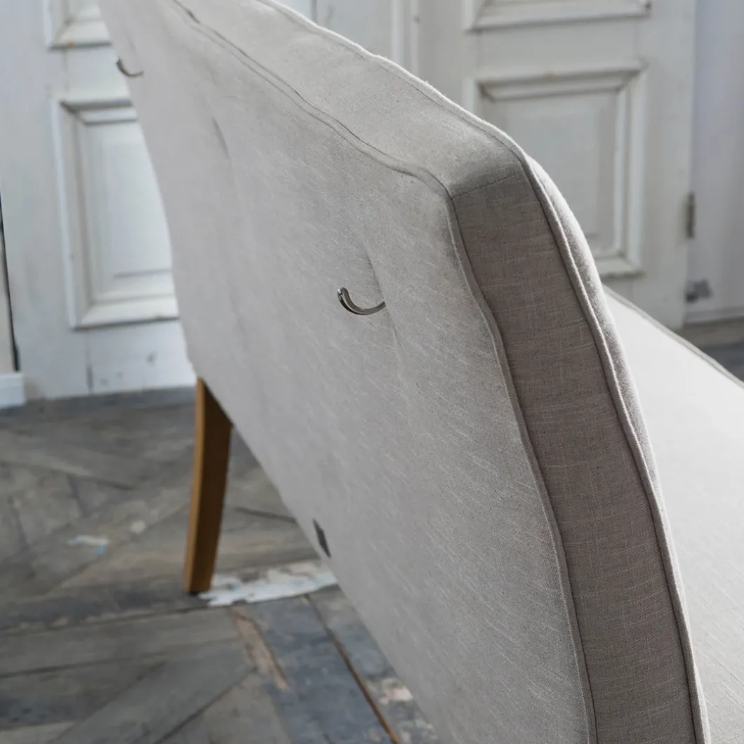 Deze gecapitonneerde, comfortabele, linnen bank is, net als de Keith Lowback Wing Bench, een toevoeging op de Cape Breton Chair. Leuk om aan de ene kant deze Cape Breton Bench te zetten en aan de andere kant van de tafel drie Cape Breton Chairs. Het haakje aan de achterkant is handig voor uw handtas, hoeft uw luxe tas niet meer op de grond te staan.