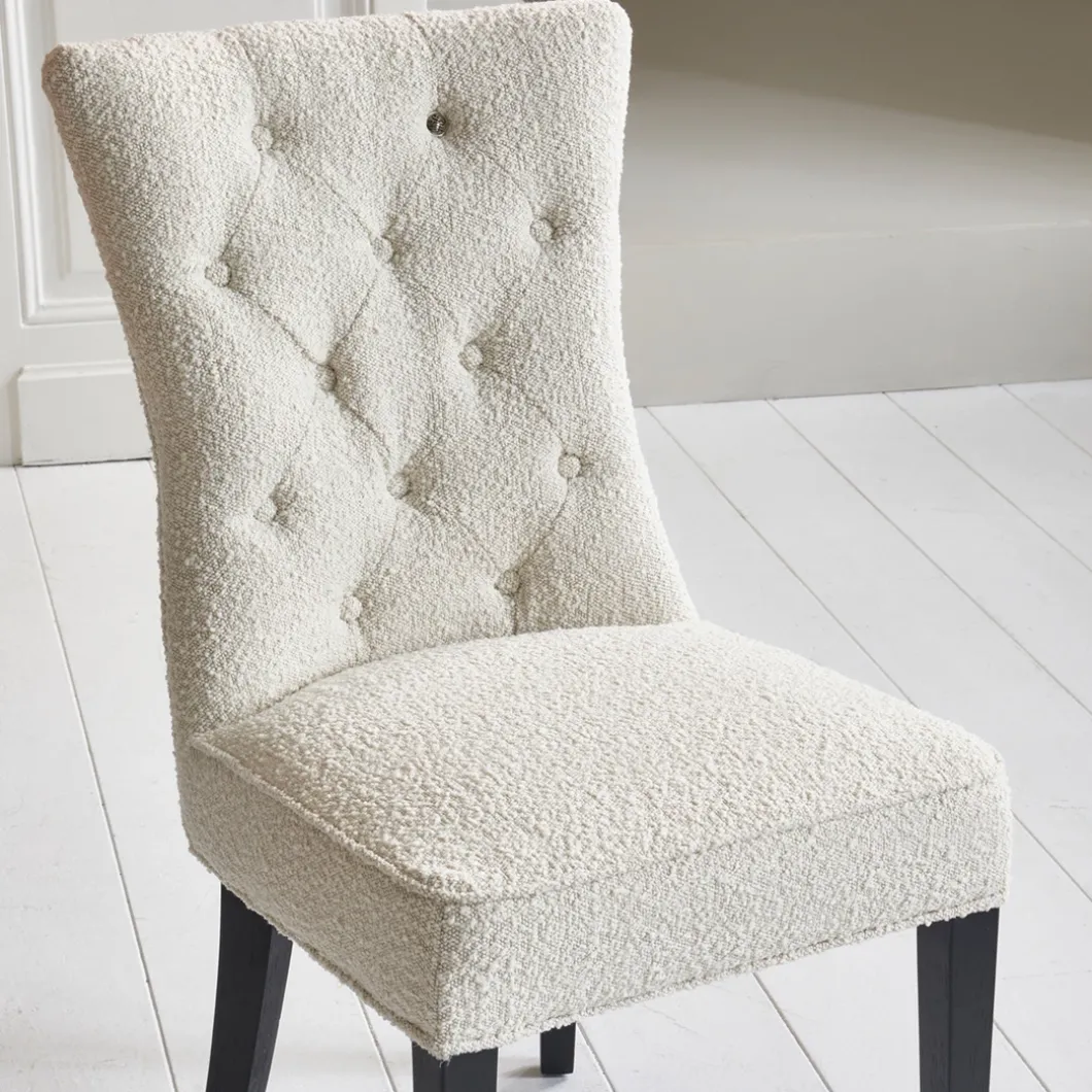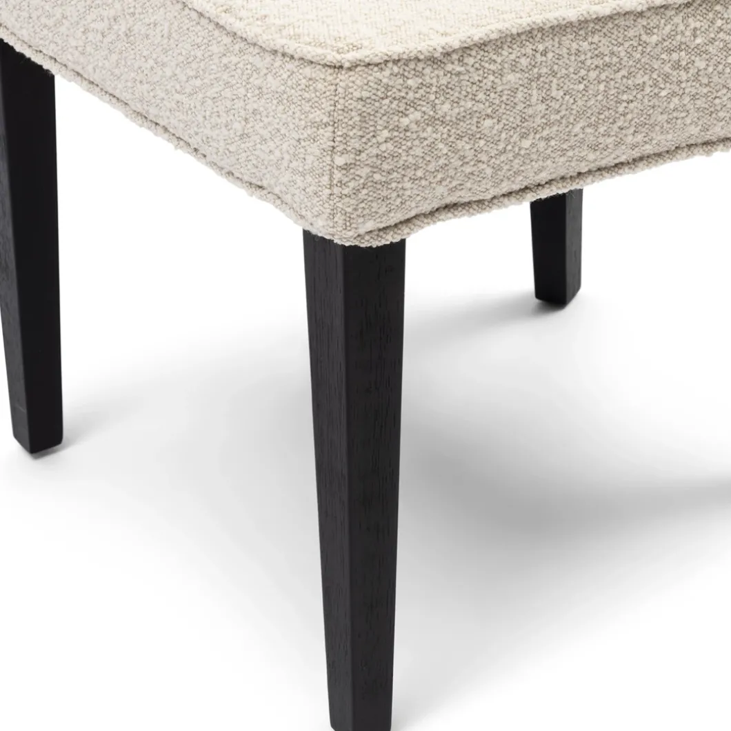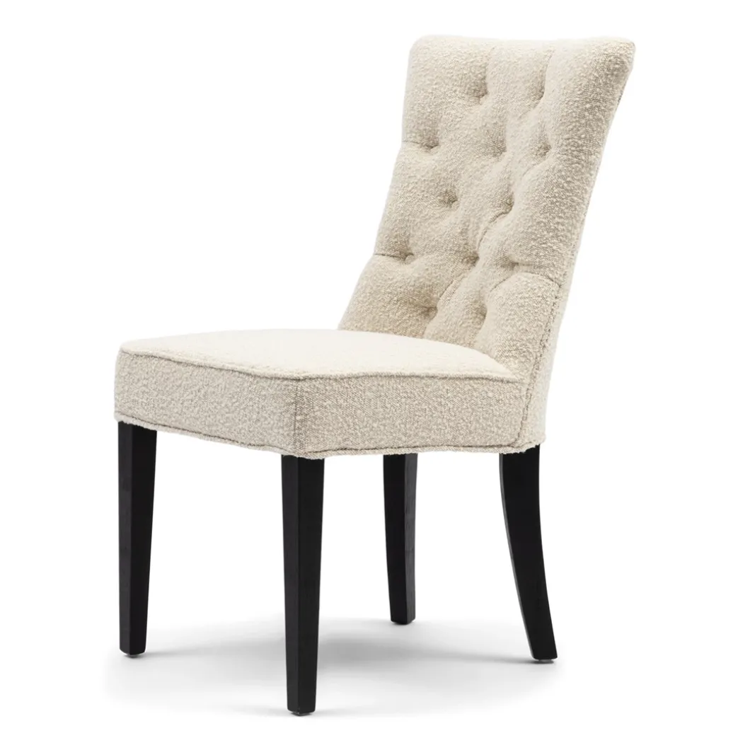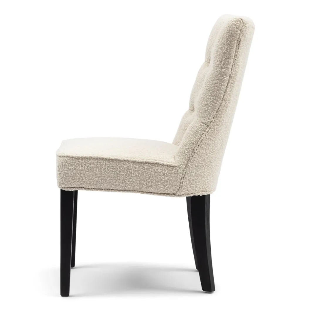 Een klassieke eetkamerstoel in een modern jasje. Rechte zitting, rechte carpetleuning en geen armsteunen. Een mooie gecapitonneerde carpet, die hem een luxe uitstraling geeft. Zacht bouclé op rubberhouten poten, afkomstig van oude rubberbomen en daardoor een duurzaam product.