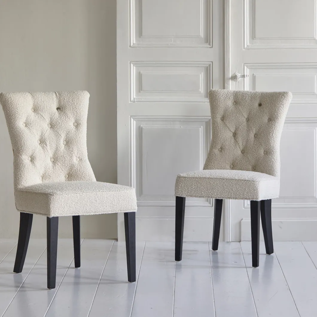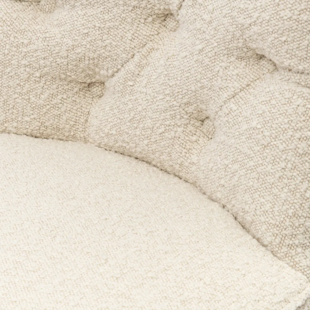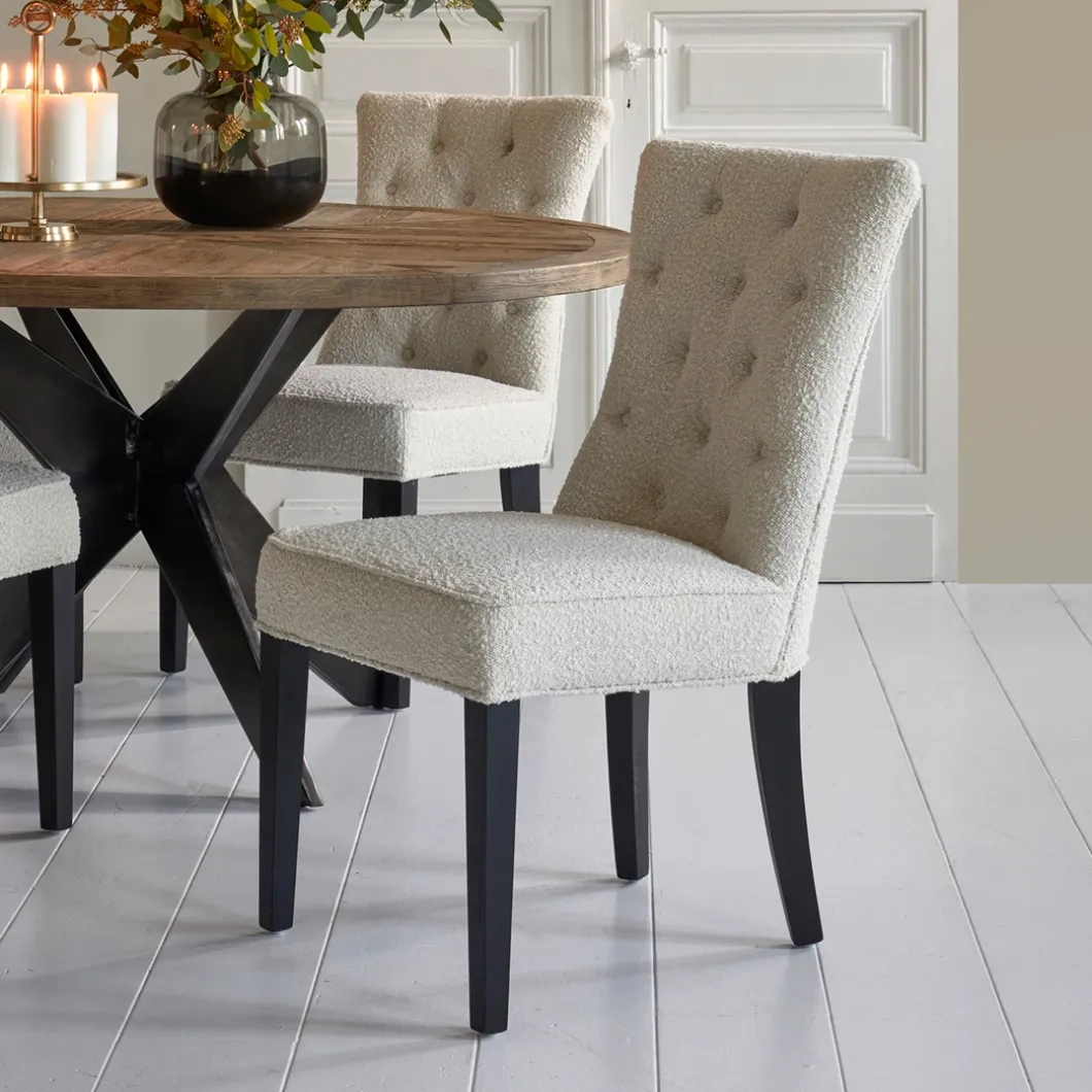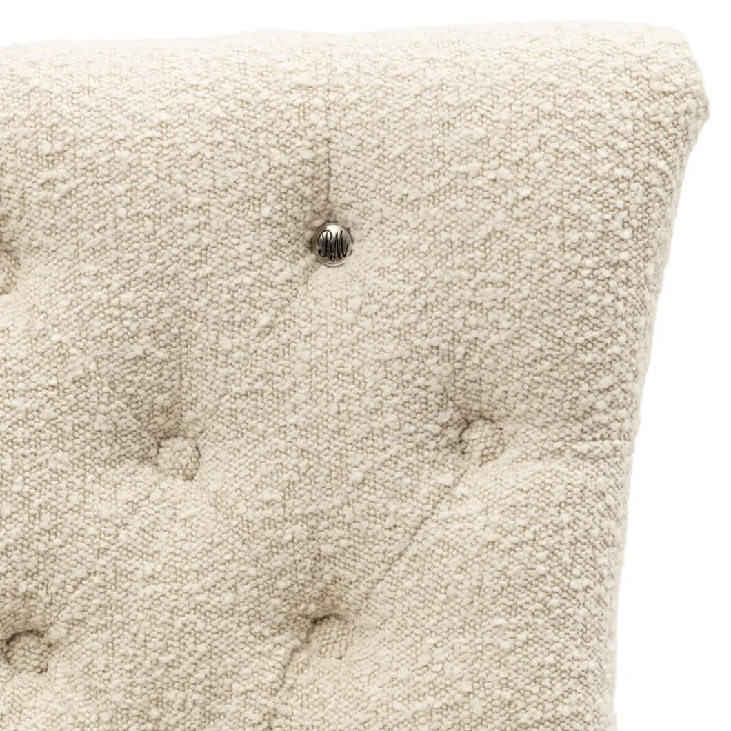 Een klassieke eetkamerstoel in een modern jasje. Rechte zitting, rechte carpetleuning en geen armsteunen. Een mooie gecapitonneerde carpet, die hem een luxe uitstraling geeft. Zacht bouclé op rubberhouten poten, afkomstig van oude rubberbomen en daardoor een duurzaam product.