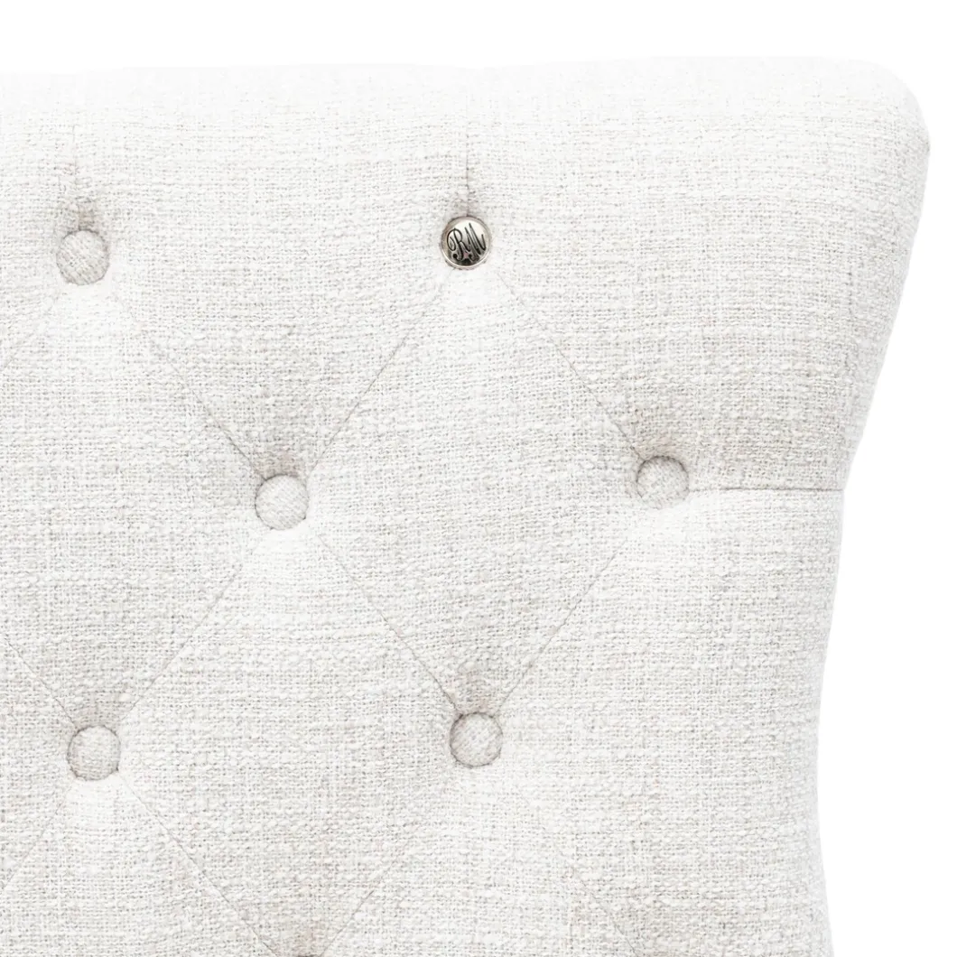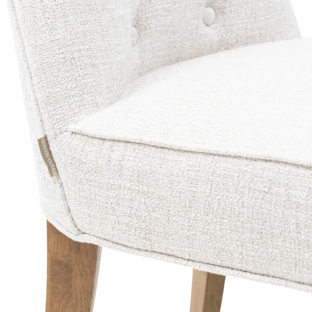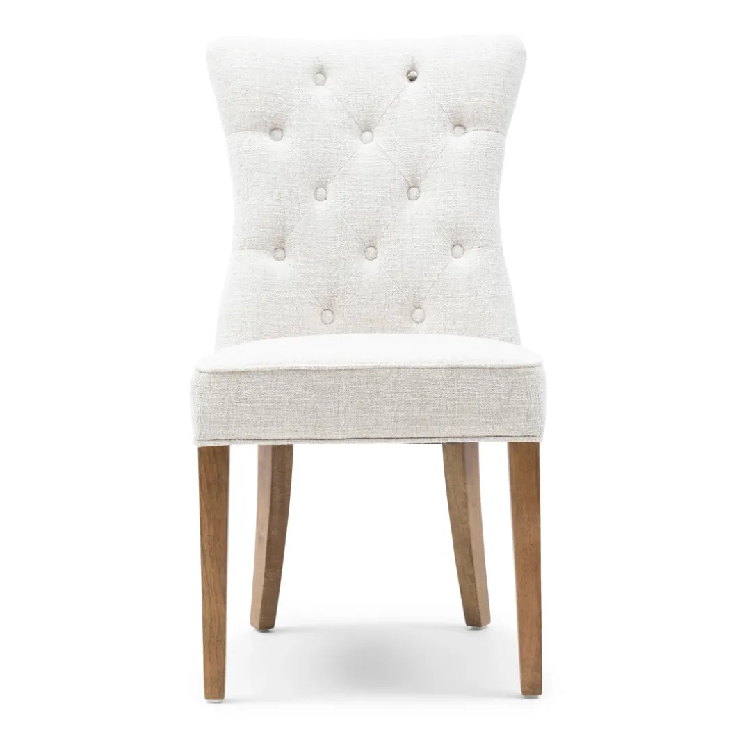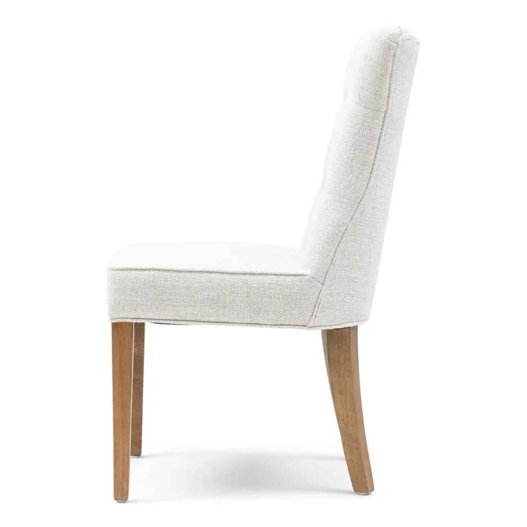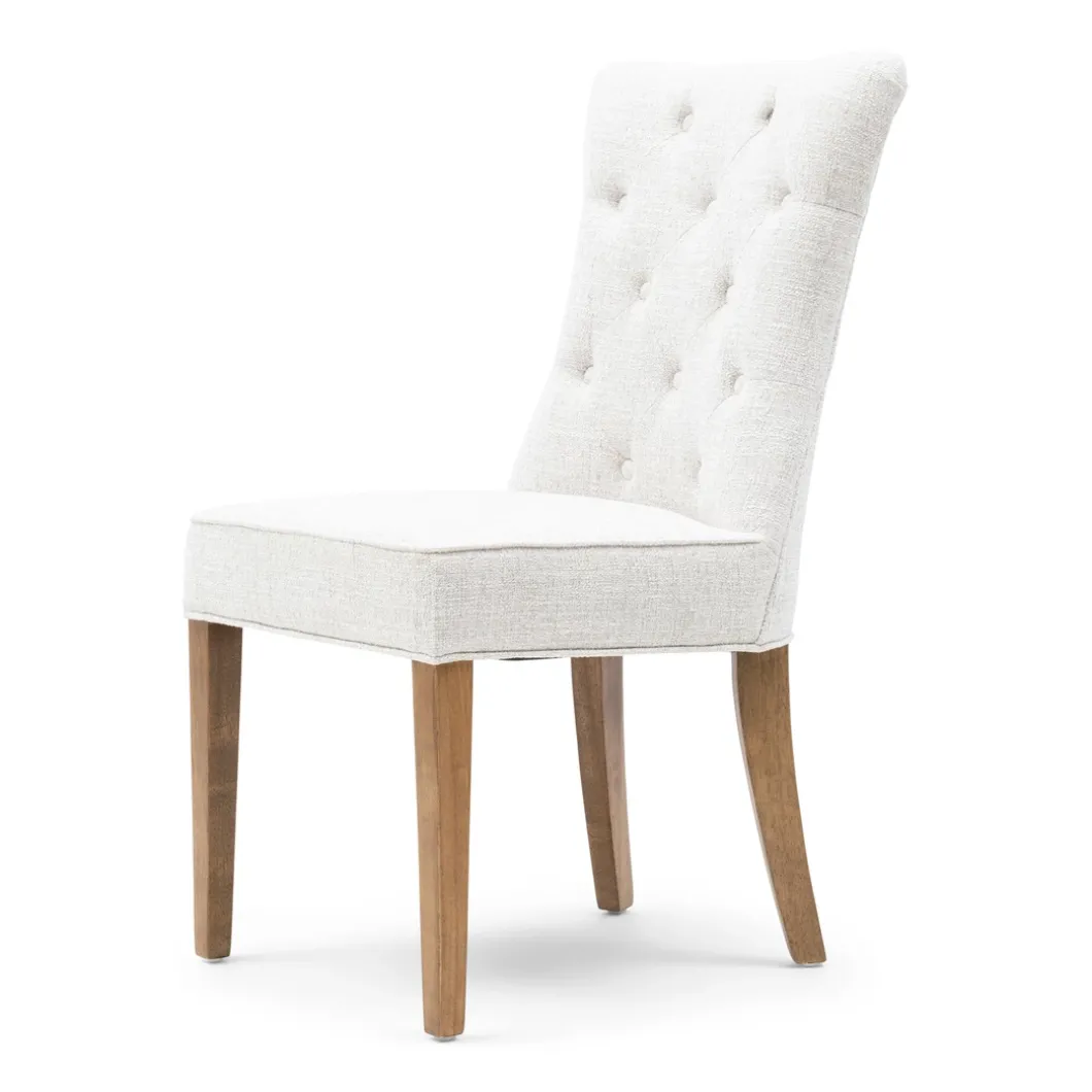 - Deze klassieke eetkamerstoel krijgt een moderne twist met zijn rechte zitting en rugleuning. De prachtige gecapitonneerde bekleding in een luxe, gemêleerde linnenachtige stof zorgt voor een elegante uitstraling. Perfect om te genieten van diners in stijl.