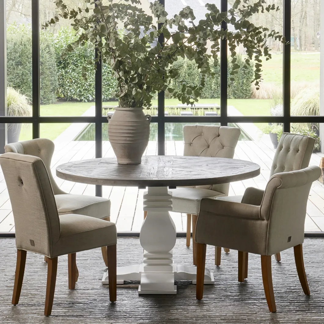 De La Scala Dining Armchair is vernoemd naar een van de mooiste en beroemdste operagebouwen ter wereld: Teatro alla Scala in Milaan. De stoel is klassiek vormgegeven en heeft een gecapitonneerde rugleuning met daarin het Rivièra Maison trademark, de zilveren RM-knoop verwerkt. Verkrijgbaar in linnen en pellini.