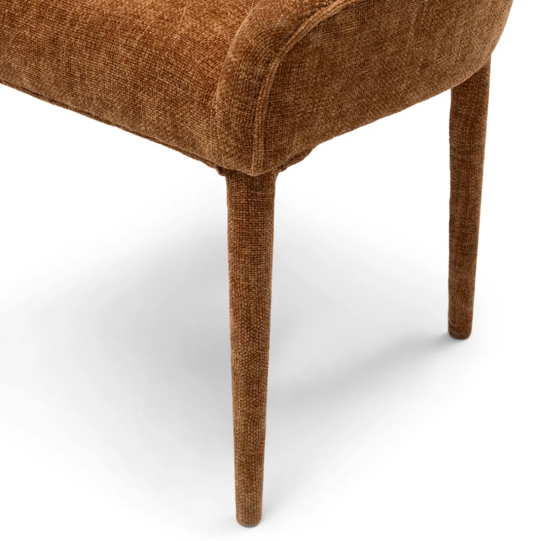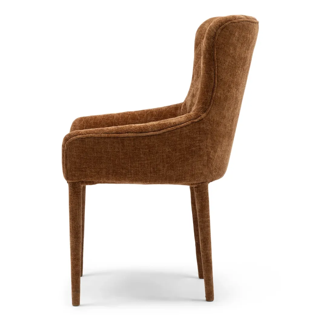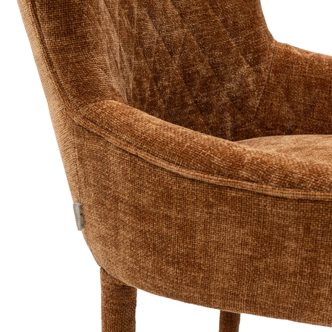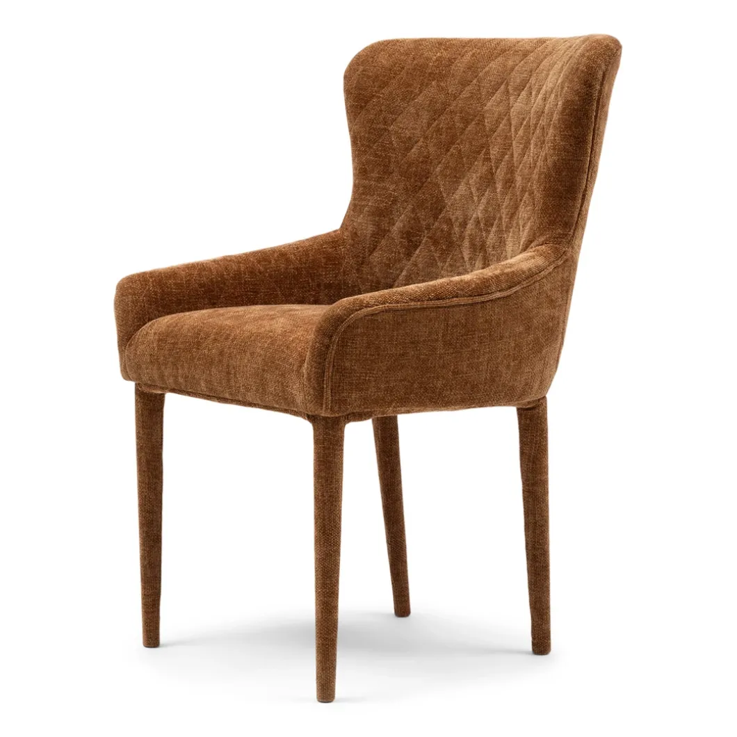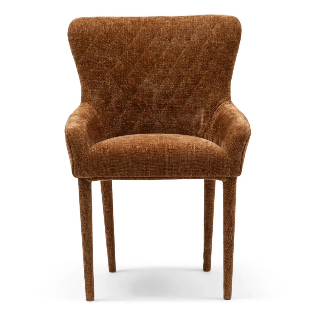 - Deze eetkamerstoel met armleuningen combineert comfort met verfijning. De gemêleerde bekleding, die ook de poten omhult, getuigt van zorgvuldige afwerking. Met zijn diepe zit en hoge rug biedt de stoel uitstekende ondersteuning en een luxueuze zitervaring. Het geruite stiksel voegt een modern accent toe aan het ontwerp, waardoor deze stoel moeiteloos past in diverse interieurstijlen. Een elegante keuze voor elke eetruimte.