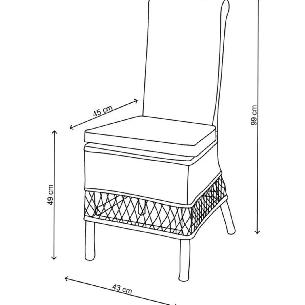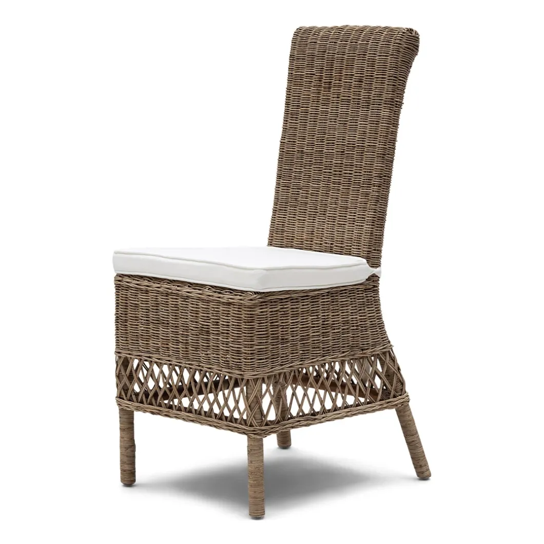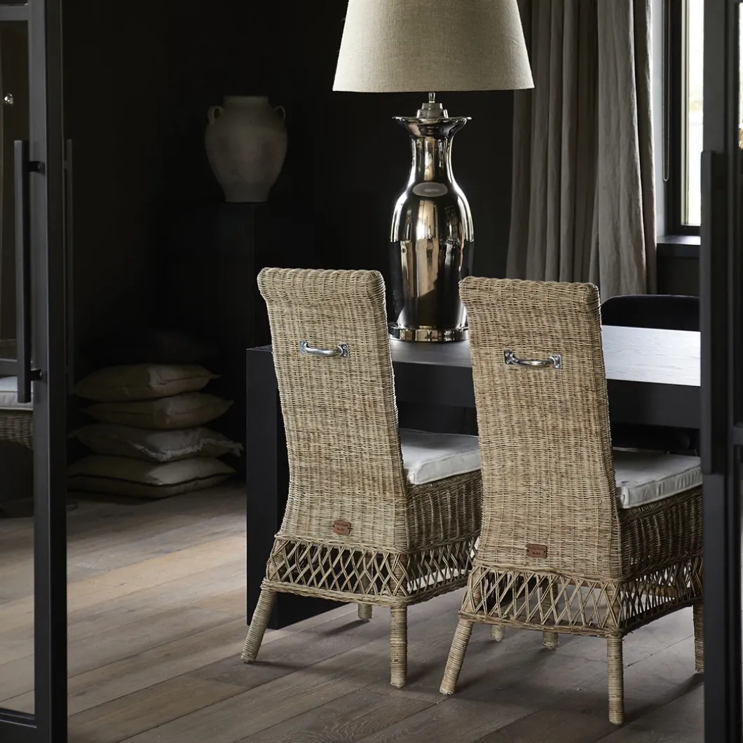 Een handgevlochten dinerstoel gemaakt van natuurlijk materiaal, de natuurlijke bruine kleur wordt gecreëerd door een natuurlijk proces hierdoor kan kleur per levering licht verschillen waardoor ieder meubel uniek is. Het zitkussen is gemaakt van 100% katoen.