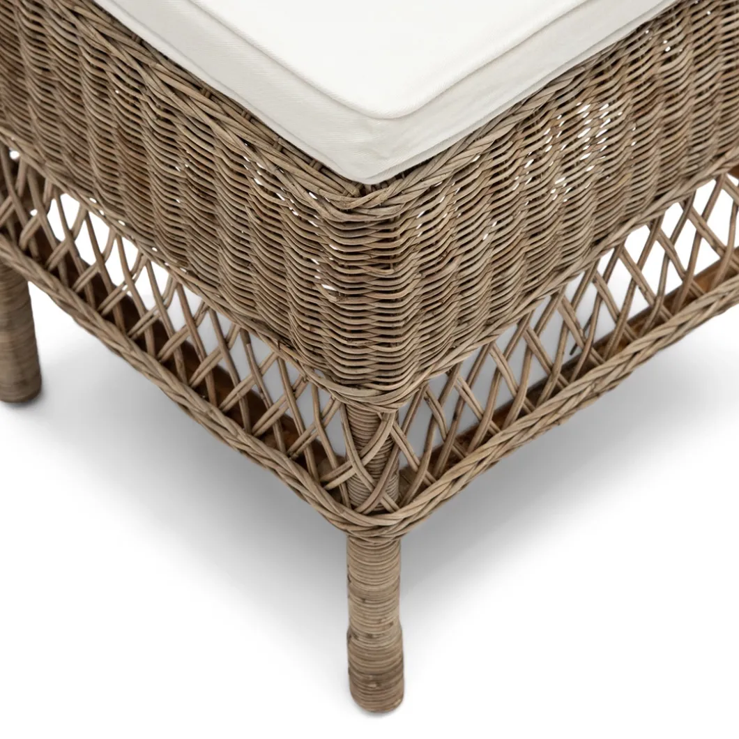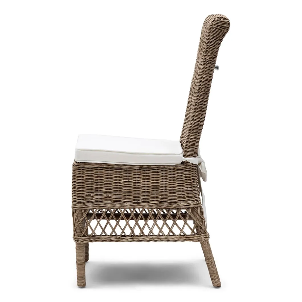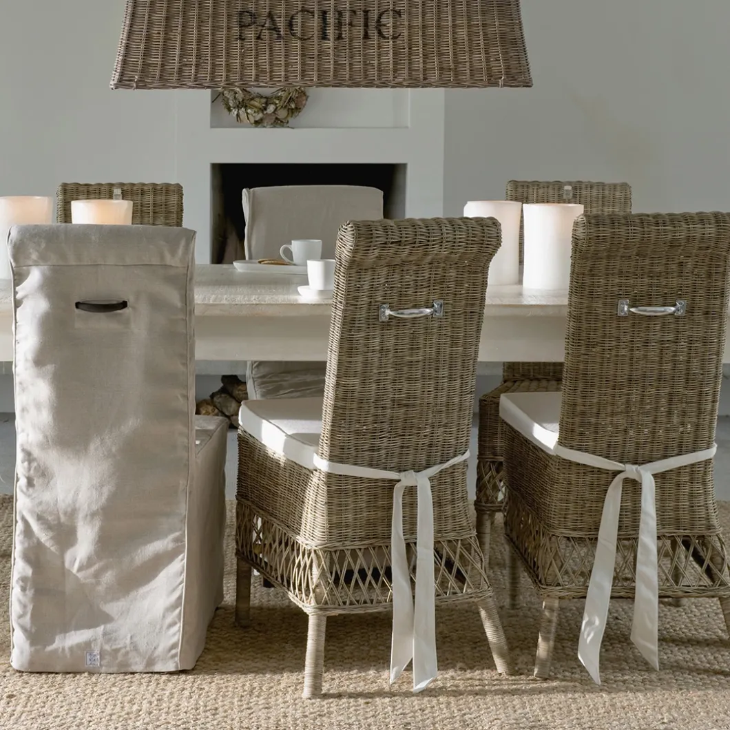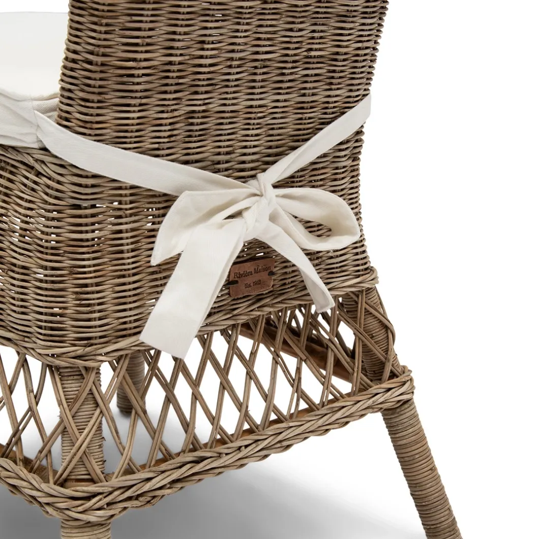 Een handgevlochten dinerstoel gemaakt van natuurlijk materiaal, de natuurlijke bruine kleur wordt gecreëerd door een natuurlijk proces hierdoor kan kleur per levering licht verschillen waardoor ieder meubel uniek is. Het zitkussen is gemaakt van 100% katoen.