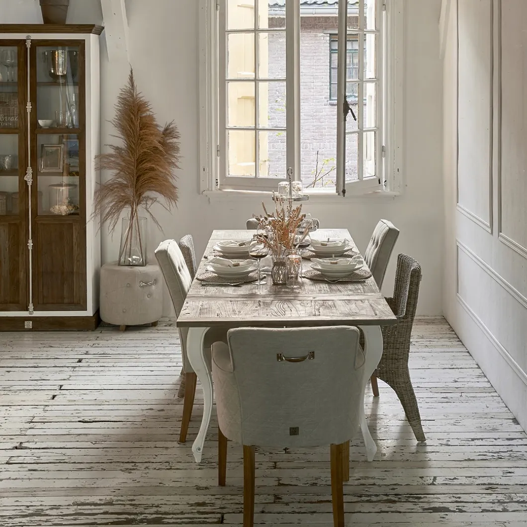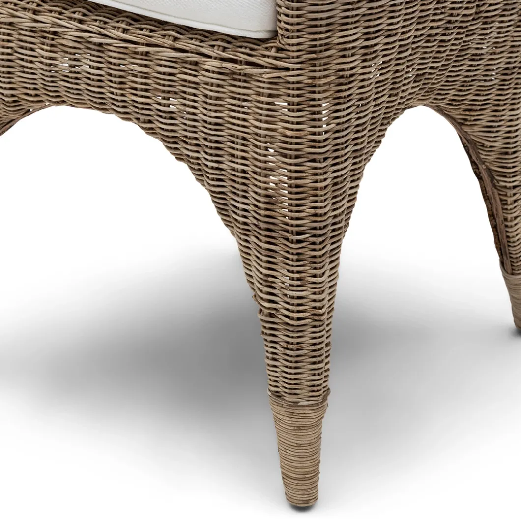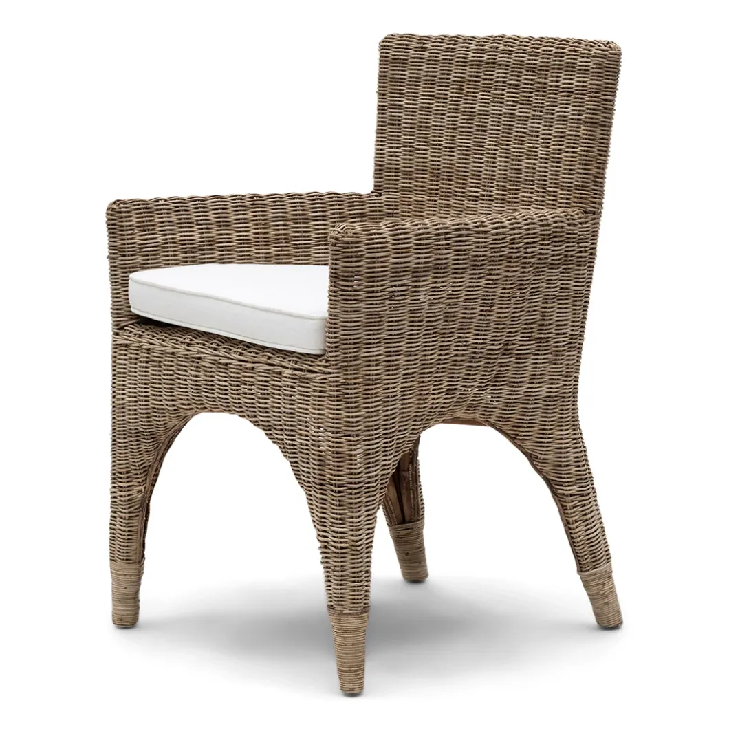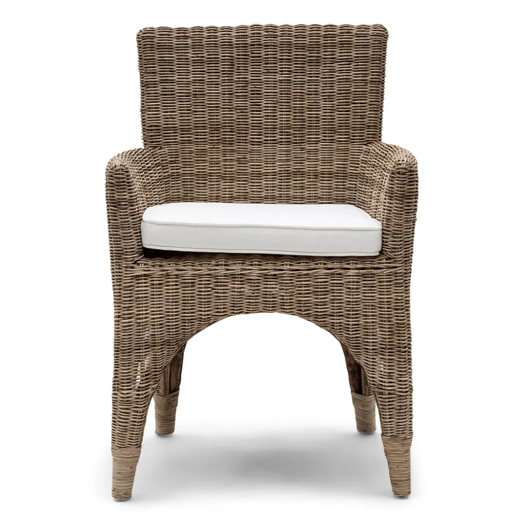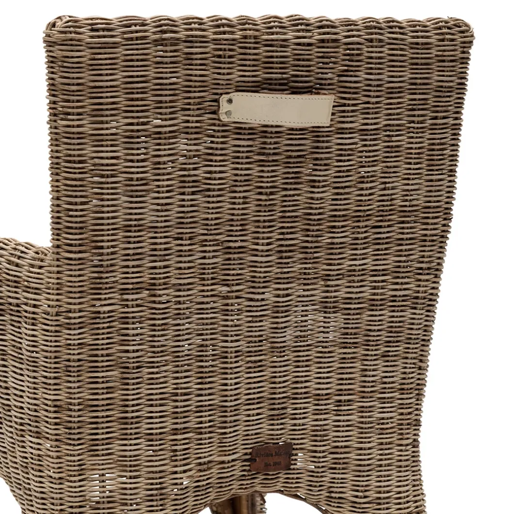Eetkamerstoel, gemaakt van Rustic Rattan. Aan de achterkant van de stoelleuning is een off white leren handvat bevestigd. Rustic Rattan is een natuurproduct dat door een natuurlijk procedé wordt gekleurd. Ieder product is hierdoor uniek. Ook verkrijgbaar in wit.