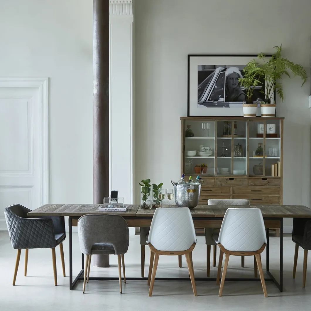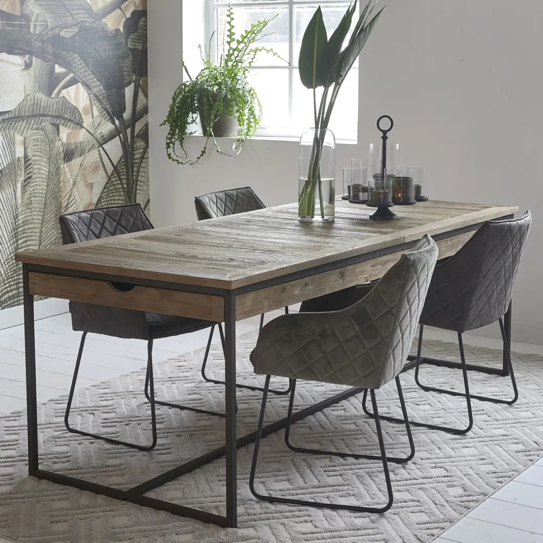 Deze stoere eettafel heeft een robuust tafelblad van gerecycled iepenhout en sparrenhout. Het ijzeren frame geeft de tafel een industrieel karakter. Deze uitschuifbare dinertafel heeft een standaard lengte van 220 centimeter en een lengte van 300 centimeter wanneer de tafel volledig uitgeschoven is, perfect wanneer u een groot gezelschap voor diner krijgt. De lades aan de zijkant bieden ruimte voor tafelaccessoires als placemats, onderzetters en eventueel tafellinnen.