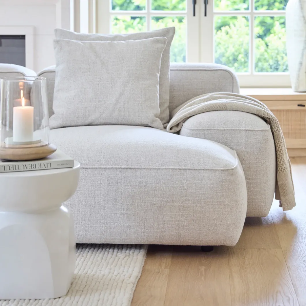 - De chaise longue module voor de Hamilton modulaire bank biedt ultiem loungecomfort en sluit perfect aan aan de rechterzijde. Bekleed met rijke, gemêleerde stof in de kleur Antique White, voegt deze module een luxe uitstraling toe aan je zithoek. Ideaal voor ontspannen momenten en het creëren van een stijlvolle, comfortabele ruimte in jouw woonkamer.