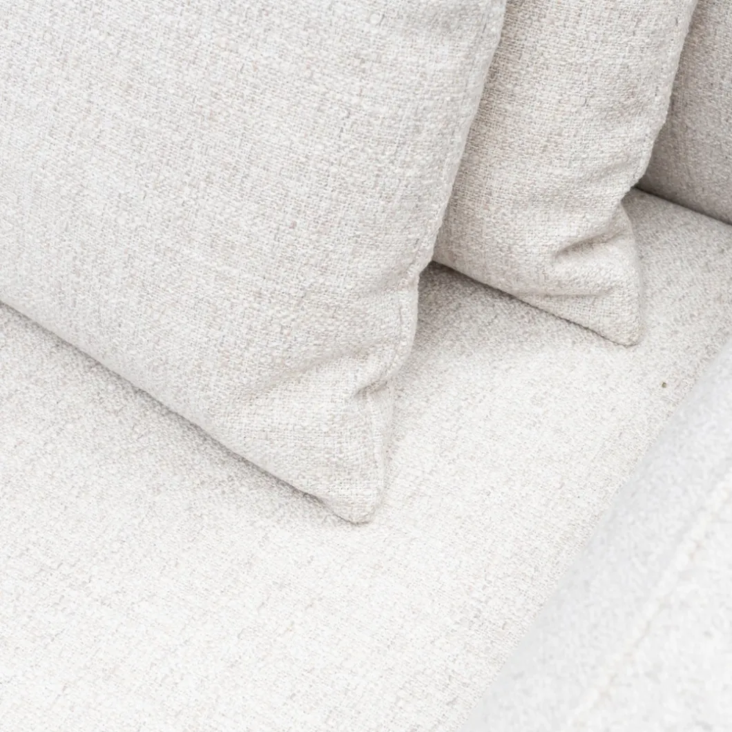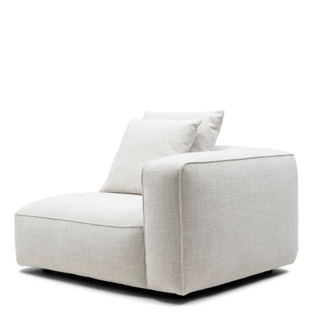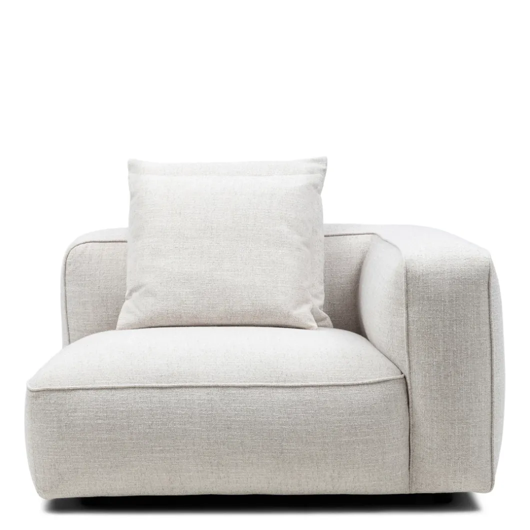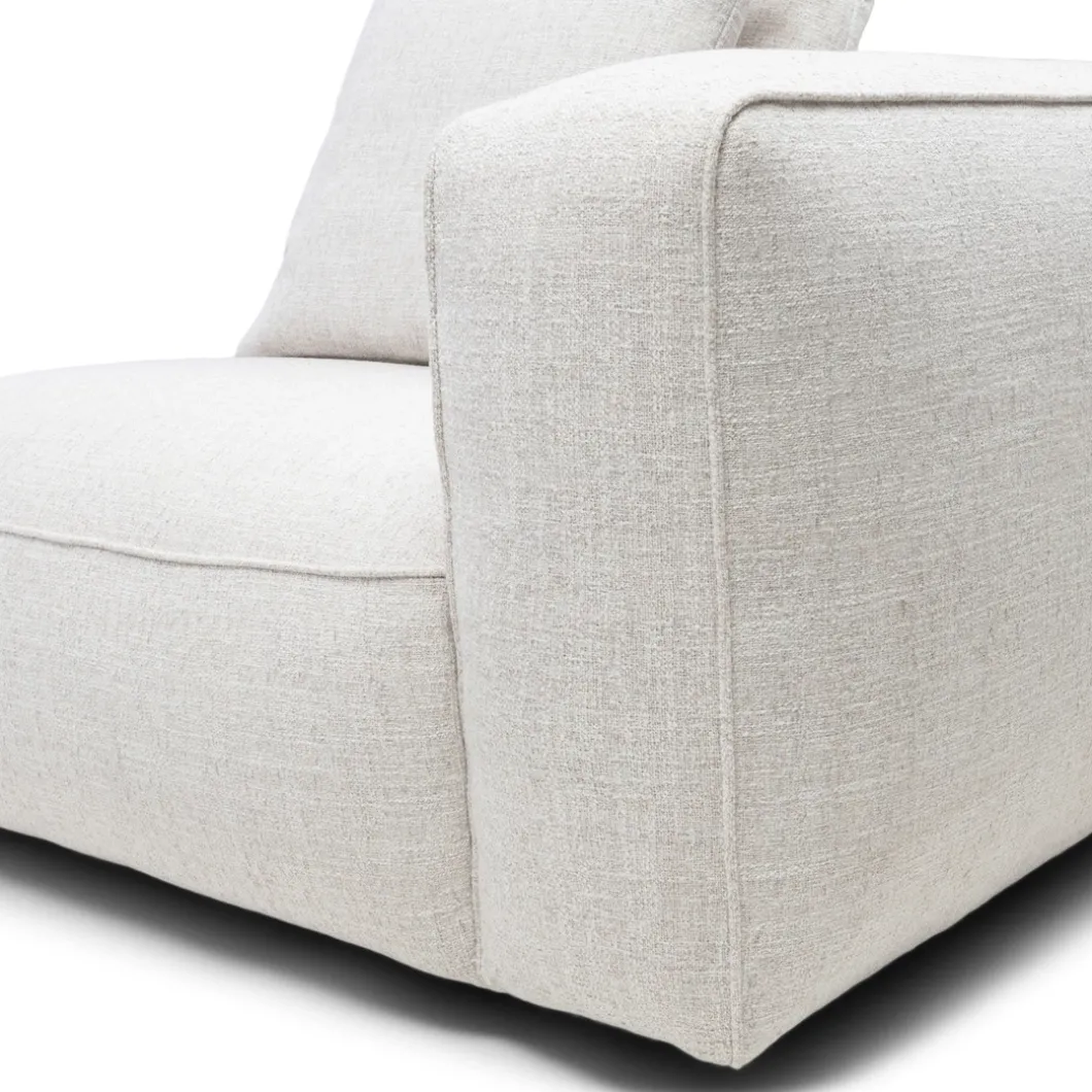 - De rechterhoekmodule van de Hamilton modulaire bank, in de kleur Antique White, biedt een diepe zit en elegante armleuning, bekleed met rijke, wit gemêleerde stof. Deze module met armleuning vormt een stijlvolle hoek in je zithoek en wordt geleverd met een bijpassend rugkussen voor extra comfort. Ideaal om een gezellige en luxe zithoek te creëren.
