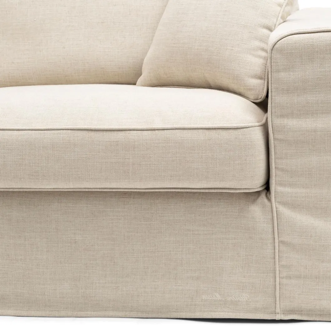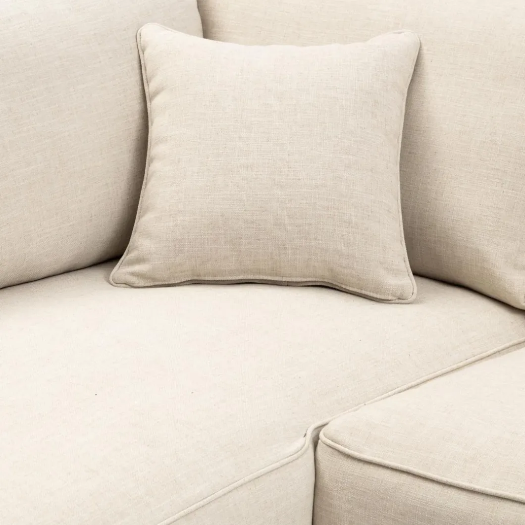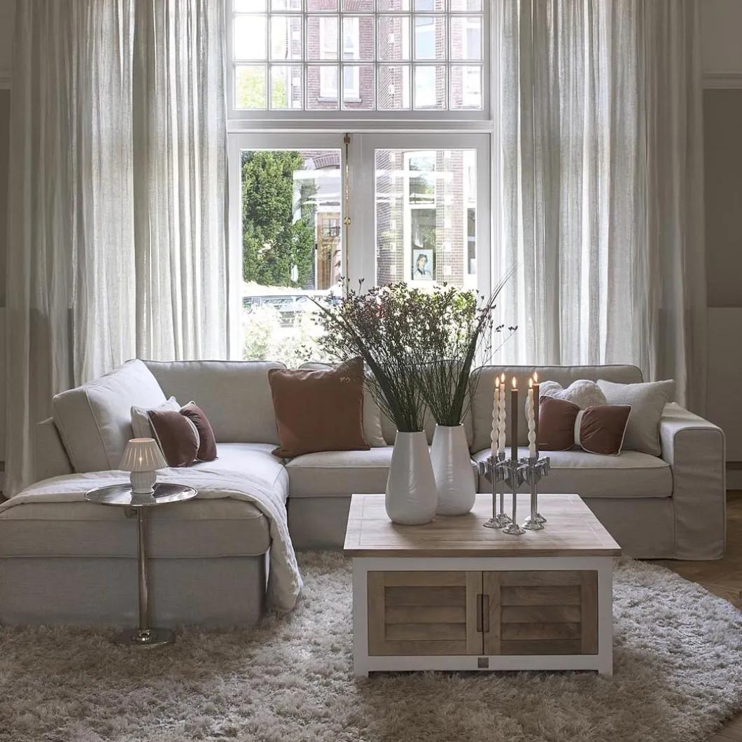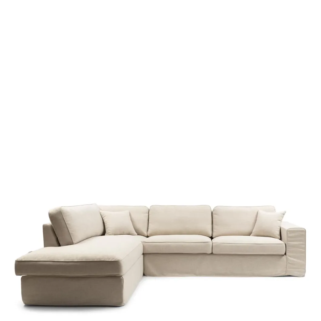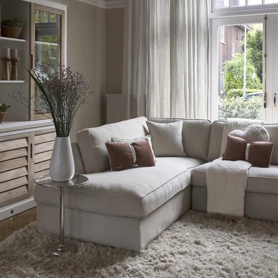 Een hoekbank met een plek om languit te zitten. Heerlijk relaxen op deze hoekbank met verwisselbare overtrekken voor de zitkussens. De zitkussens hebben gestikte randen als afwerking. De bank heeft ook een los kussen voor het comfort.