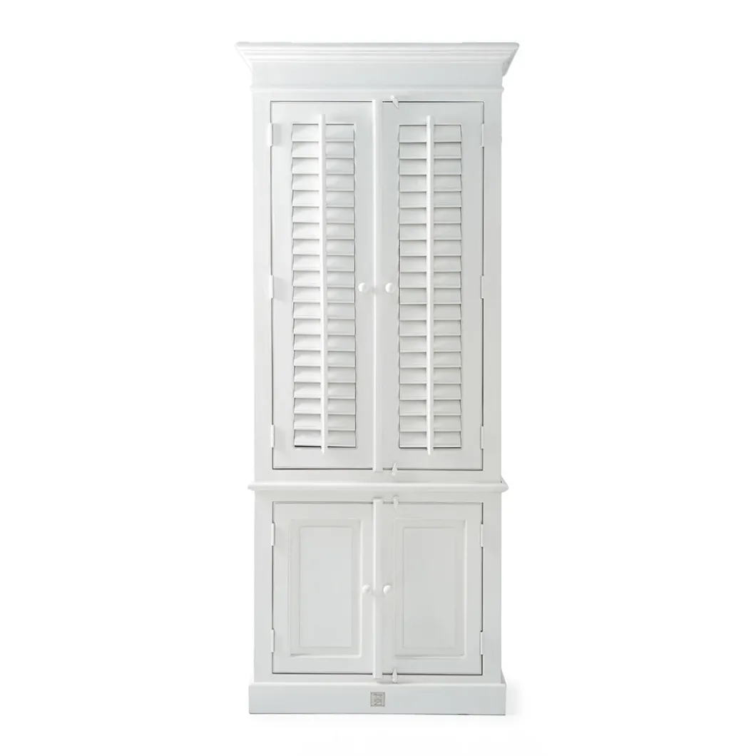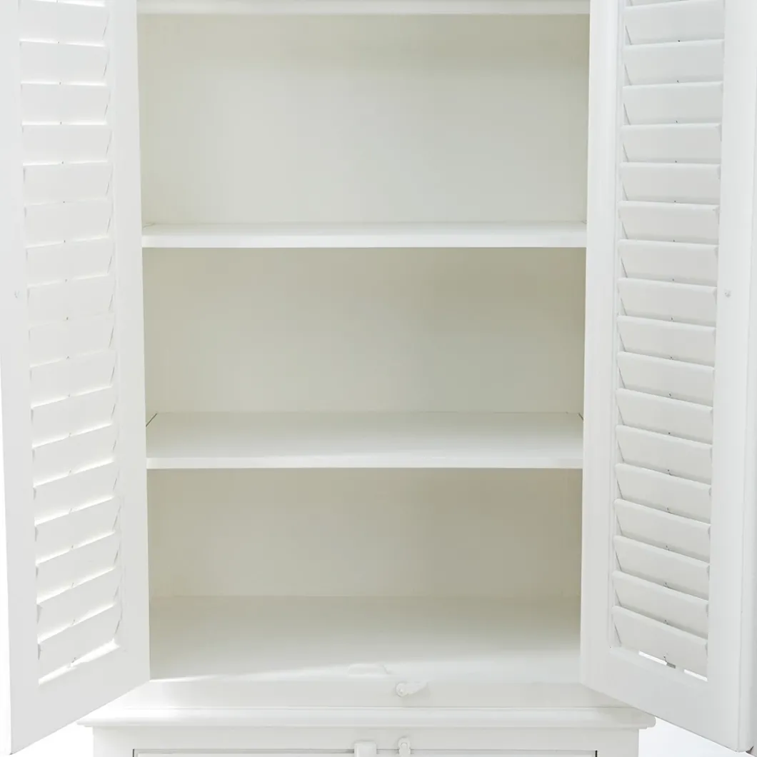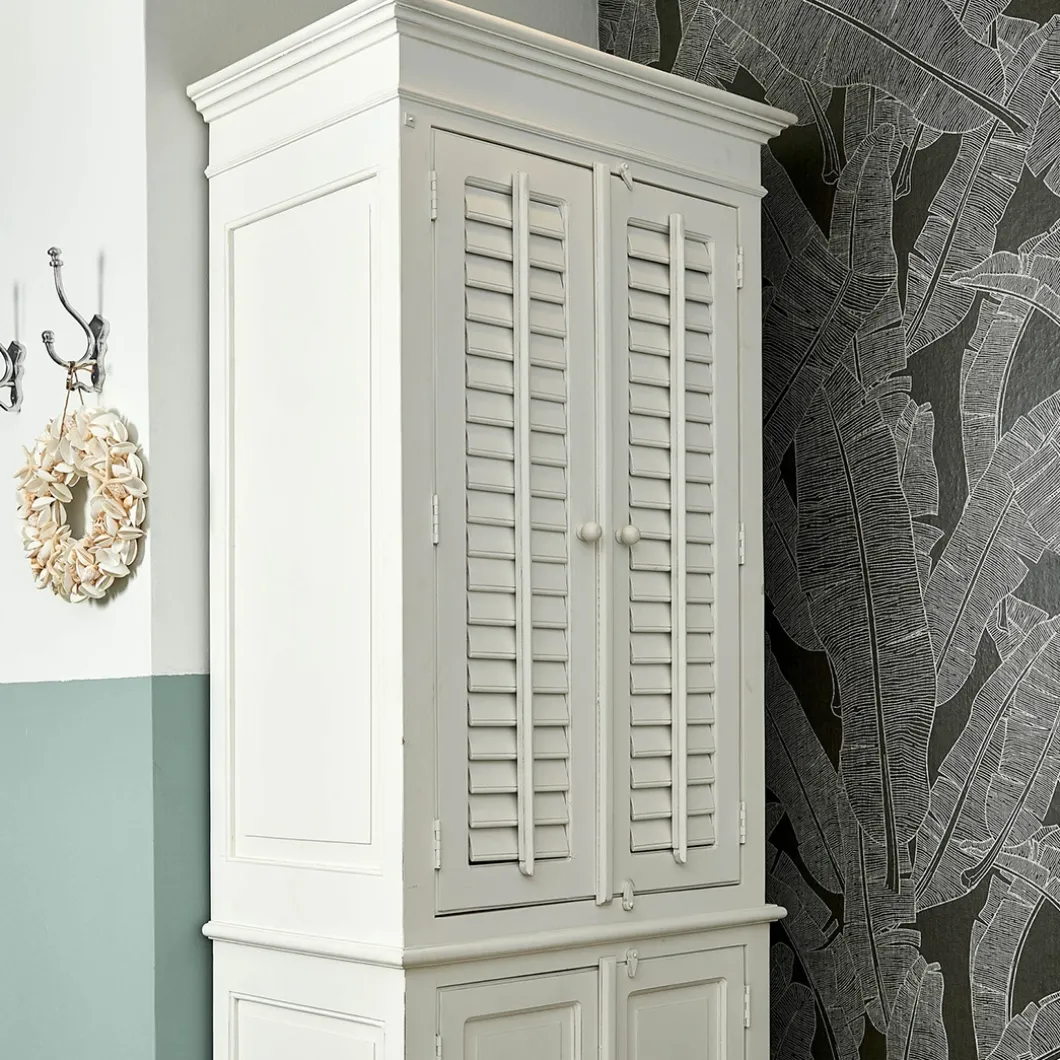 New Orleans is de grootste stad van de Amerikaanse staat Louisiana. De stad ligt aan de oevers van de rivier de Mississippi. Deze fris witte garderobekast van acaciahout is een mooie, ruime kast met beweegbare shutters. De bovenste helft biedt één vaste plank, een roede en twee verplaatsbare planken, en achter de onderste deuren bevinden zich nog drie planken.