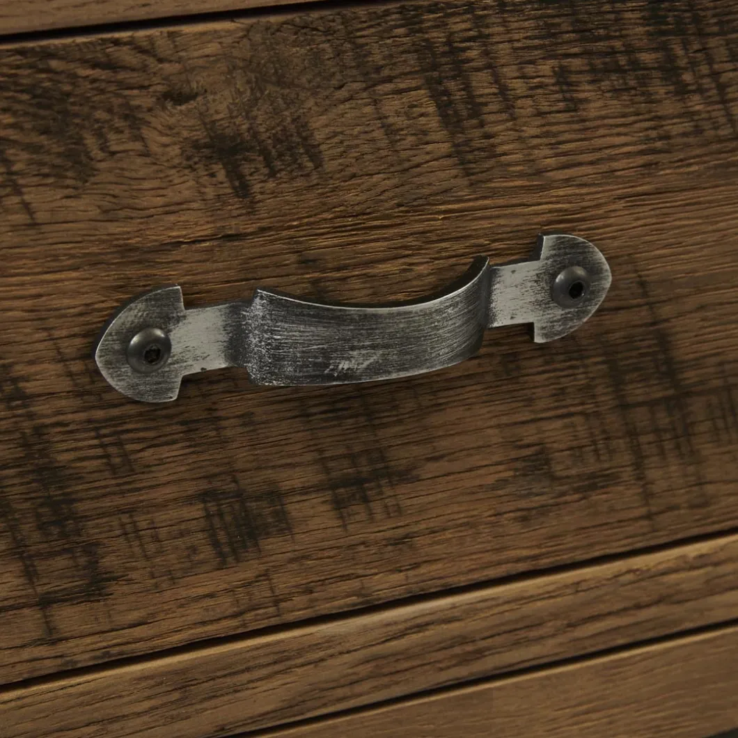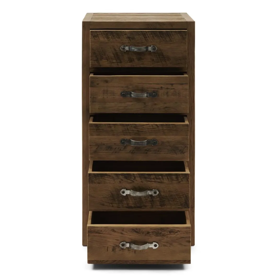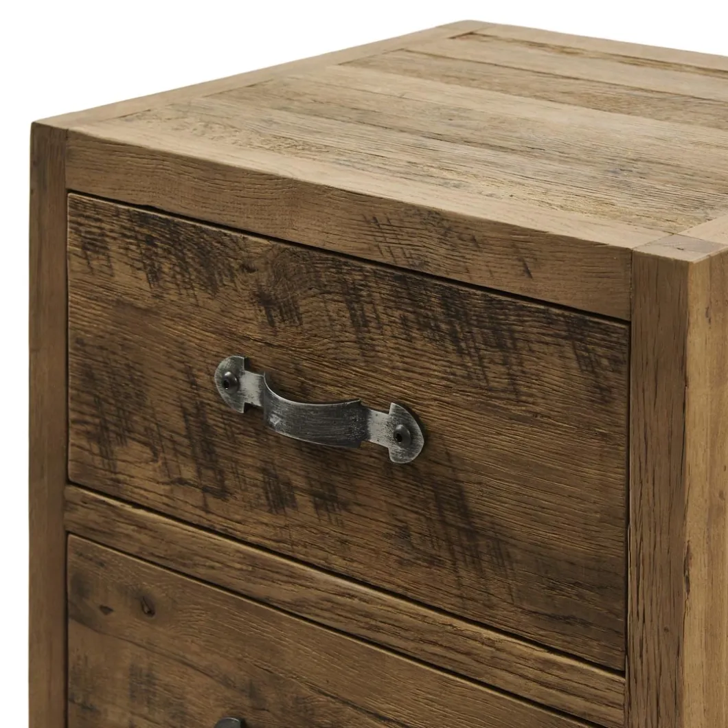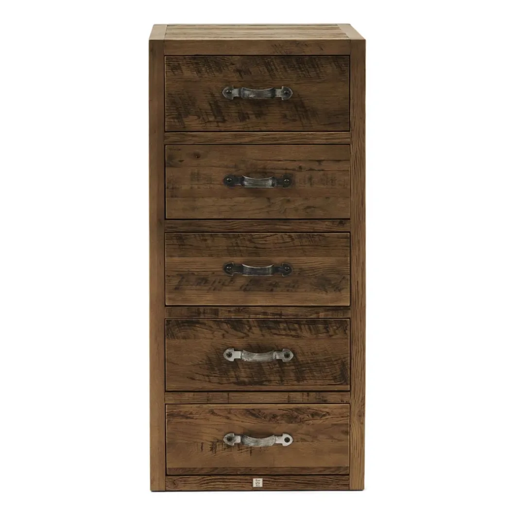 Deze hoge ladekast met maar liefst vijf grote lades is gemaakt van prachtig doorleefd eikenhout. Dat geeft de kast een stoere, natuurlijke uitstraling. De handgrepen hebben een klassieke gebogen vorm, maar zijn gemaakt van geborsteld rvs. Verkrijgbaar in verschillende formaten.