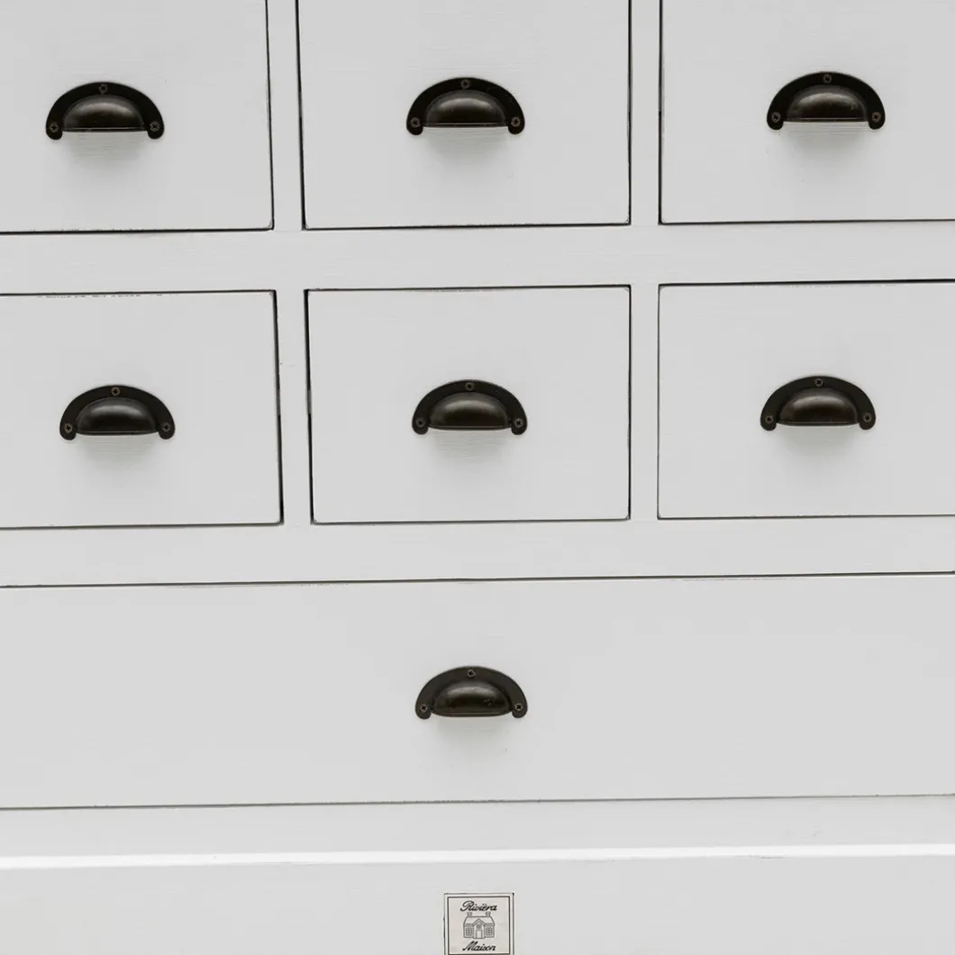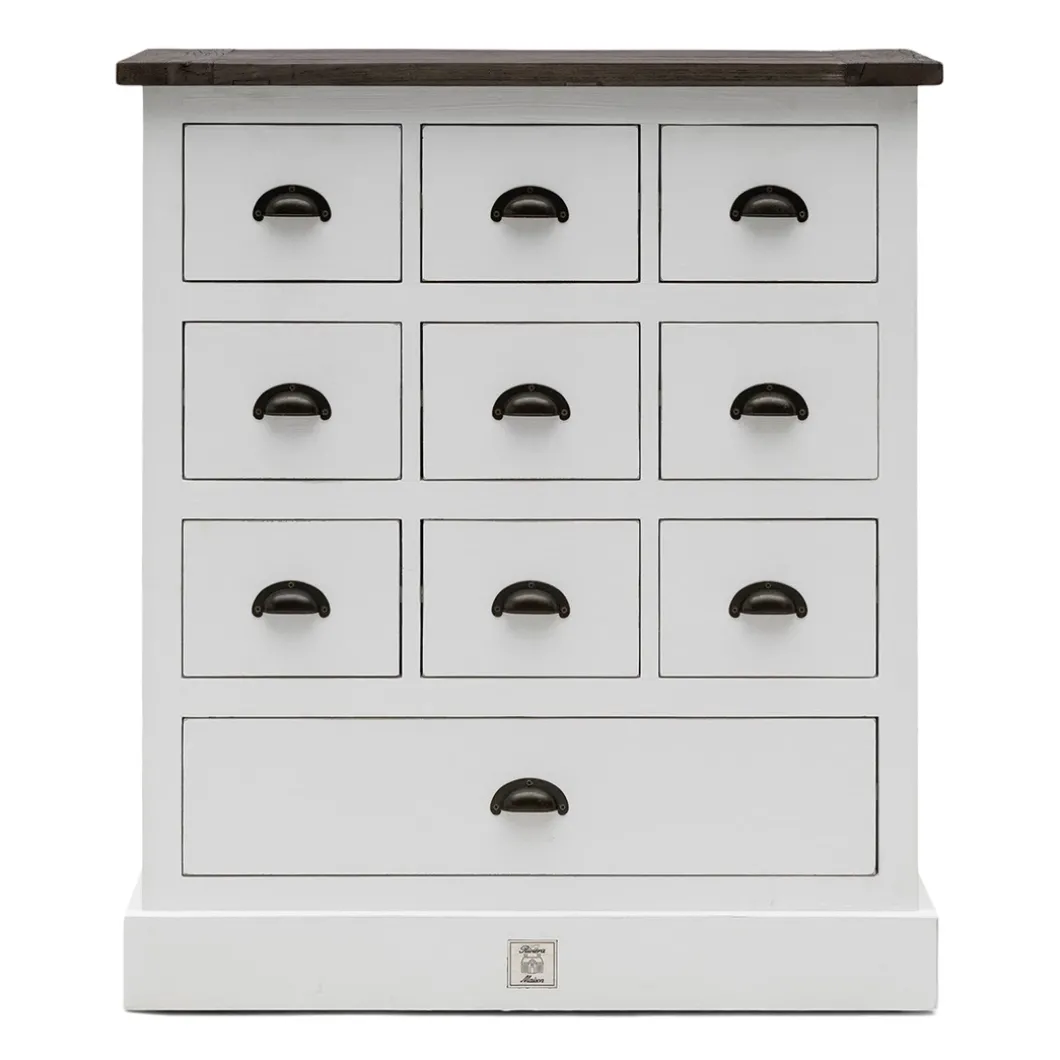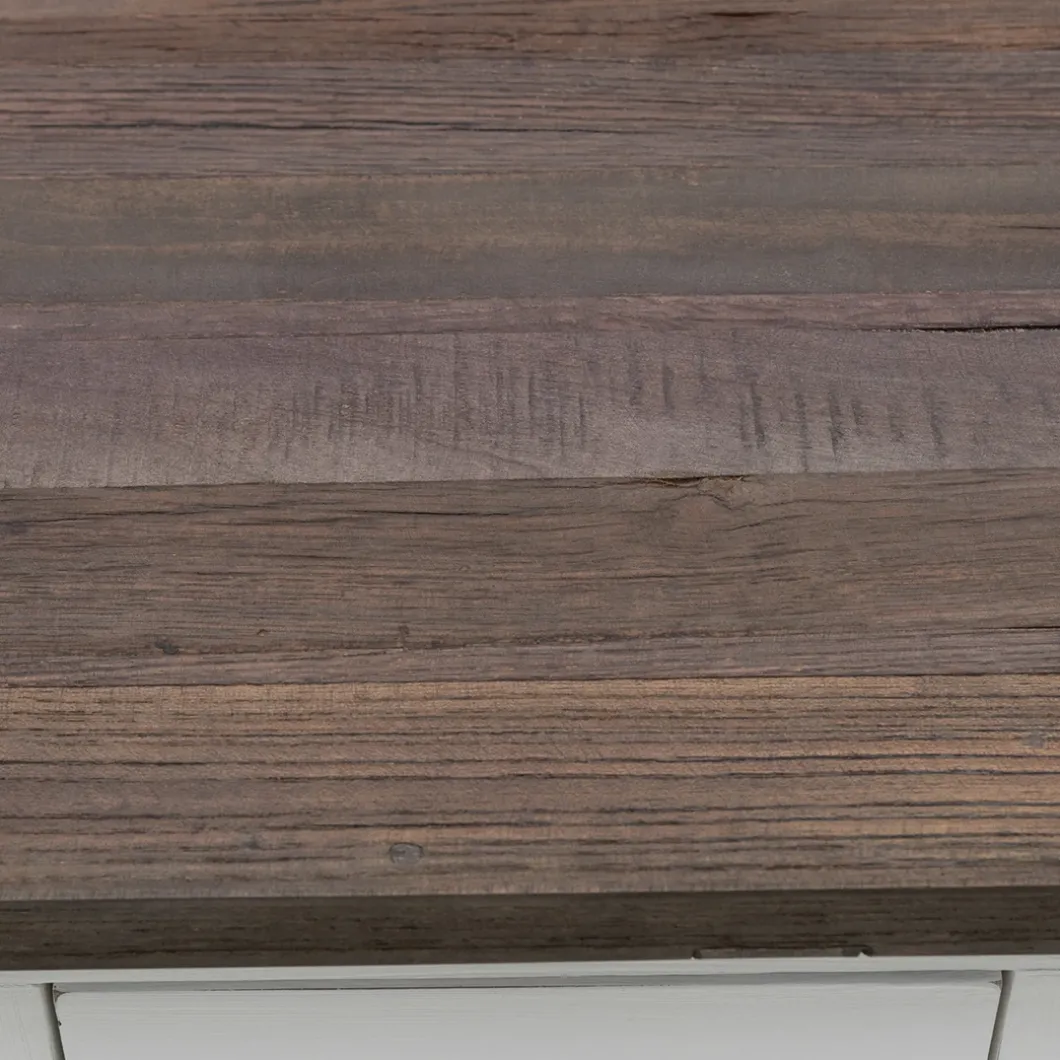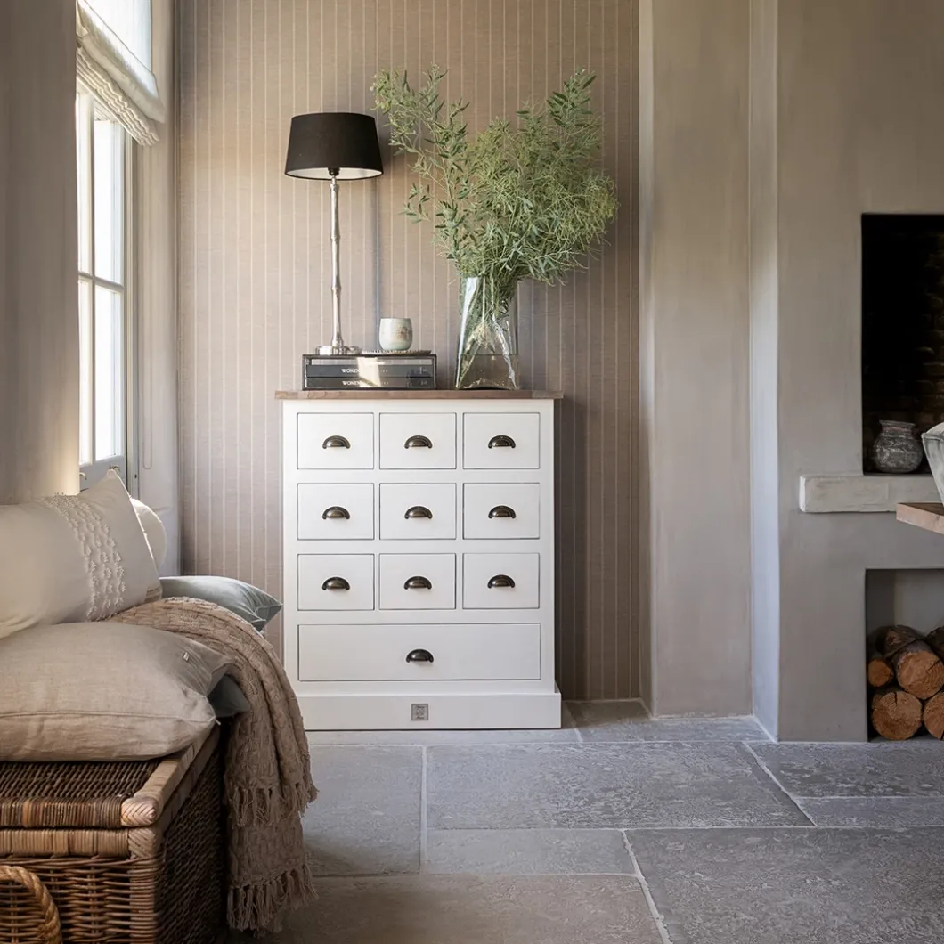 Een kast als het Newport Drawer Cabinet met veel lades is ideaal om van alles en nog wat in op te bergen. Een mooie combinatie van strak, wit populierenhout en een karakteristiek blad van oude schuurdeuren.