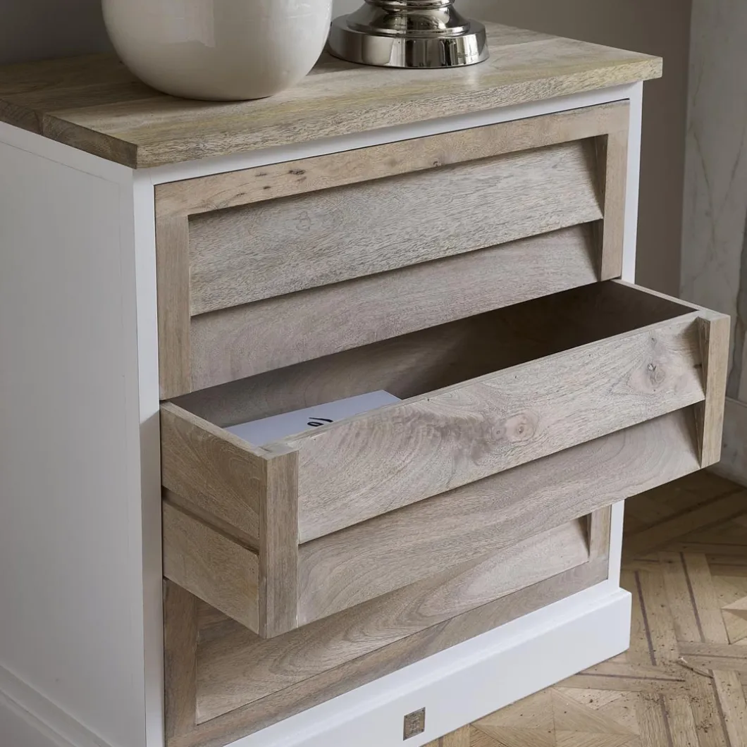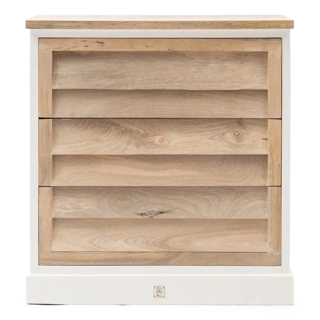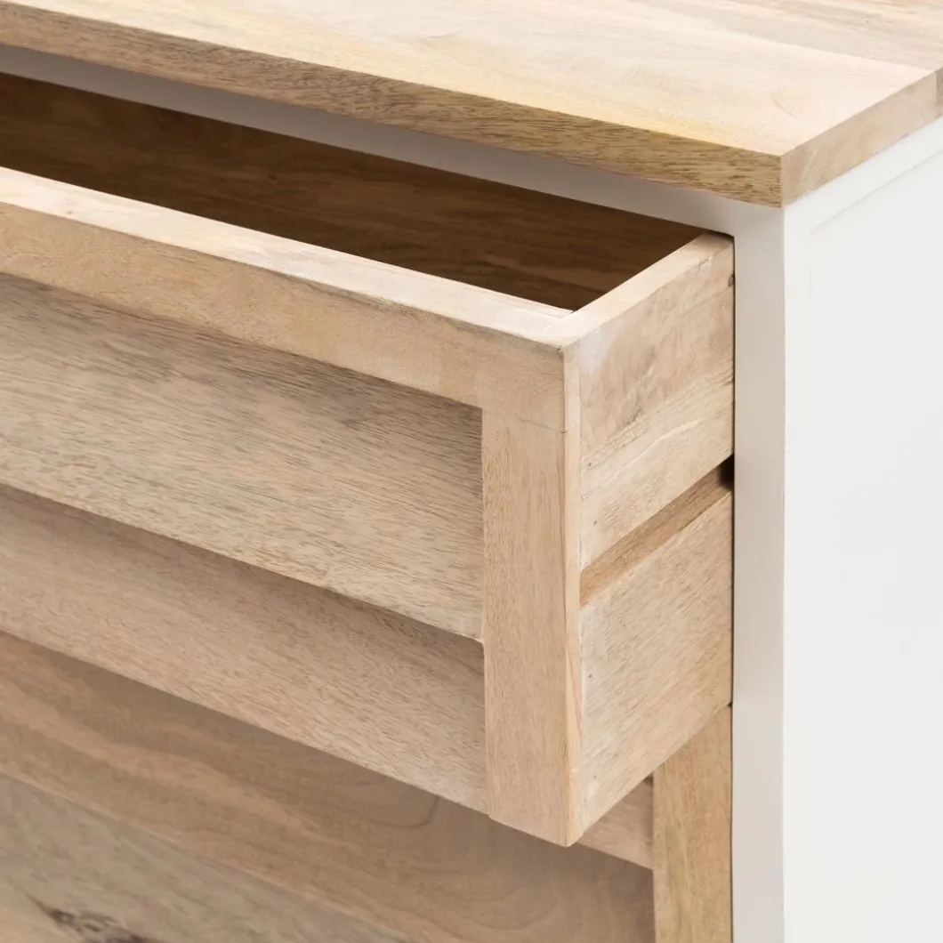 Wist je dat mangohout niet alleen te gebruiken is voor accessoires, maar dat je er ook de mooiste meubels van maakt? Zoals deze grote ladenkast Pacifica, die volledig van mangohout is gemaakt. Het frame van de kast is wit geverfd, terwijl de lades en bovenkant naturel van kleur zijn en een opvallende shutter structuur hebben. Verkrijgbaar in verschillende uitvoeringen.
