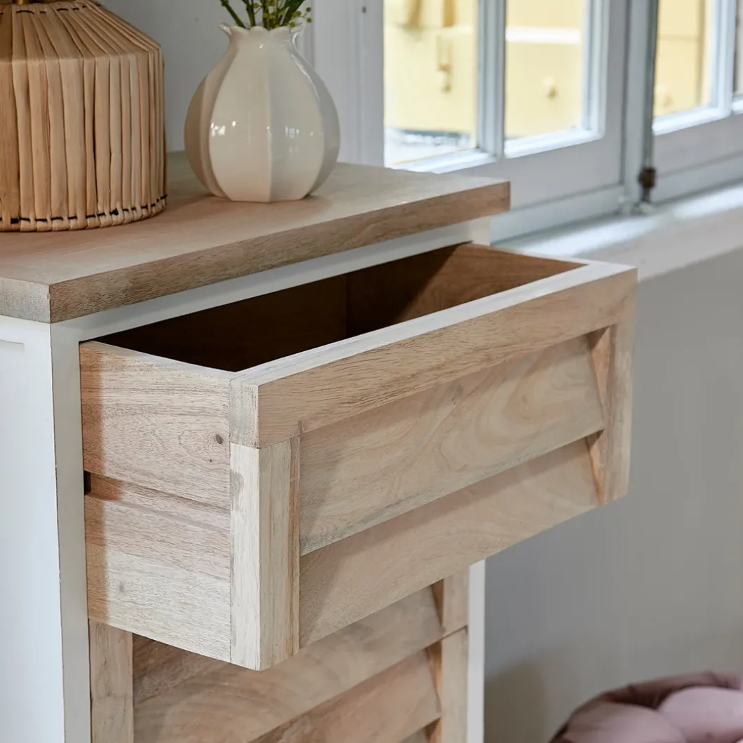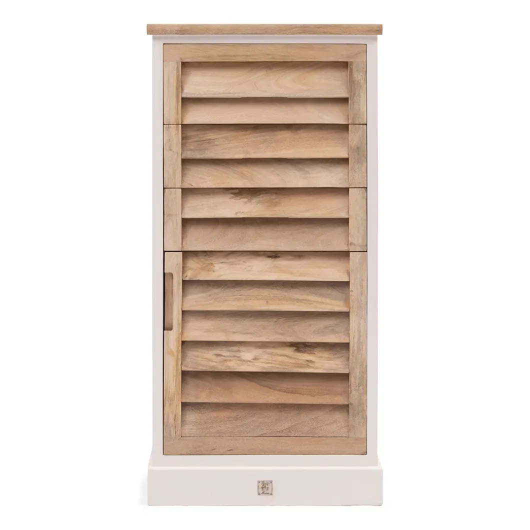 Dit is een ladekast met drie lades en een deur, zo is het een handig meubel in de slaapkamer voor bijvoorbeeld kledingstukken. Deze ladekast behoort tot de Pacifica-serie. Een opvallende lijn met meubels met ‘shutter-look’ van naturel en wit mangohout, met onzichtbare handgreep en softclose-mechanisme. In deze serie zijn verschillende meubels verkrijgbaar.