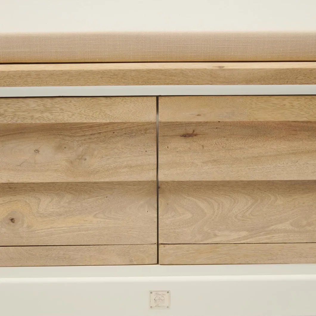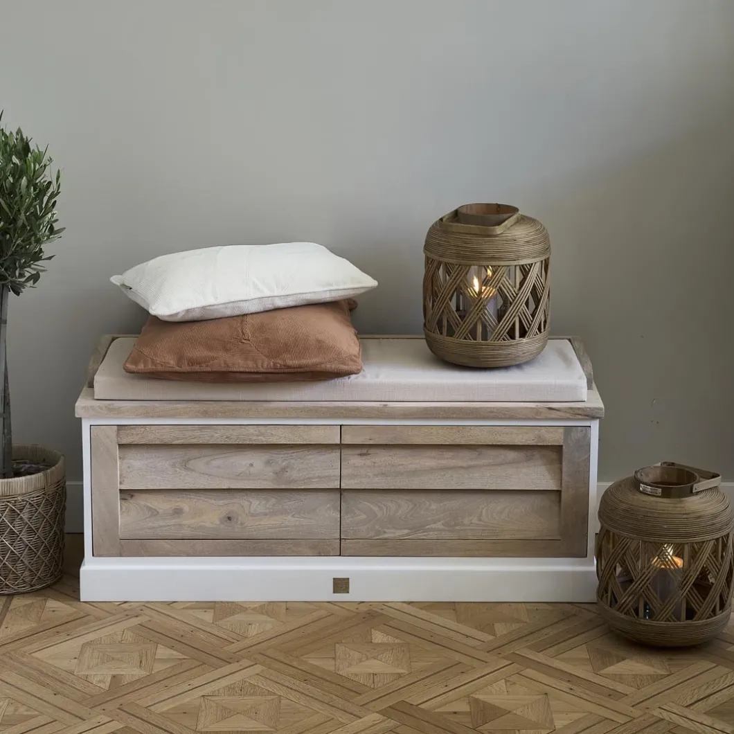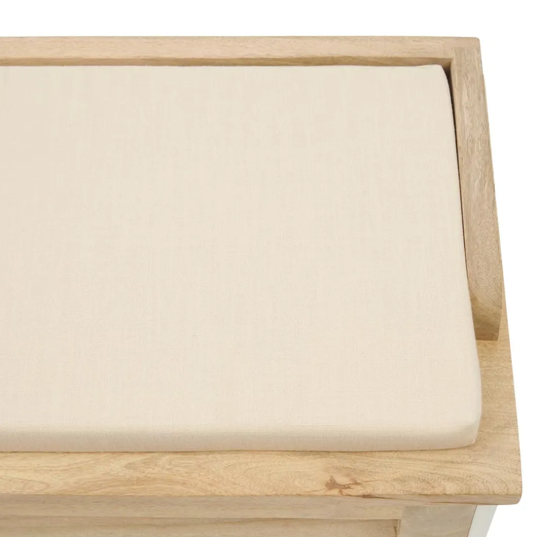 Een multifunctioneel bankje handgemaakt van duurzaam mangohout. De mangoboom wordt pas gekapt als hij helemaal geen vruchten meer produceert. Zo krijgt de boom een tweede leven in onder meer de meubelbranche. De bekleding van dit bankje is van katoen. Het bankje heeft opbergruimte.